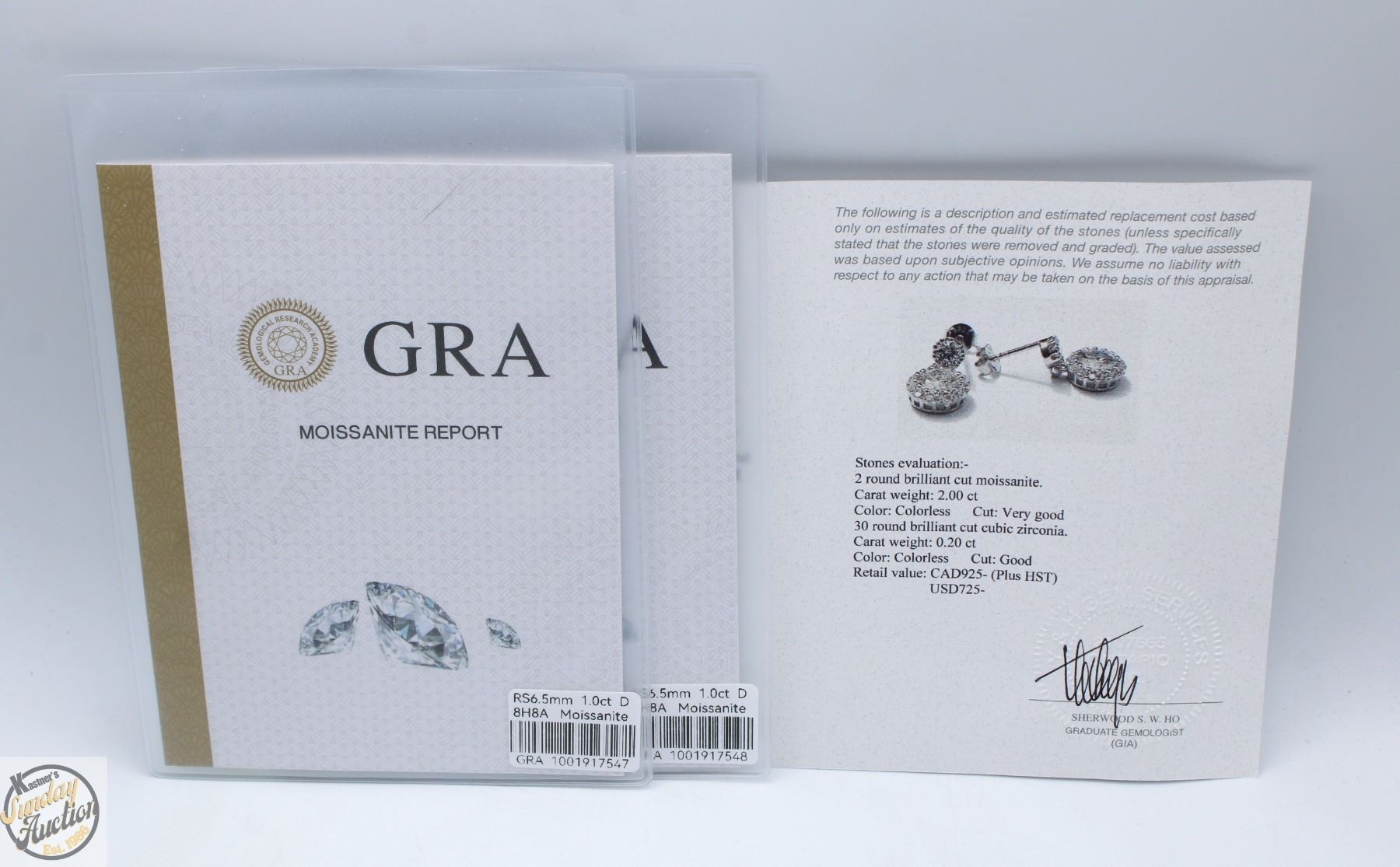 2.00 CARATS GRA CERTIFIED ROUND BRILLIANT CUT EARRINGS, WITH 30 ROUND CUT CUBIC ZIRCONIA, SET IN 925 STERLING SILVER - APPRAISE REPLACEMENT VALUE CAD 925