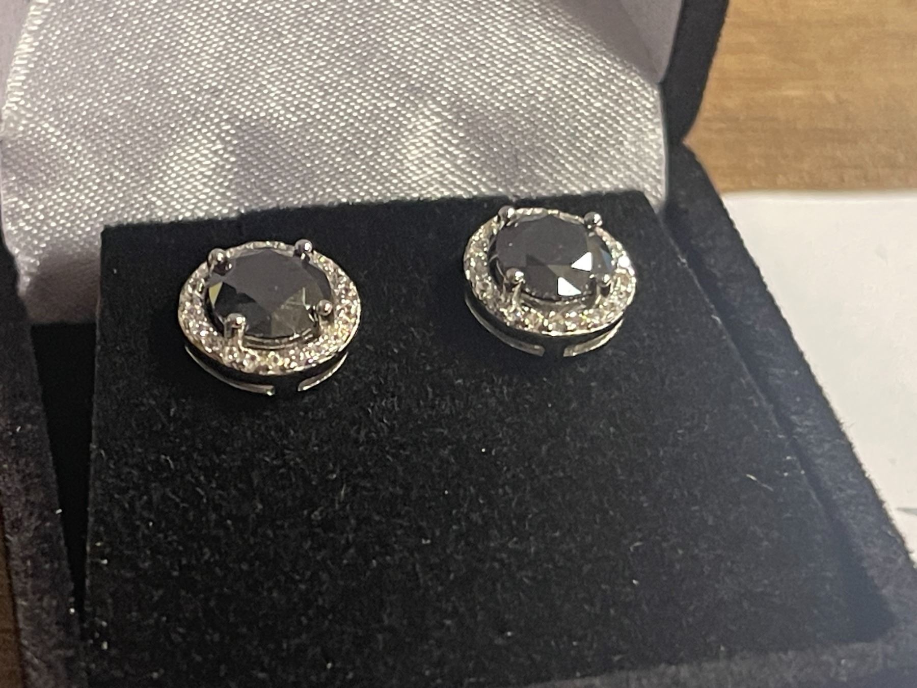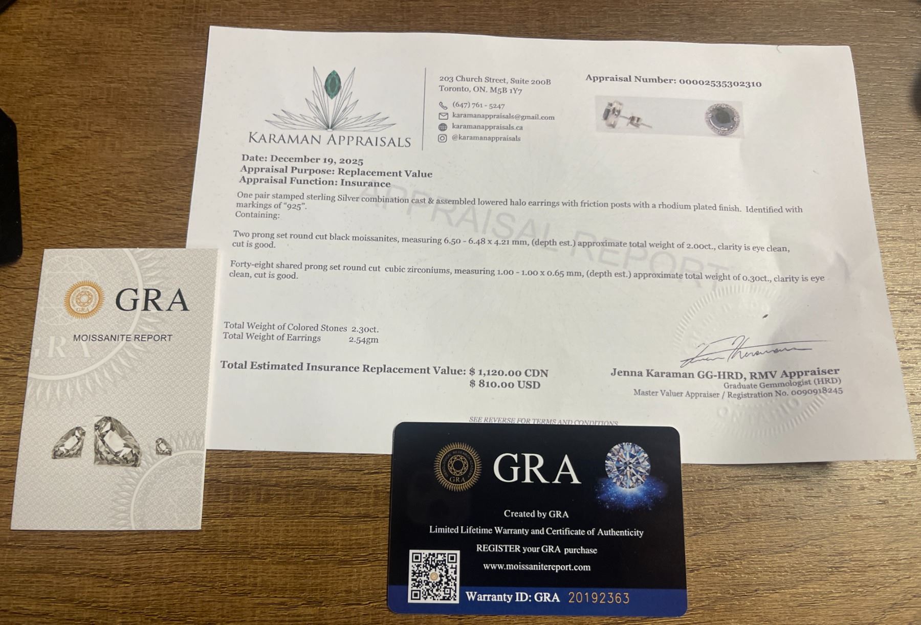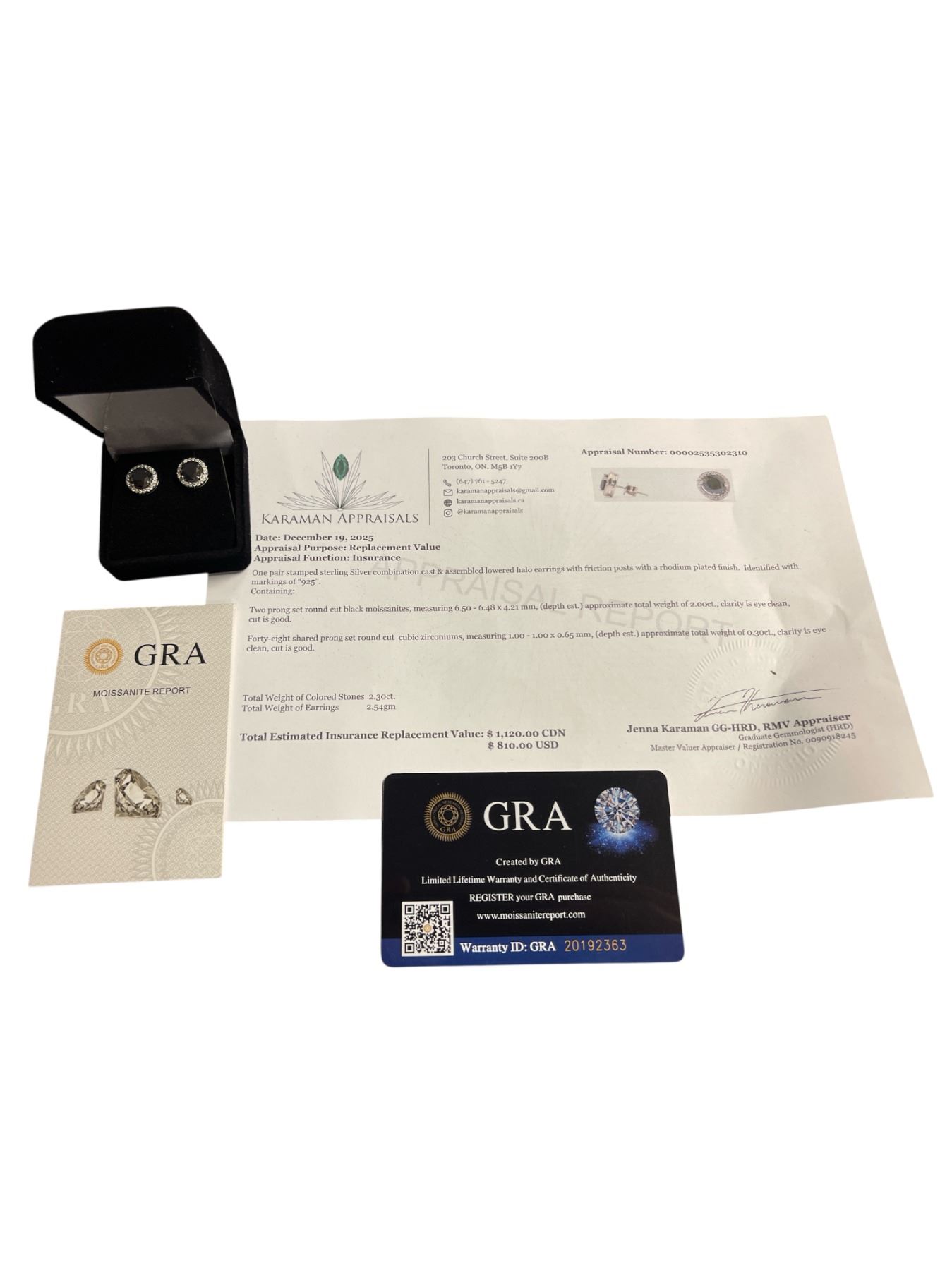 2.00 CT GRA CERTIFIED ROUND BRILLIANT CUT MOISSANITE STONE VVS BLACK COLOR WITH 48 ROUND BRILLIANT CUT CUBIC ZIRCONIA SET IN ROUND HALO SET IN 925 SILVER EARRINGS RETAIL VALUE $1,120.00