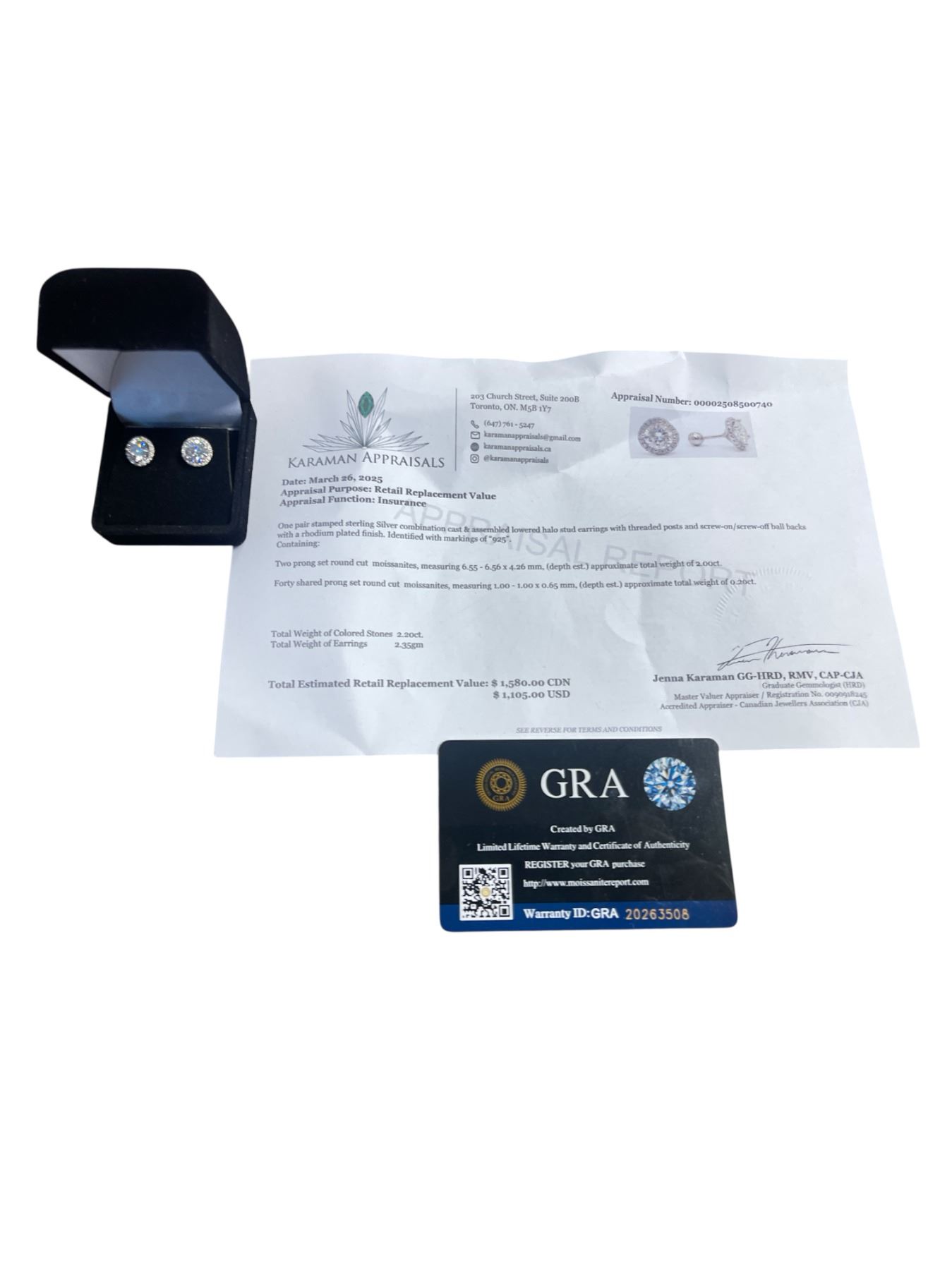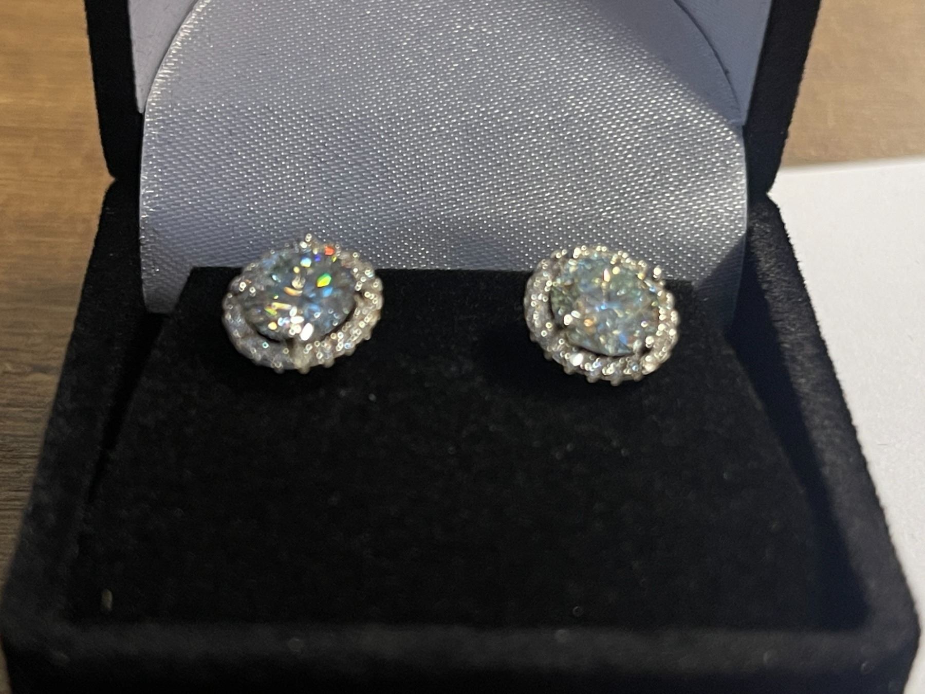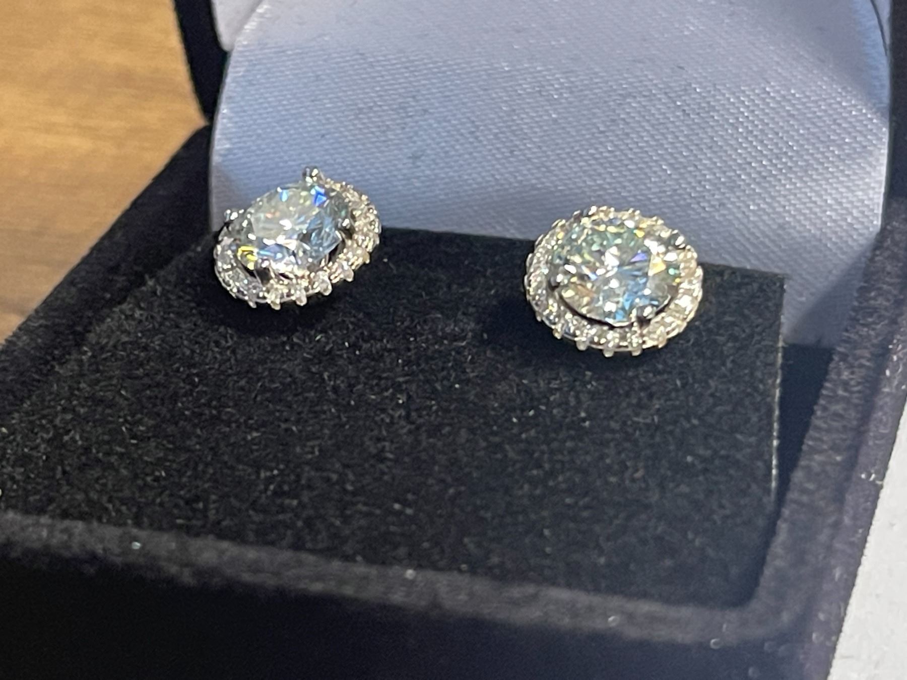 2.00 CT GRA CERTIFIED ROUND BRILLIANT CUT MOISSANITE STONE VVS BLUE COLOR WITH 40 ROUND BRILLIANT CUT CUBIC ZIRCONIA SET IN ROUND HALO SET IN 925 SILVER EARRINGS WITH SCREW BACKS RETAIL VALUE $1,580.00
