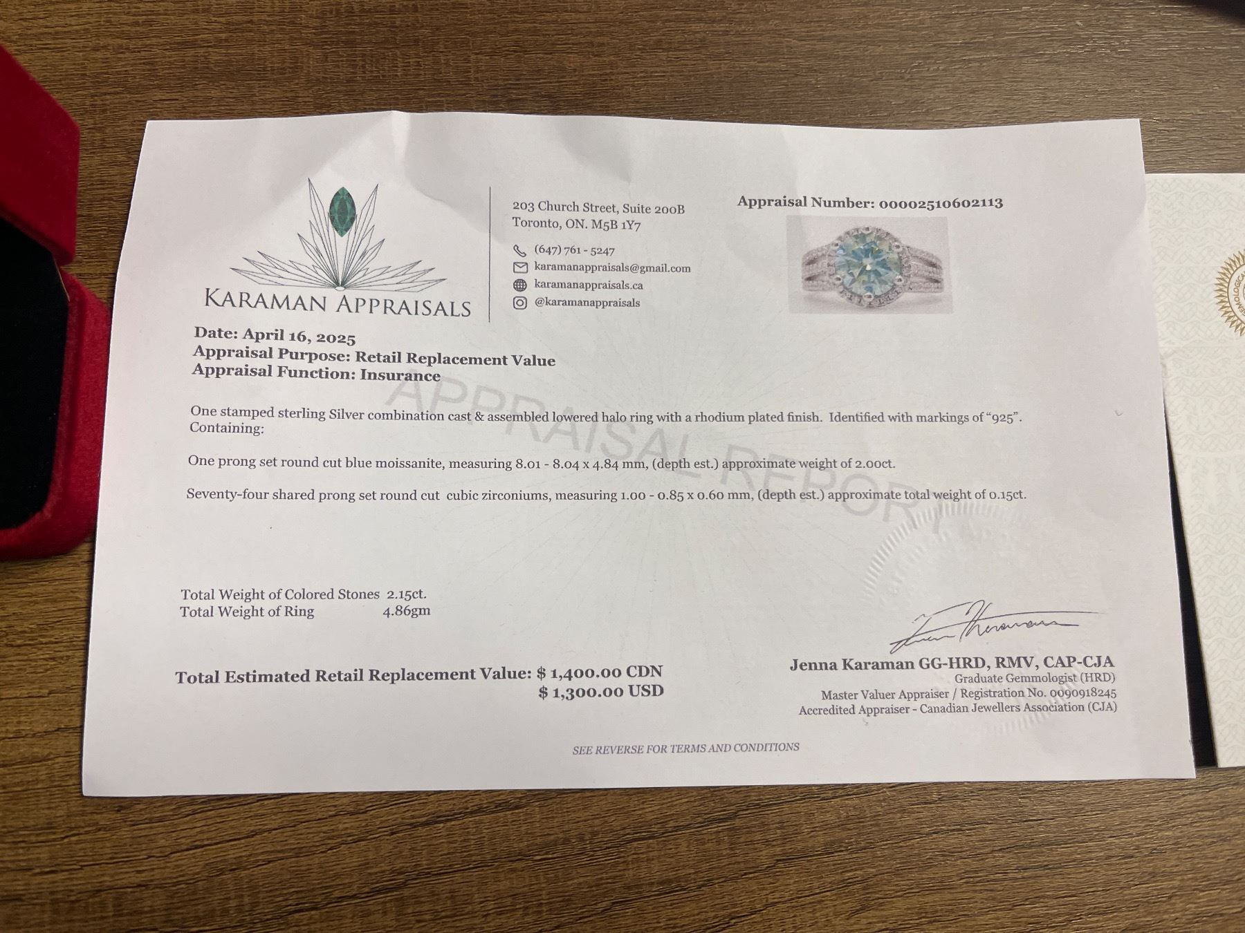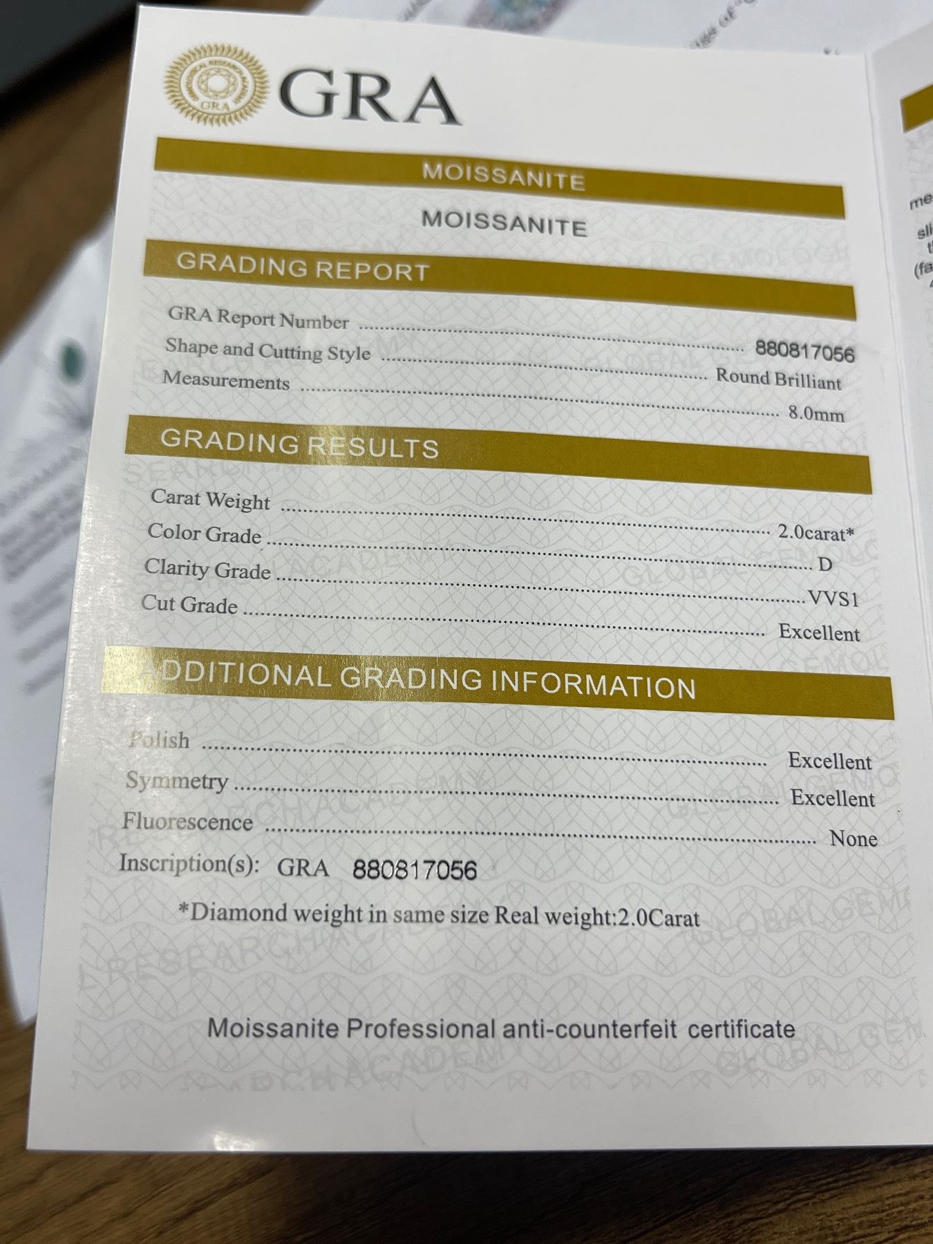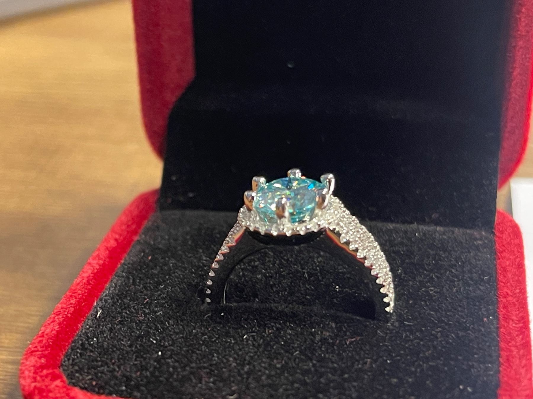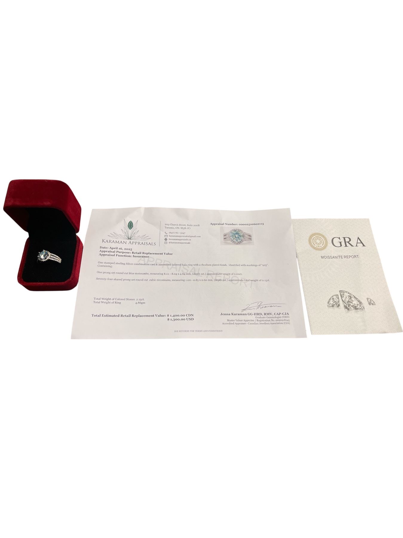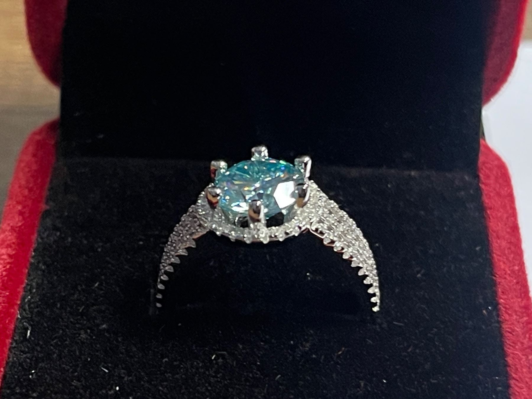 2.00 CT GRA CERTIFIED ROUND BRILLIANT CUT MOISSANITE STONE VVS BLUE COLOR WITH 74 ROUND BRILLIANT CUT CUBIC ZIRCONIA STONES SET IN ROUND HALO AND 3 ROWS IN SHANKS SET IN 925 SILVER RING SIZE 6 RETAIL VALUE $1,400.00