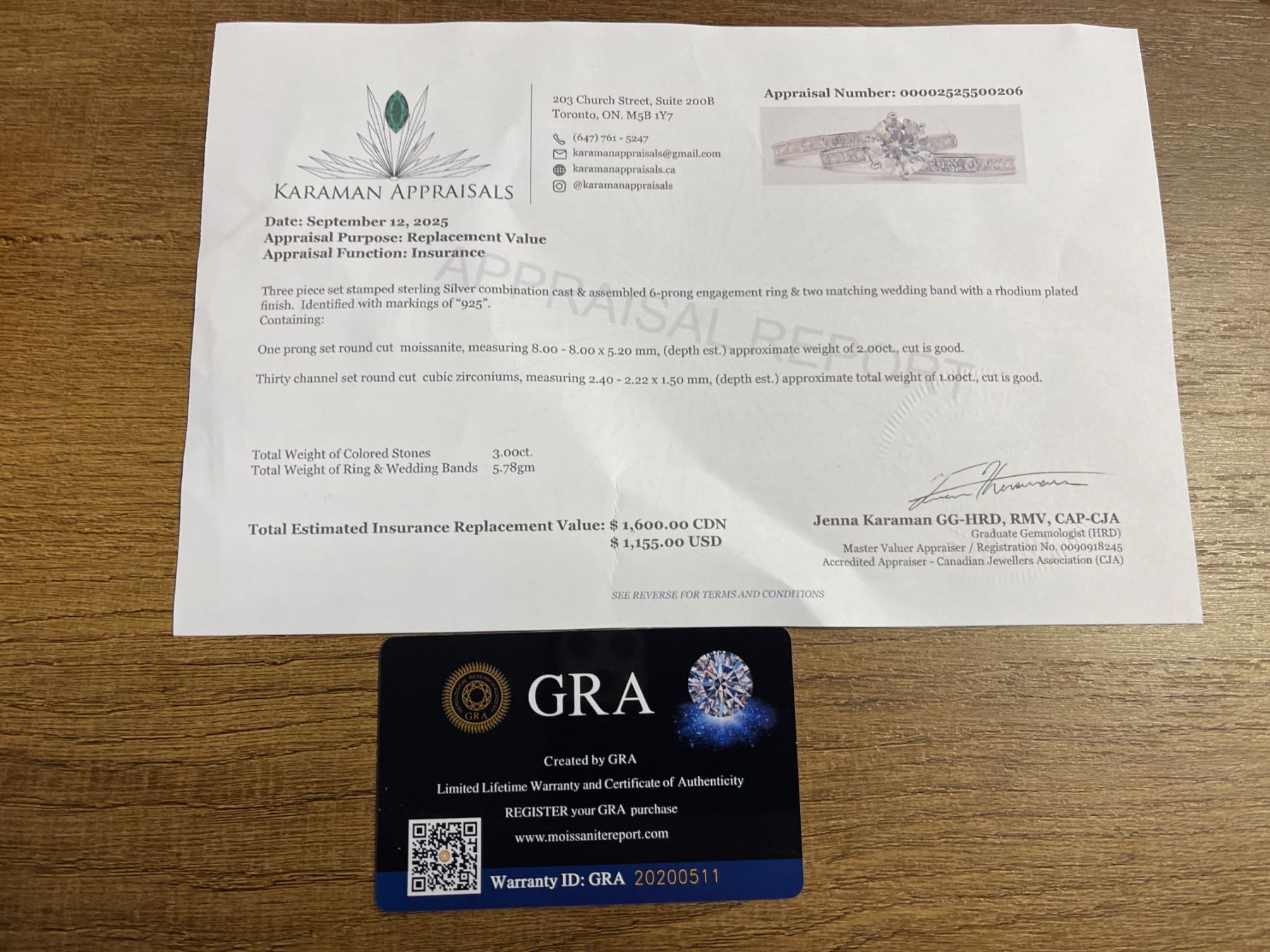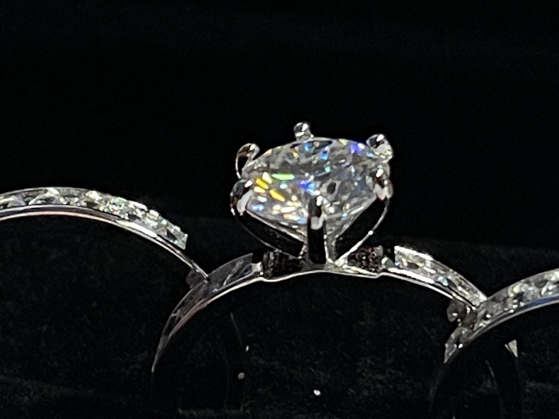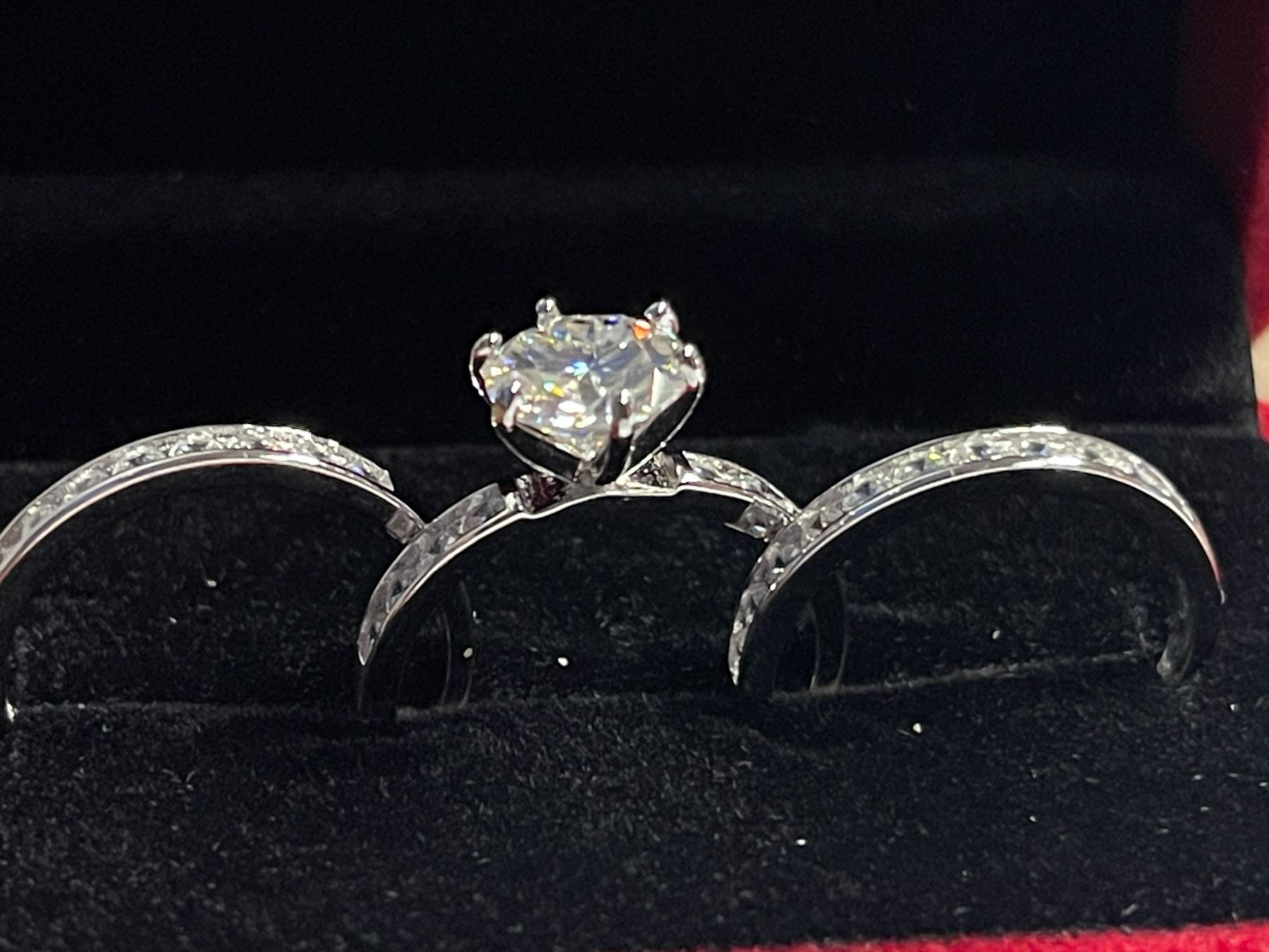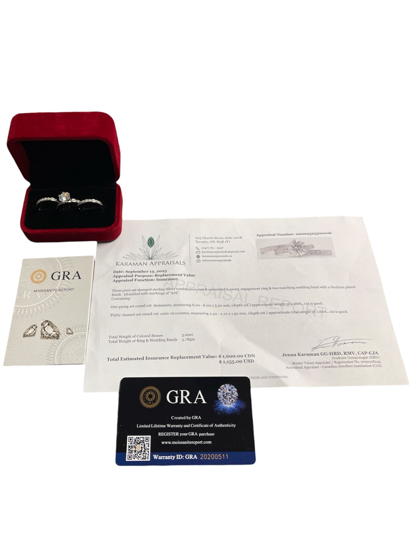 2.00 CT GRA CERTIFIED ROUND BRILLIANT CUT MOISSANITE STONE VVS D COLOR WITH 30 ROUND BRILLIANT CUT CUBIC ZIRCONIA STONES SET IN SHANK OF 3 RINGS SET IN WEDDING SET ALL SET IN 925 SILVER RING SIZE 7 RETAIL VALUE OF WEDDING SET $1,600.00