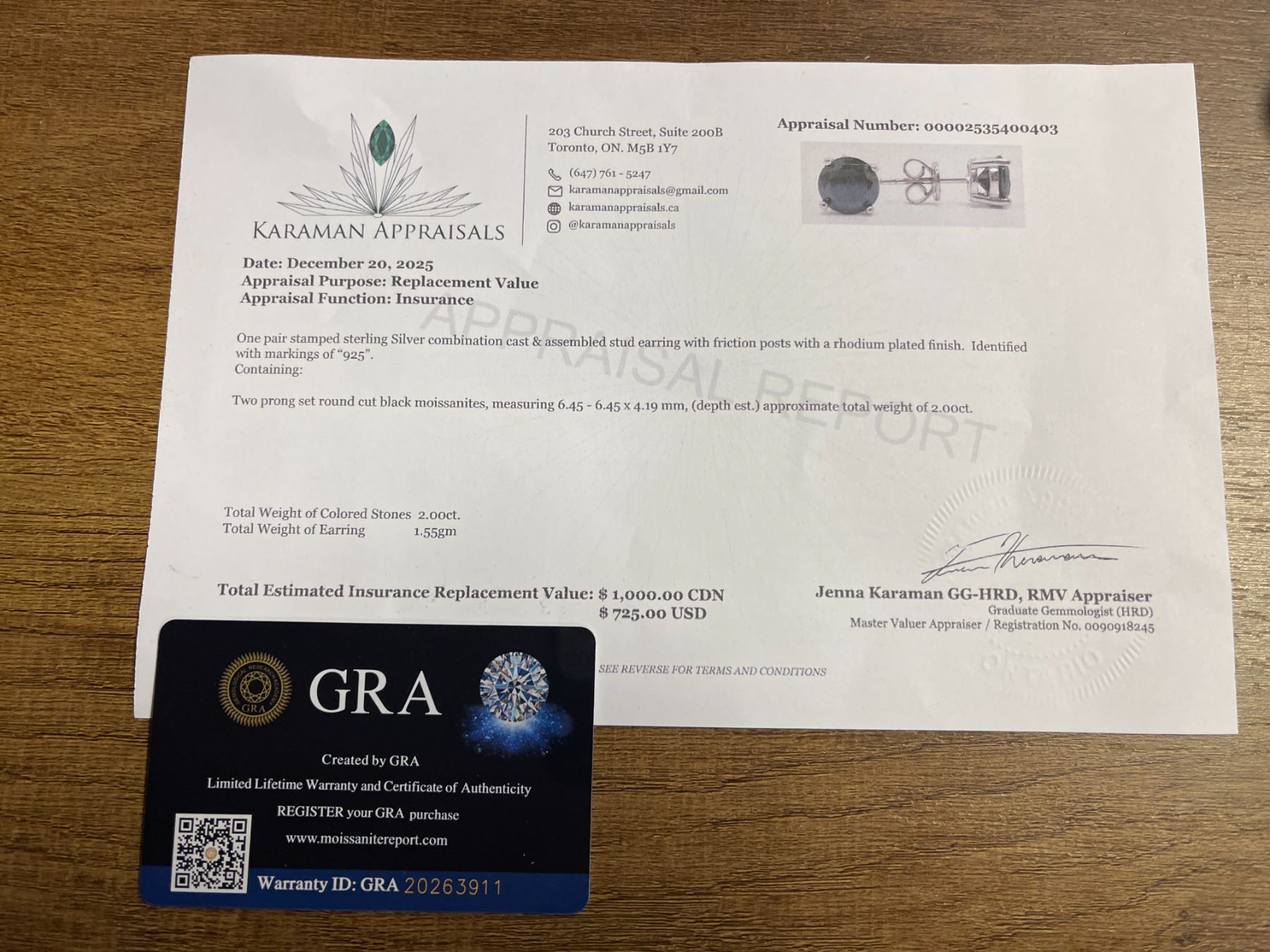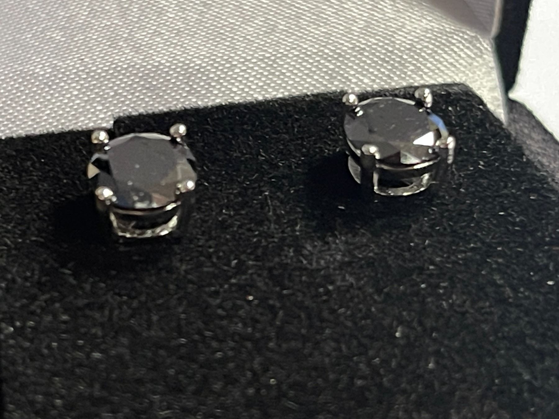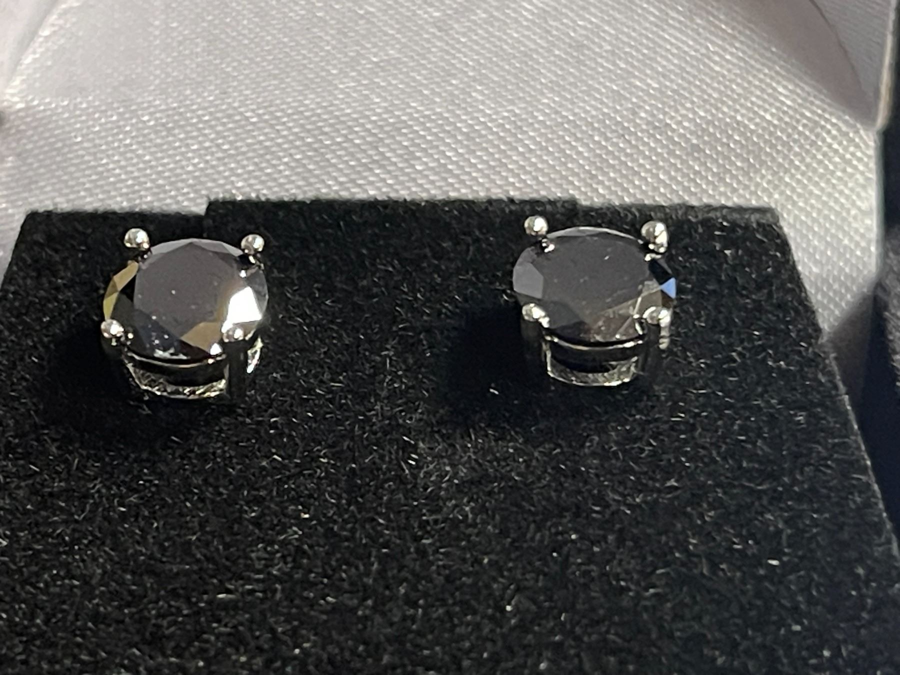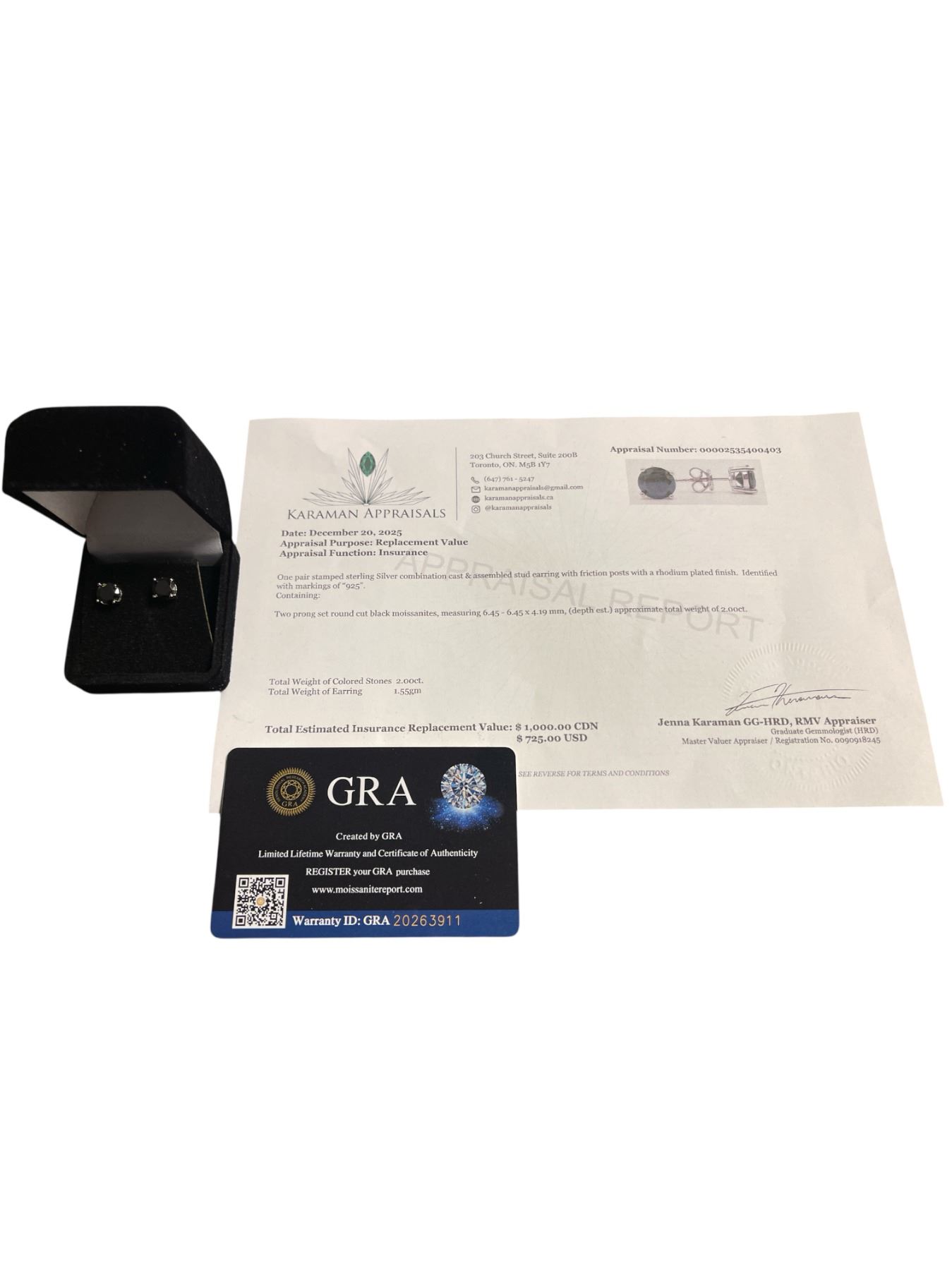 2.00 CT TW GRA CERTIFIED ROUND BRILLIANT CUT MOISSANITE STONES VVS BLACK COLOR SET IN 4 CLAW HEAD SET IN 925 SILVER EARRINGS RETAIL VALUE $1,000.00