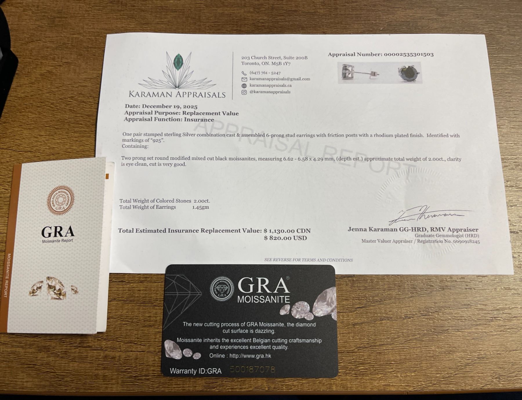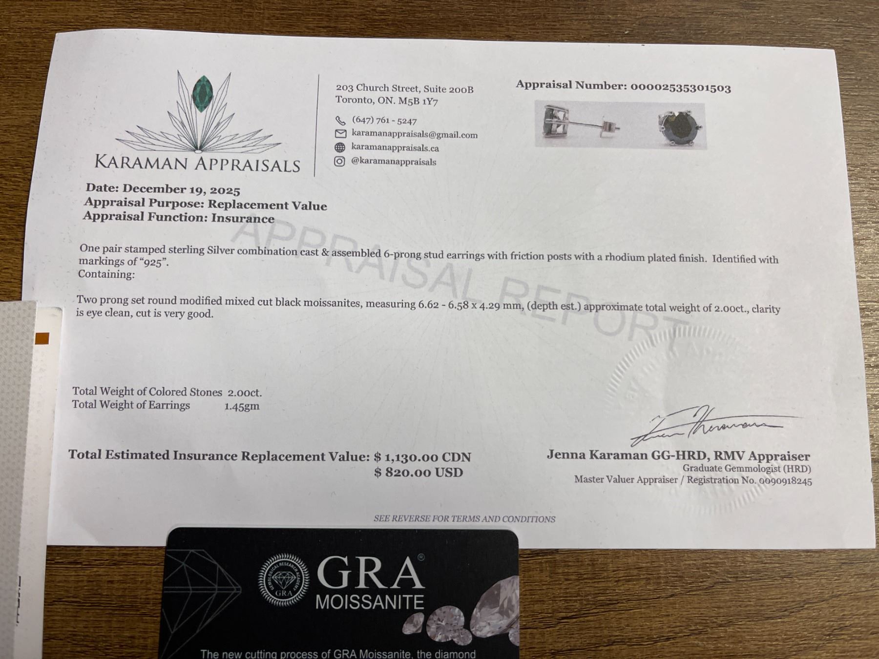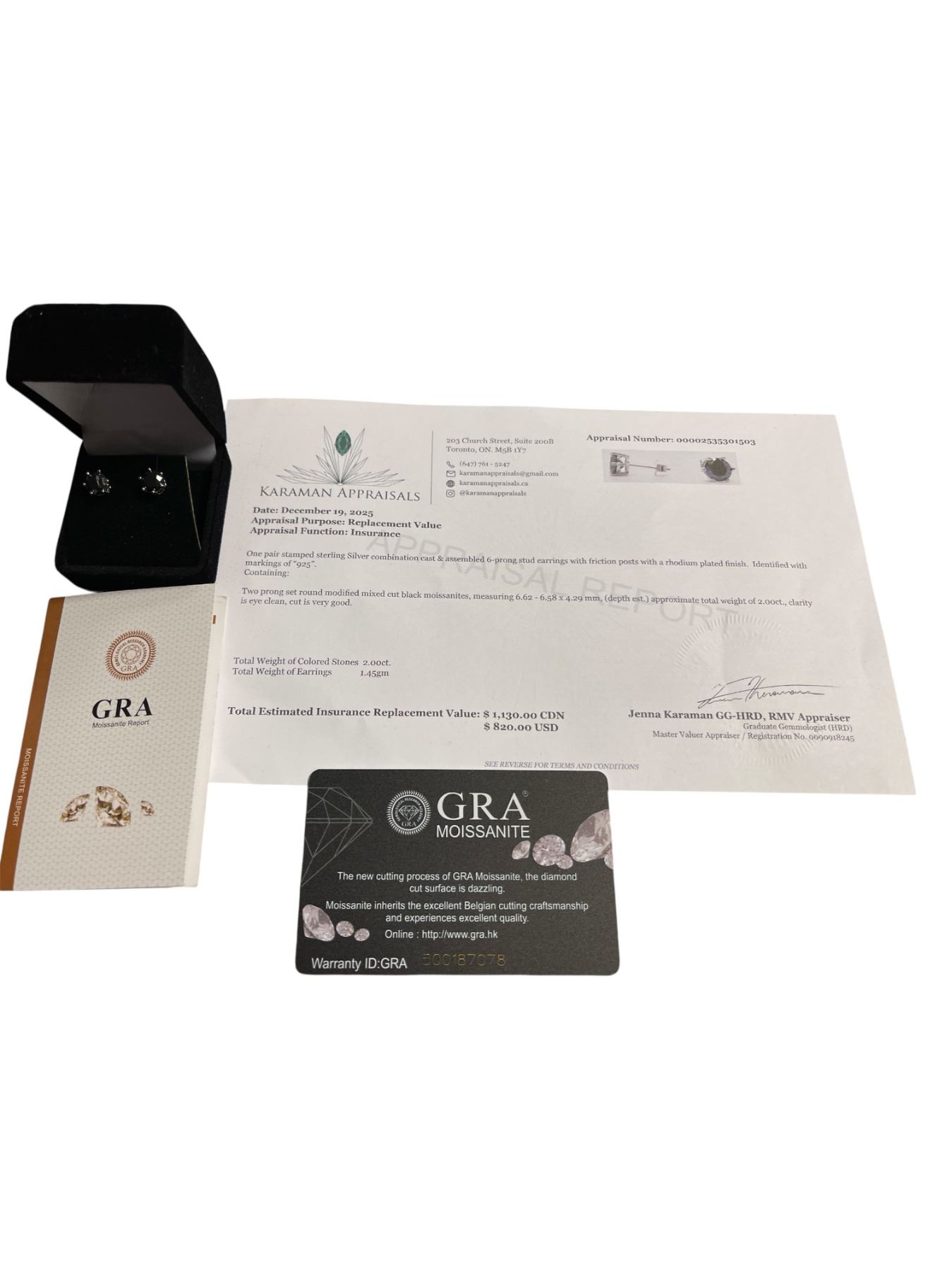 2.00 CT TW GRA CERTIFIED ROUND BRILLIANT CUT MOISSANITE STONES VVS BLACK COLOR SET IN 6 CLAW BASKET HEAD SET IN 925 SILVER EARRINGS RETAIL VALUE $1,130.00