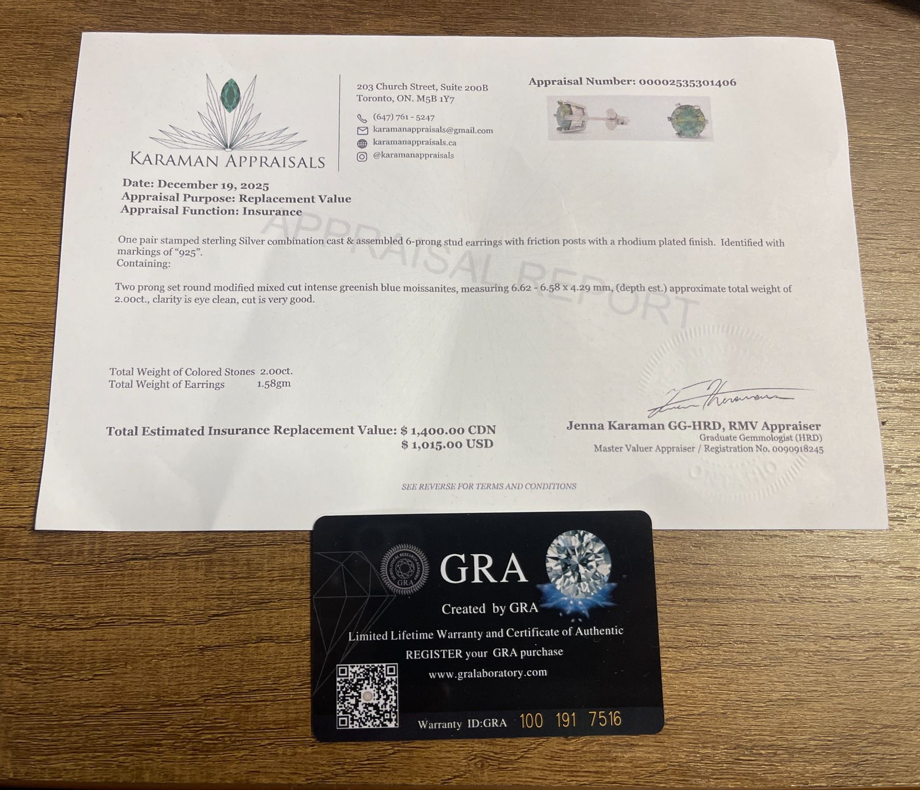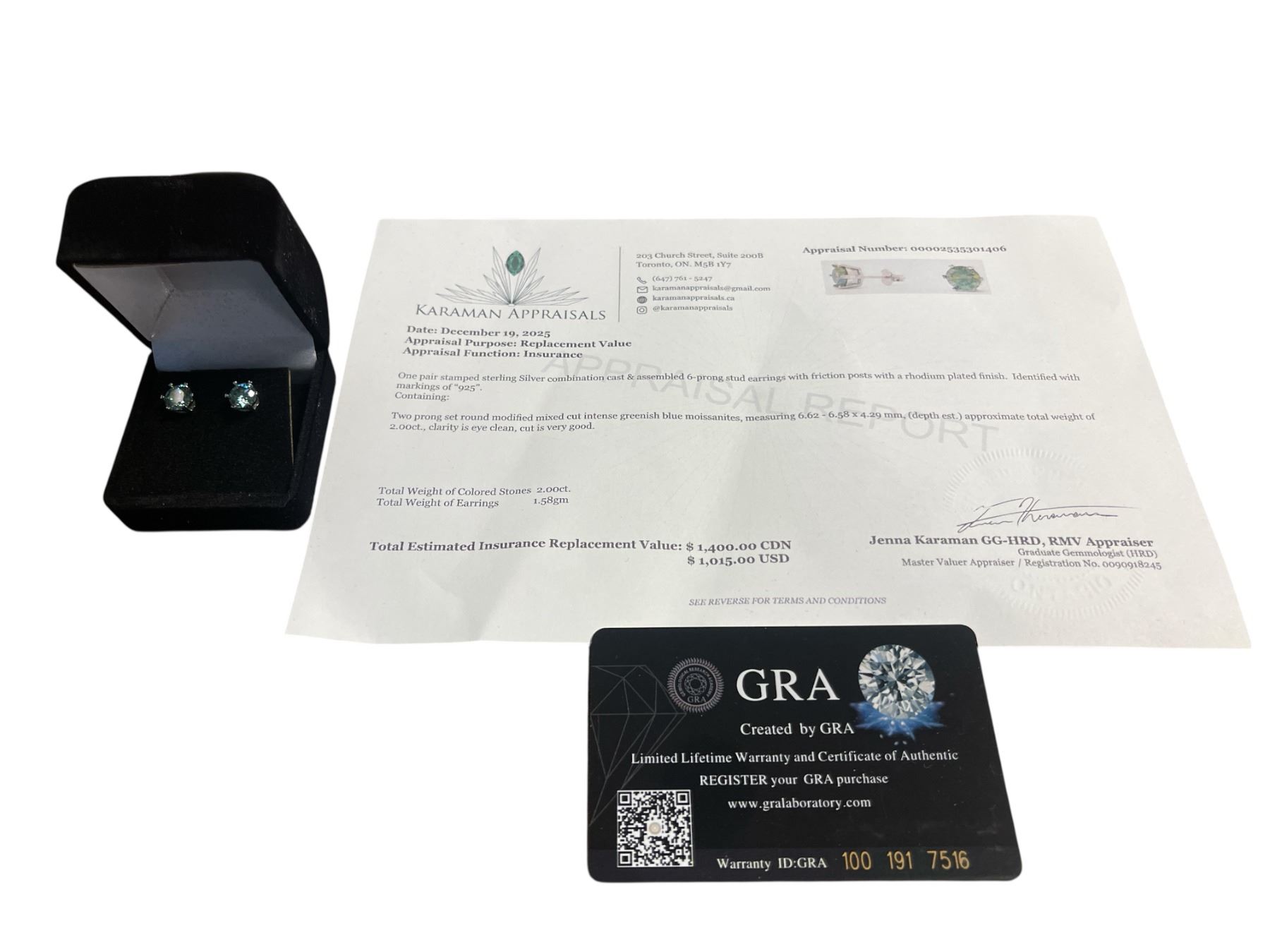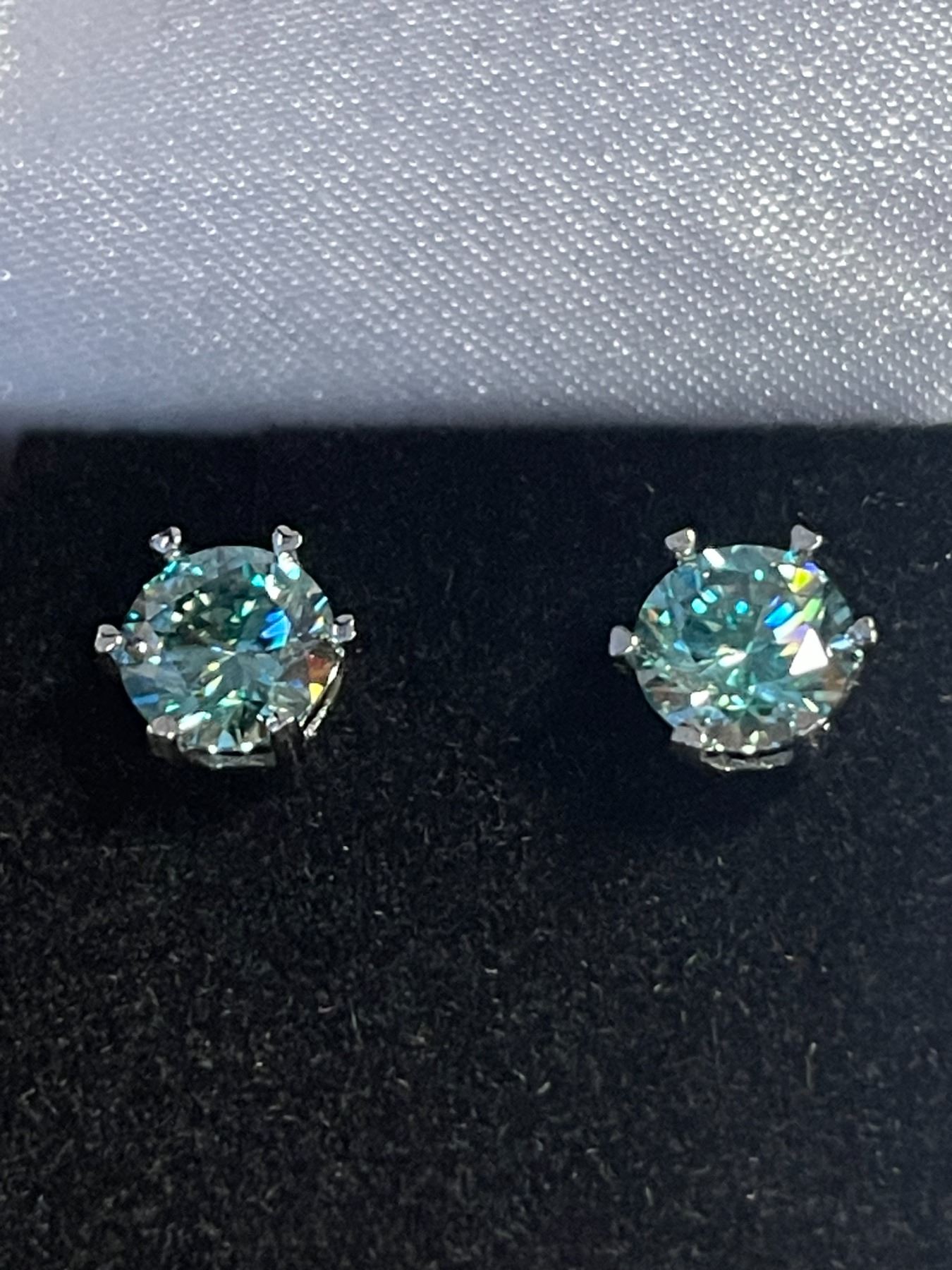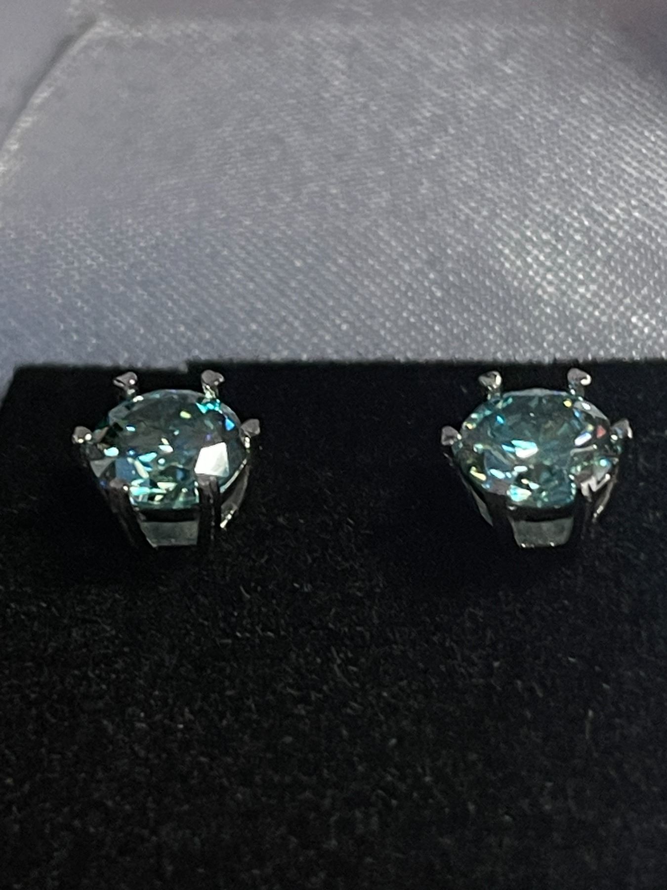 2.00 CT TW GRA CERTIFIED ROUND BRILLIANT CUT MOISSANITE STONES VVS INTENSE GREENISH BLUE COLOR SET IN 6 CLAW BASKET HEAD SET IN 925 SILVER EARRINGS RETAIL VALUE $1,400.00