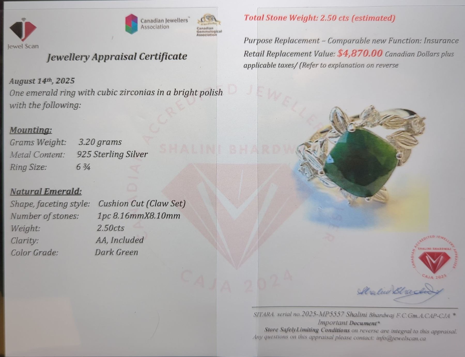 2.5 ct Authenticated Silver Emerald gemstone RIng ($4,870 Appraisal)
