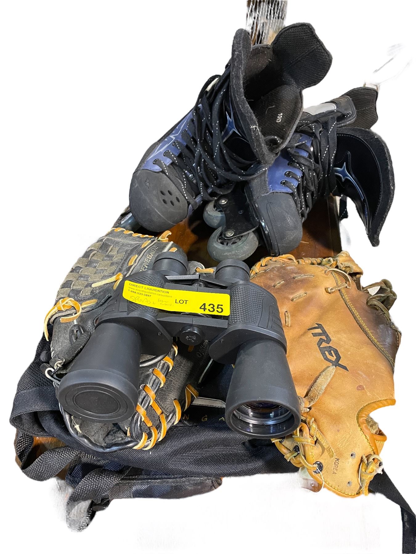 2 Baseball Mitts, Outerman Binoculars & Size 10 Roller Skates