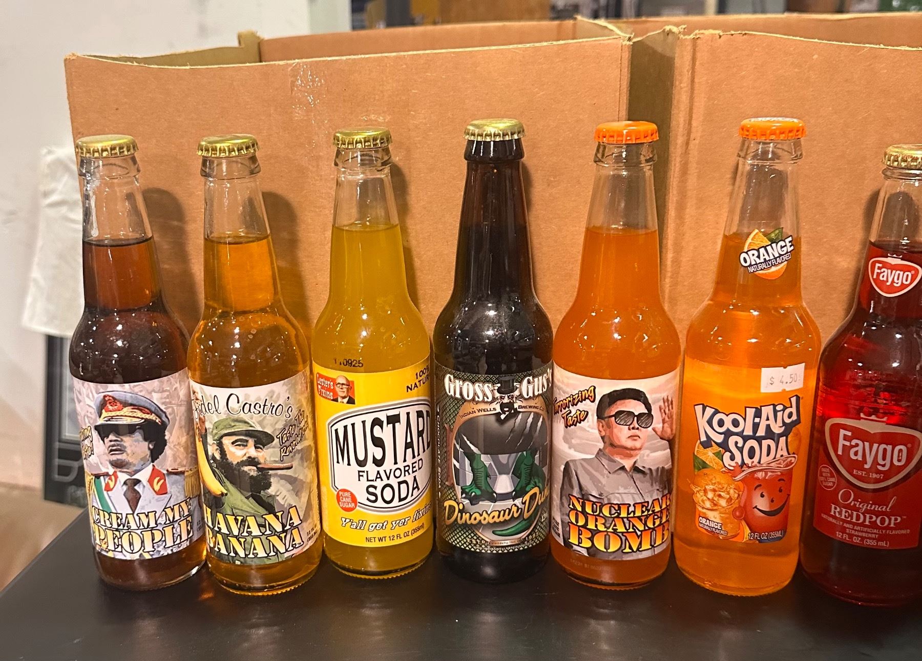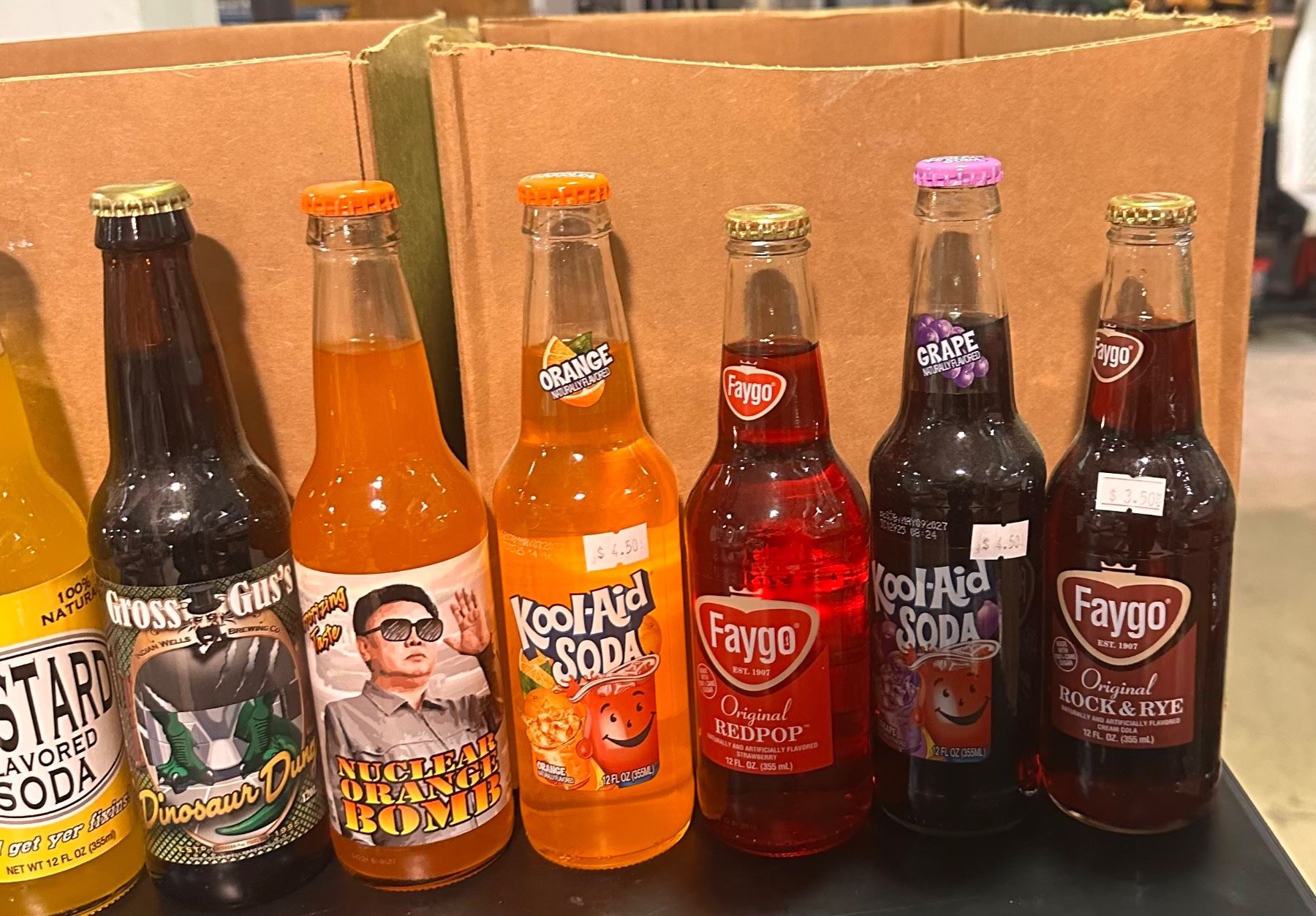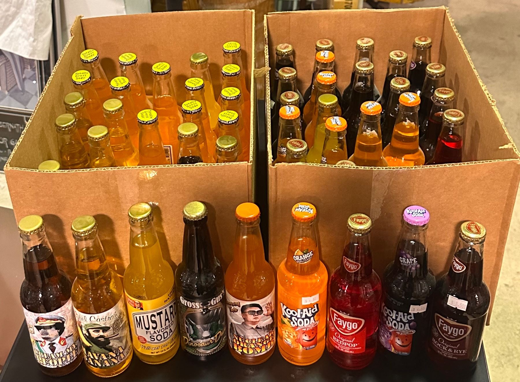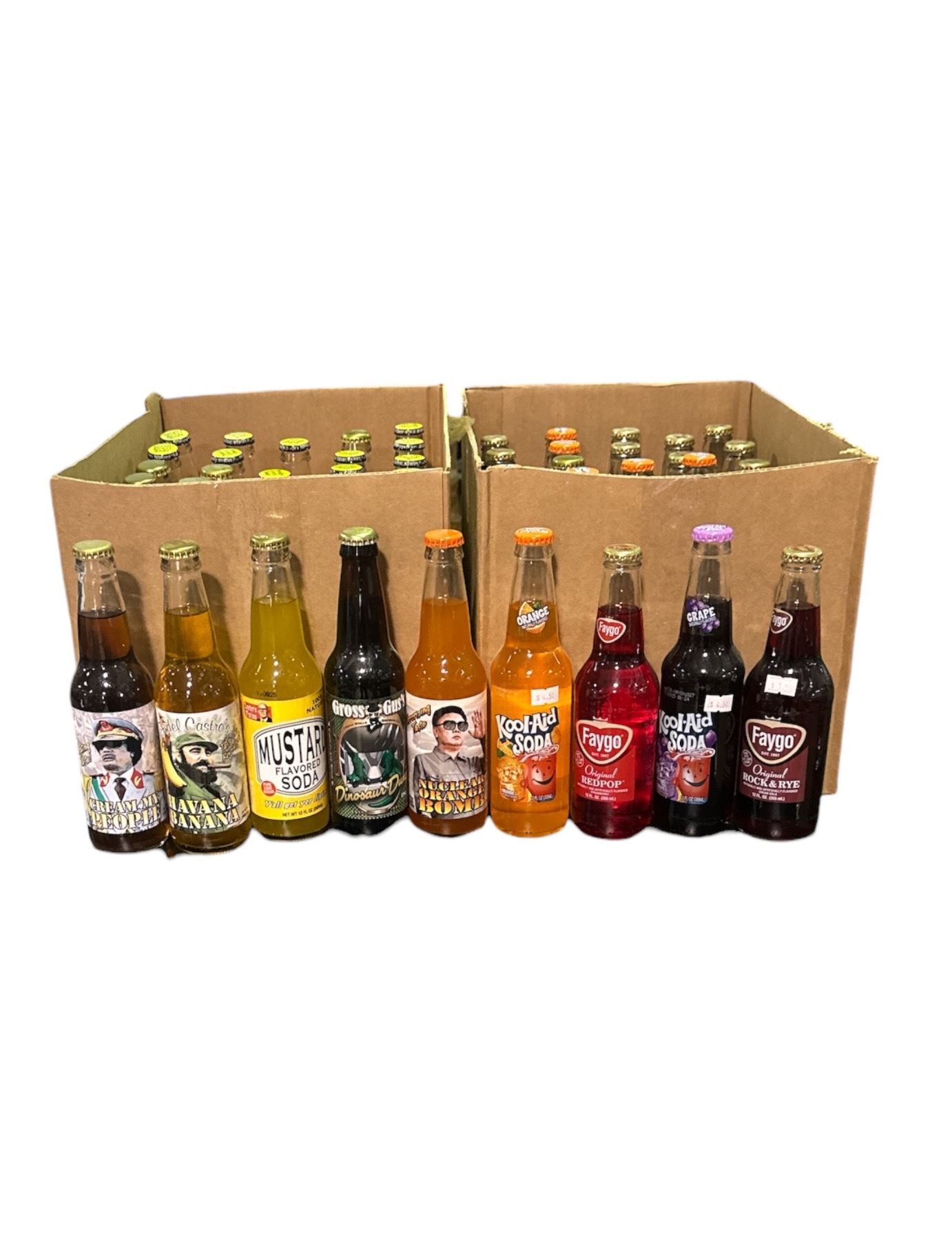 2 Boxes of Various Soda - Faygo, Kool-Aid Soda, Mustard Flavour Soda, Worm Ooze Soday, Etc..