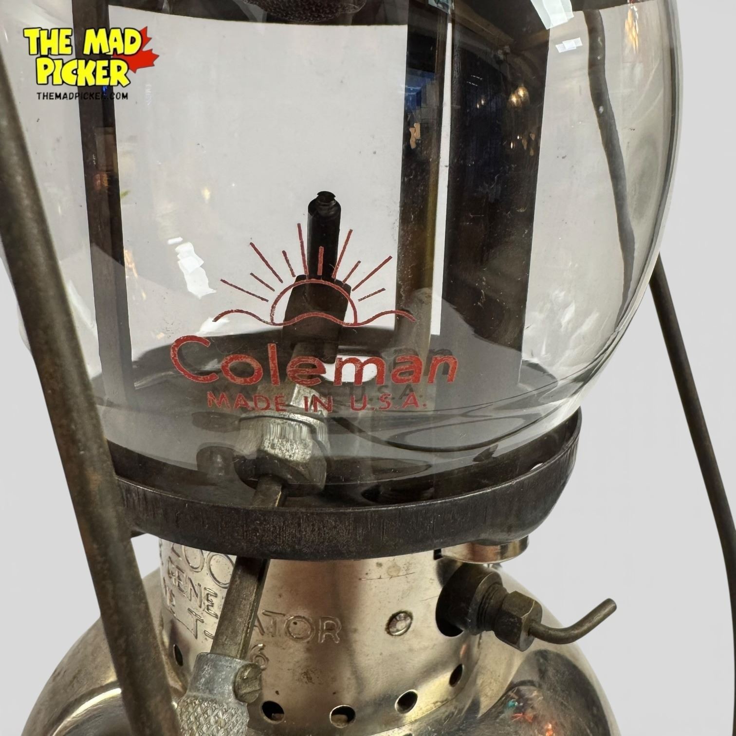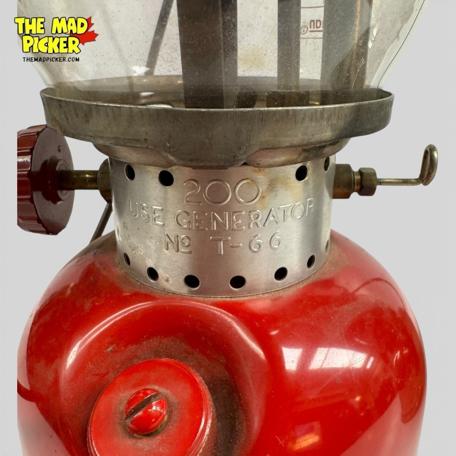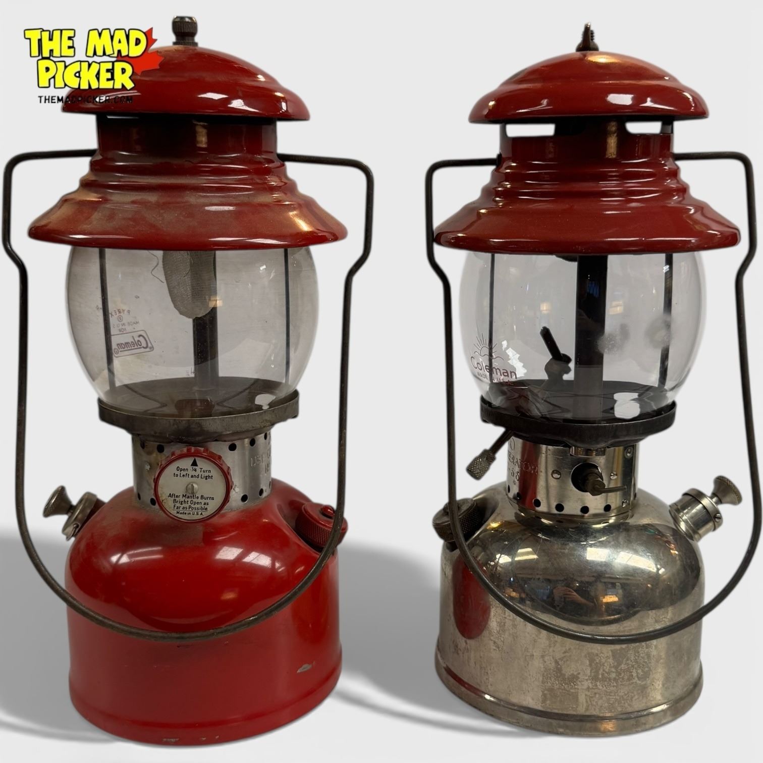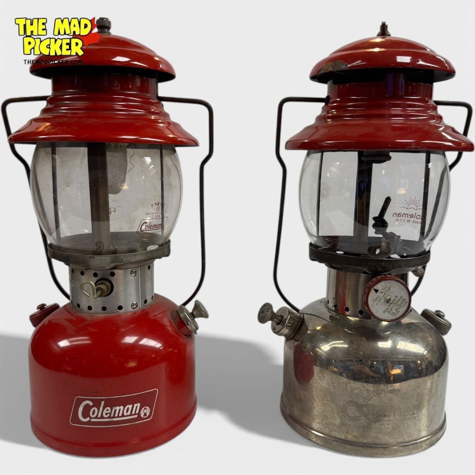 Set of 2 Coleman Model 200 lanterns. Includes a red lantern with no date stamp and a nickel-plated lantern dated 1957. Model 200 lanterns feature single mantle design and are popular for their durability. Distinctive materials and finishes highlight mid-20th-century craftsmanship.