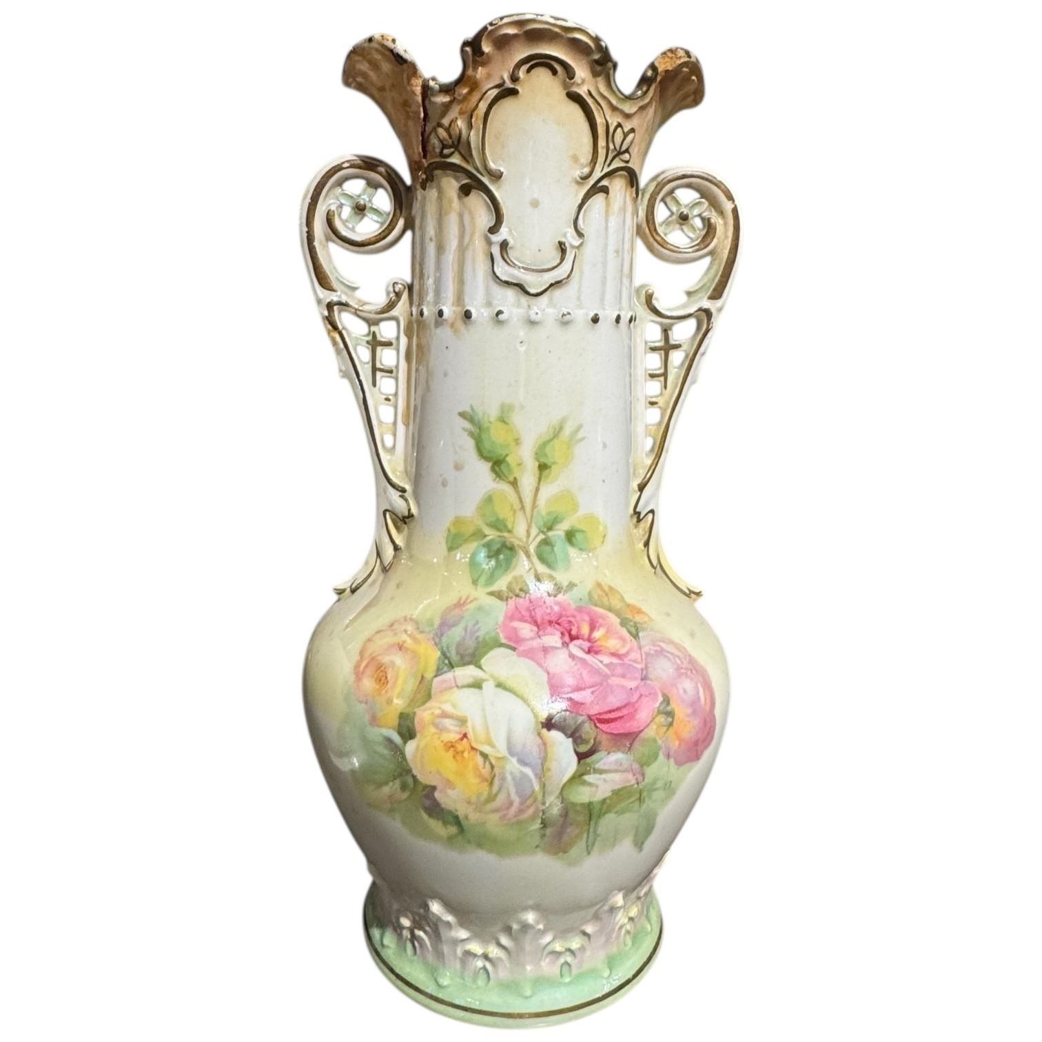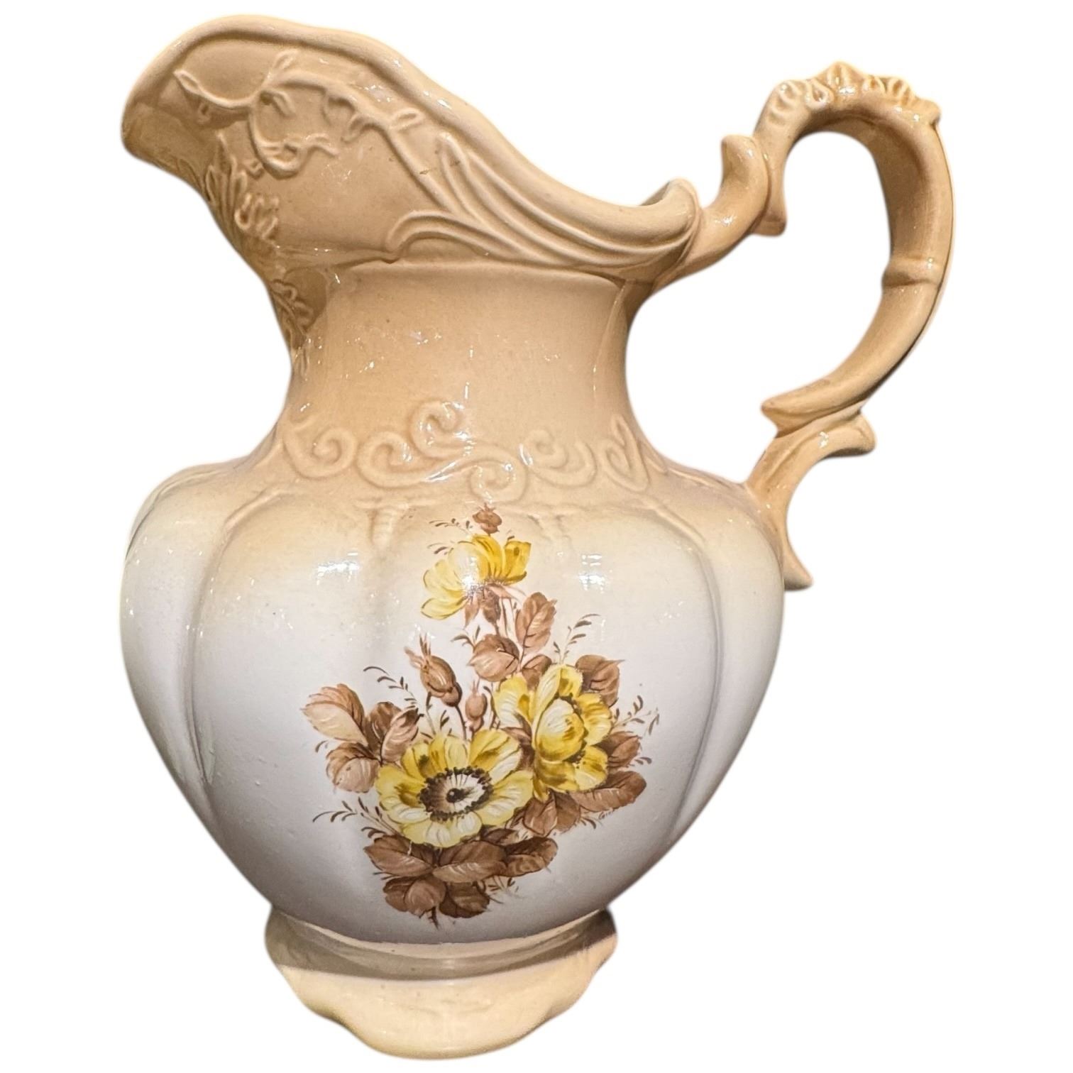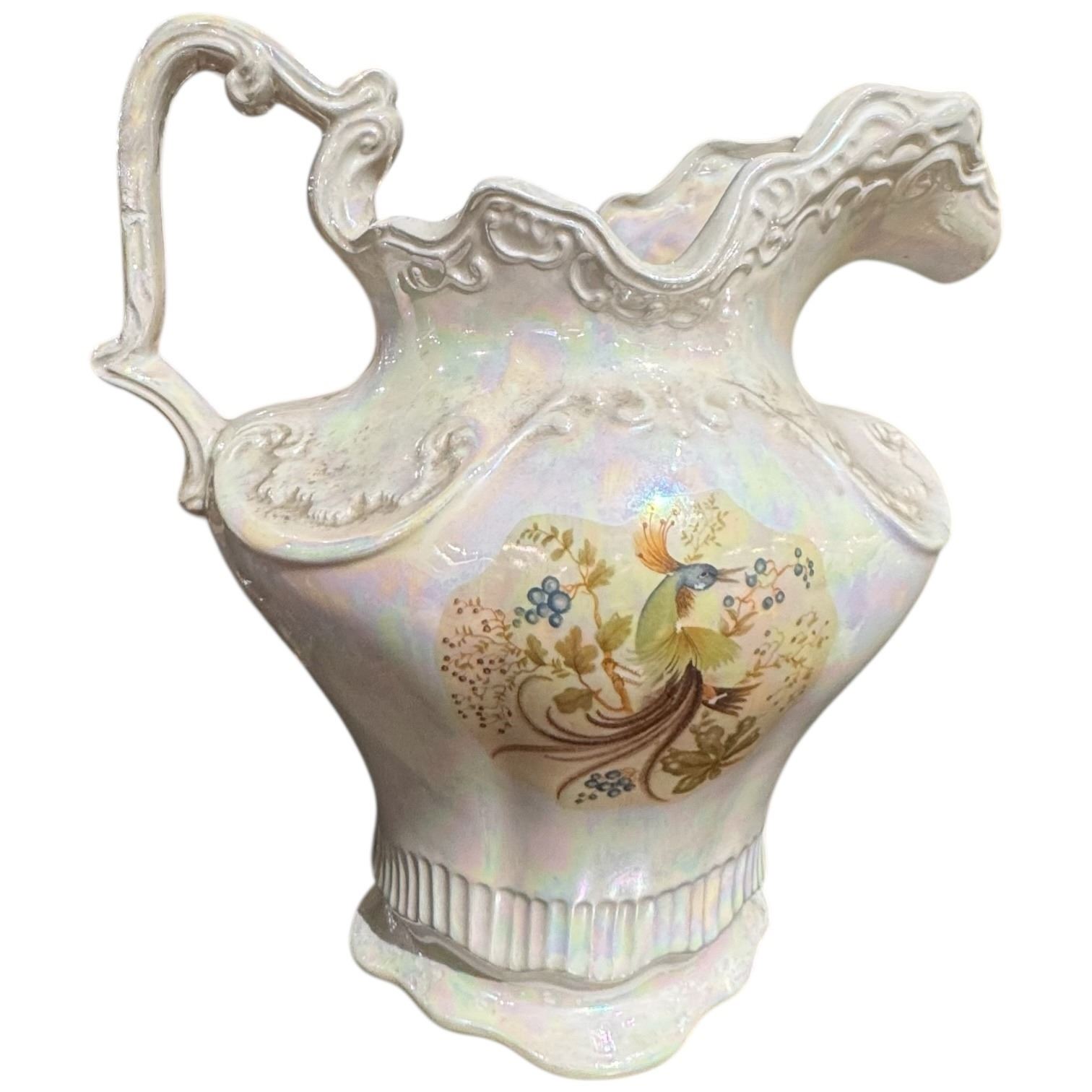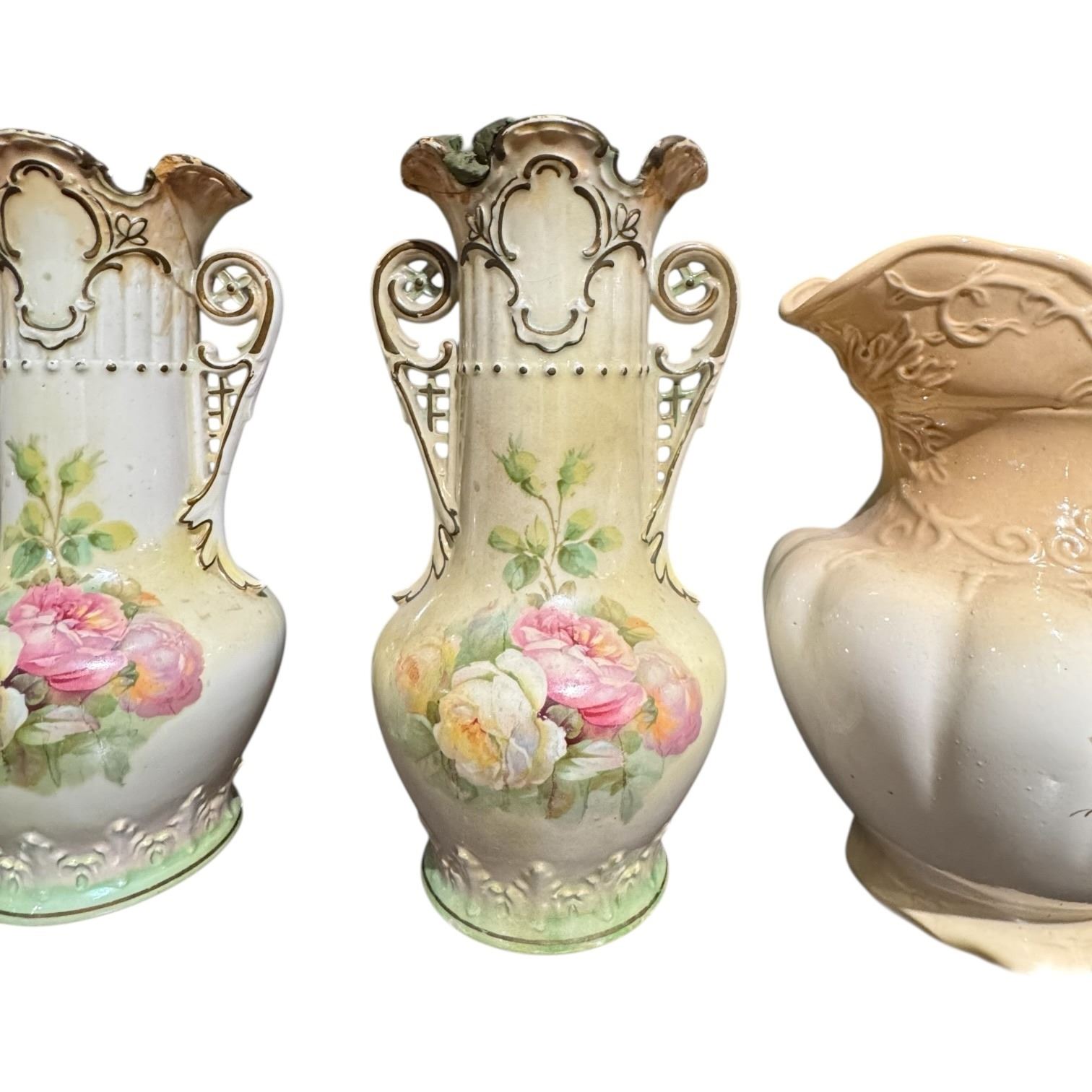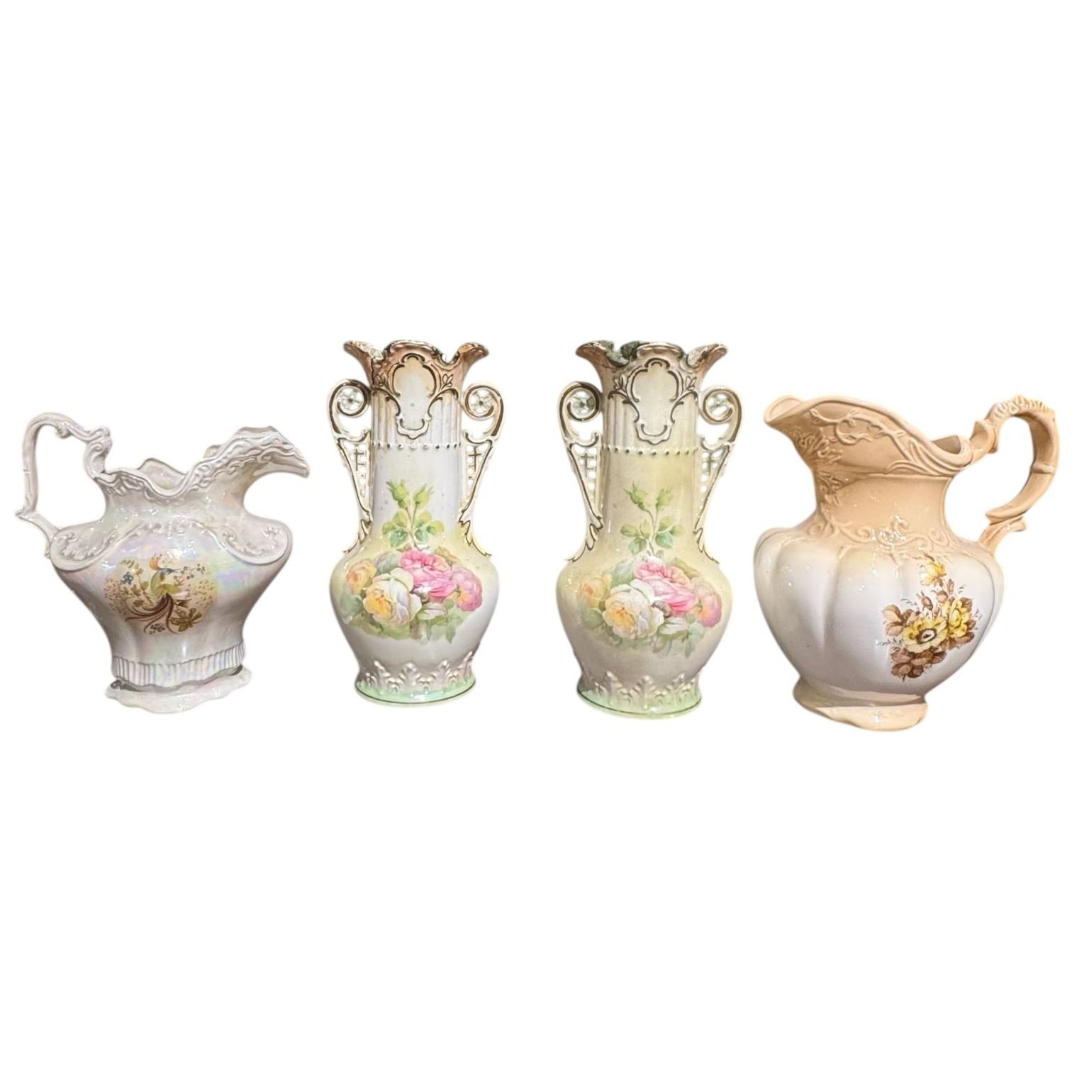 2 Large Ceramic Water Pitchers and 2 Vintage Transferware Vases (Vases have damage)