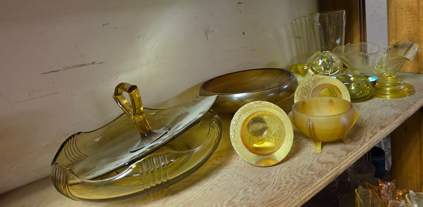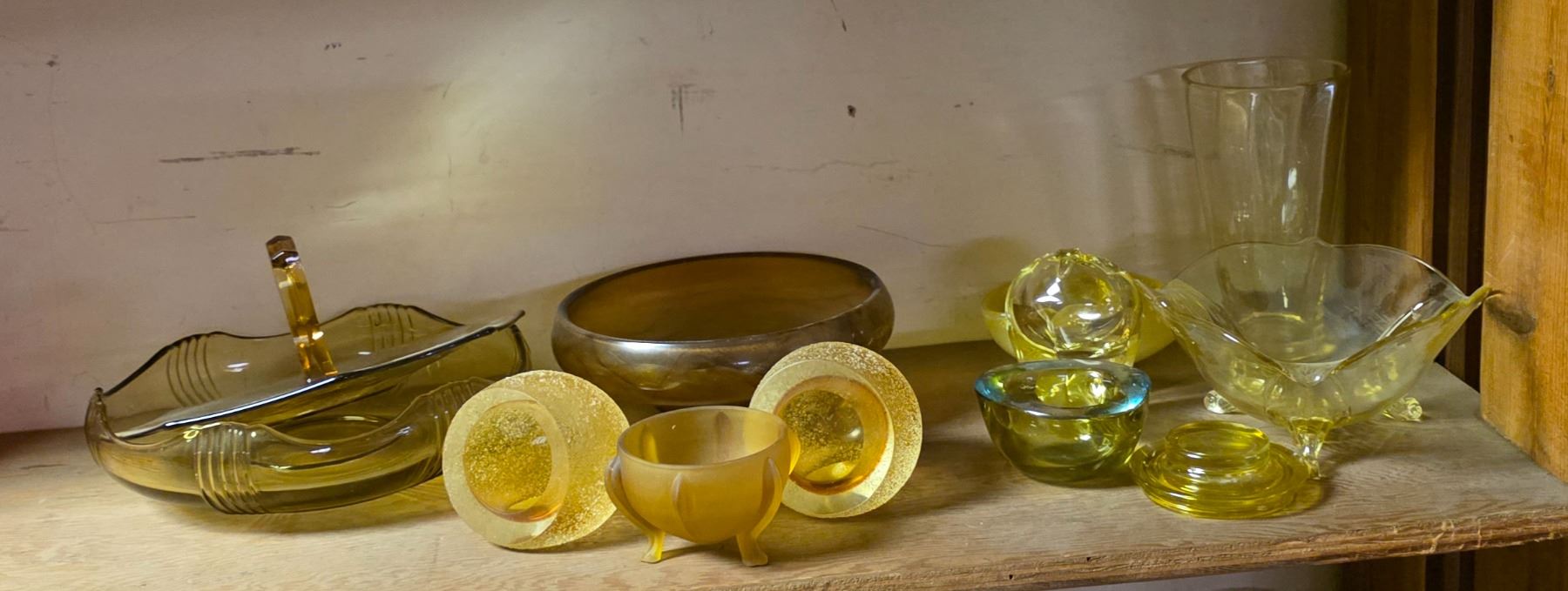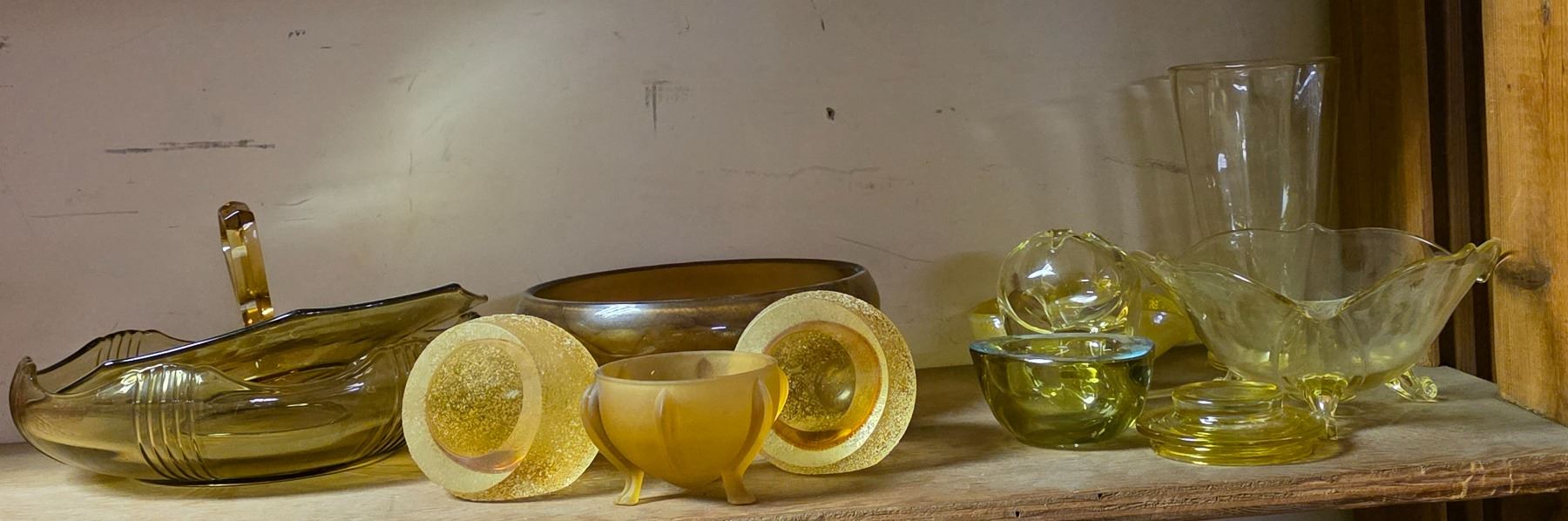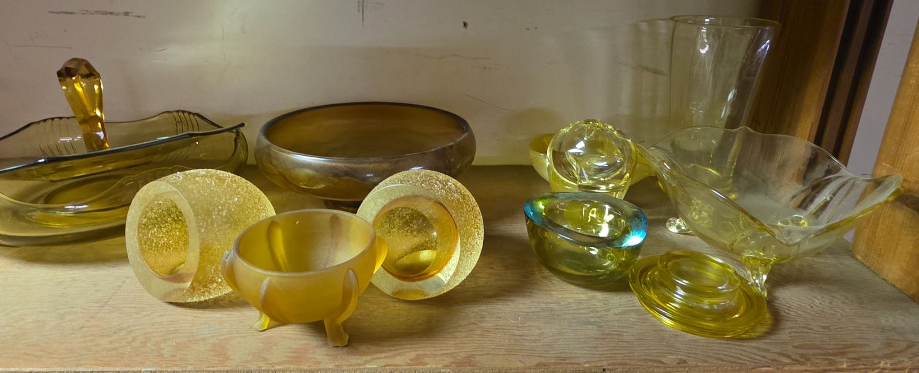 2 Pcs Fifth Avenue Glass Amber Frosted Candleholders, and Group of Yellow Depression Glass