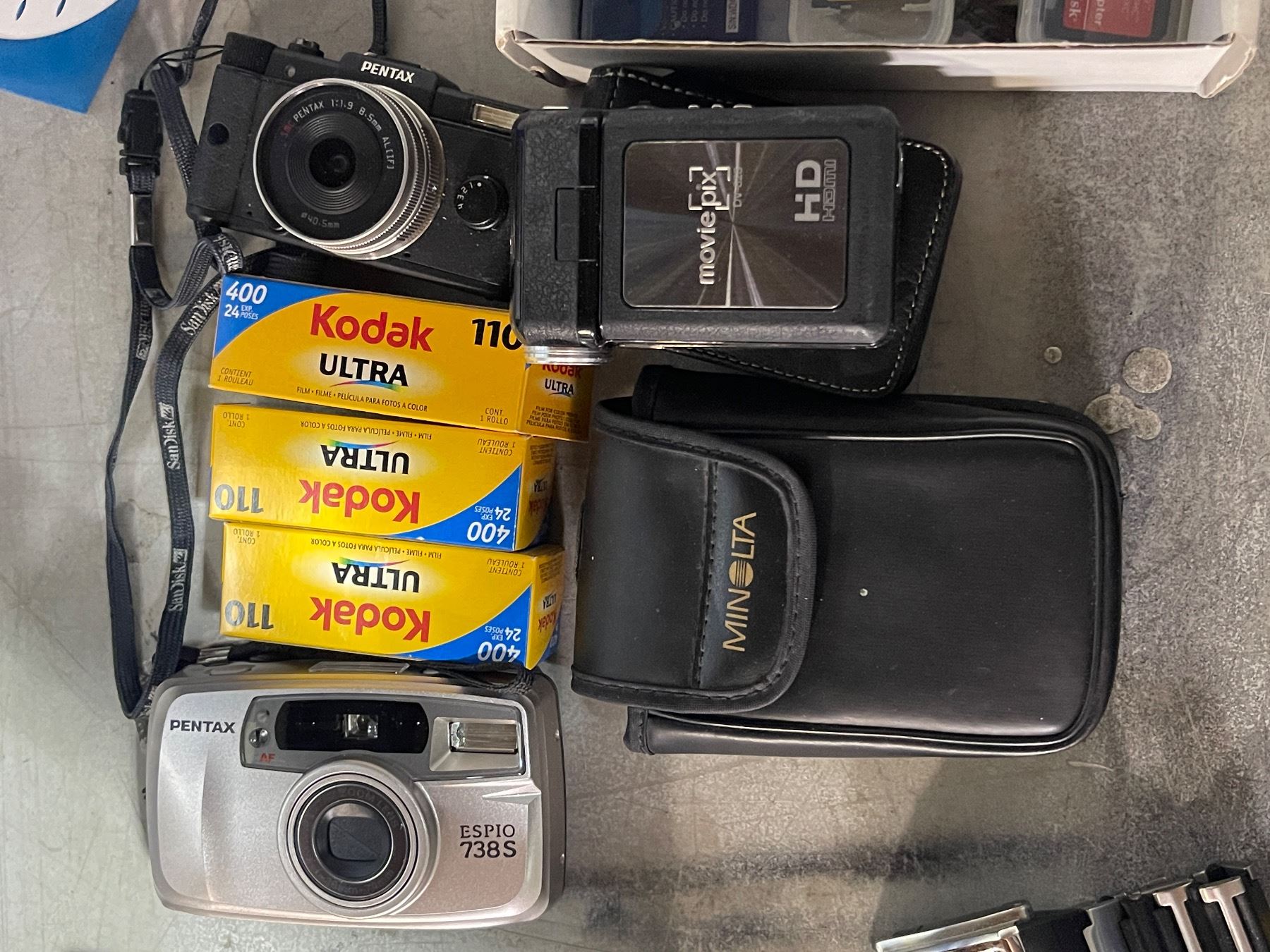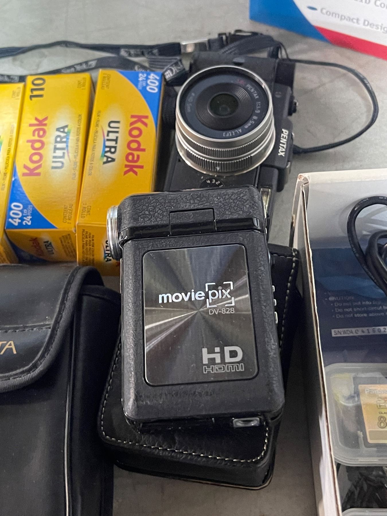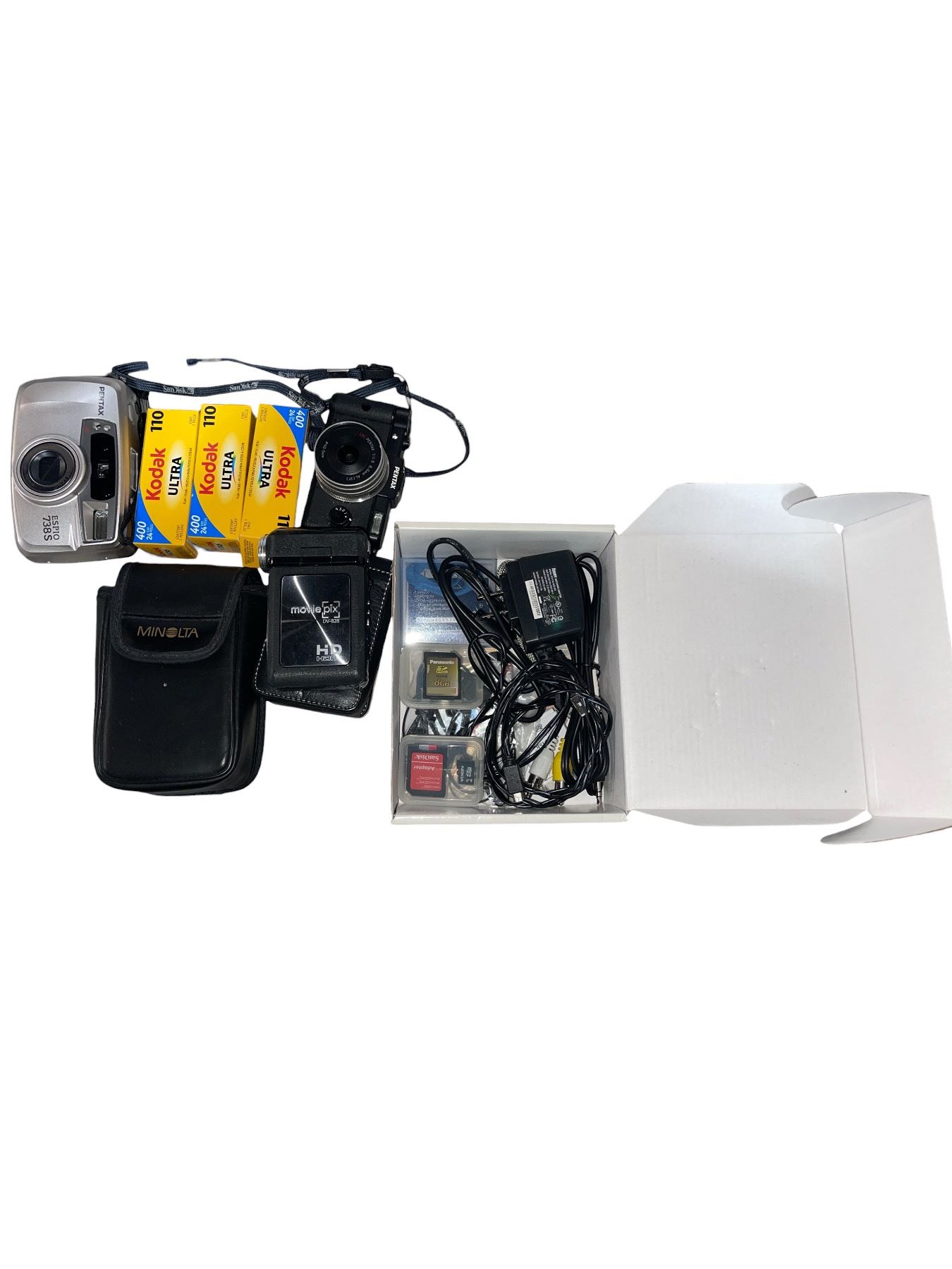 2 Pentax Cameras, Digital Camcorder, Group of Memory Cards & Kodak 110 Film