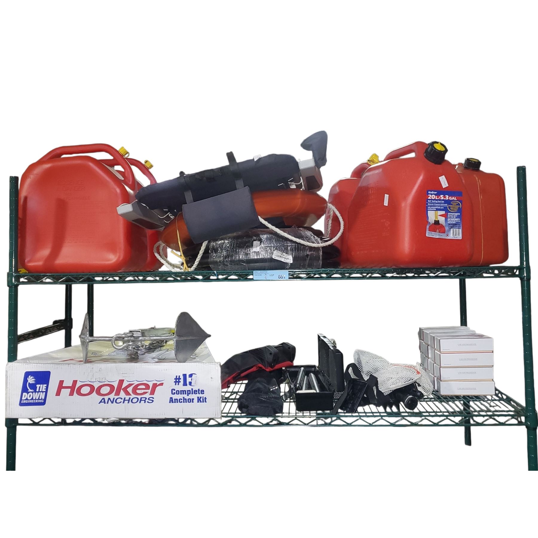 2-Shelf Assorted Boat Gear Items - Hooker Anchor, Jerry Cans, Safety Floats, and More