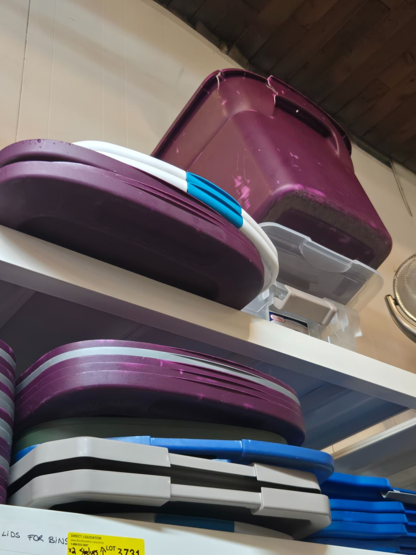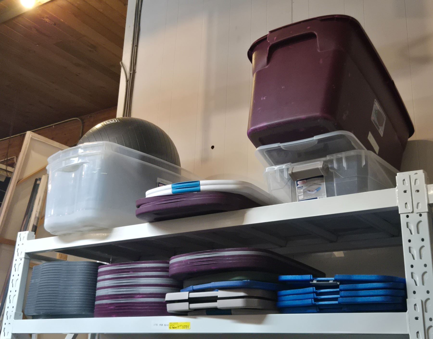 2 Shelves - Plastic Bins, Lids, Exercise Ball, Etc.