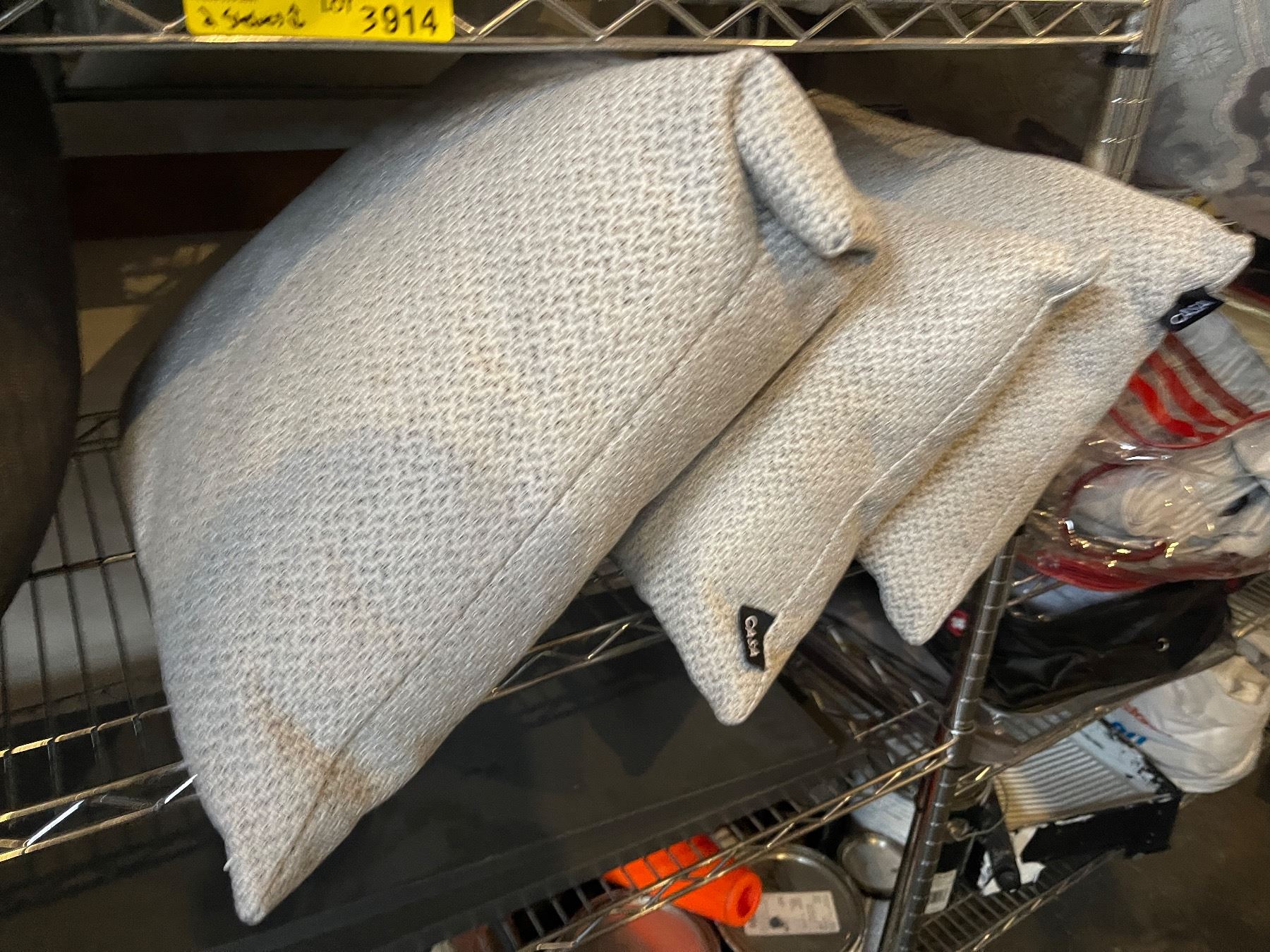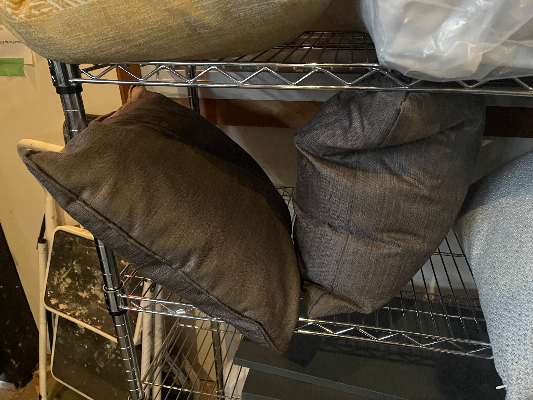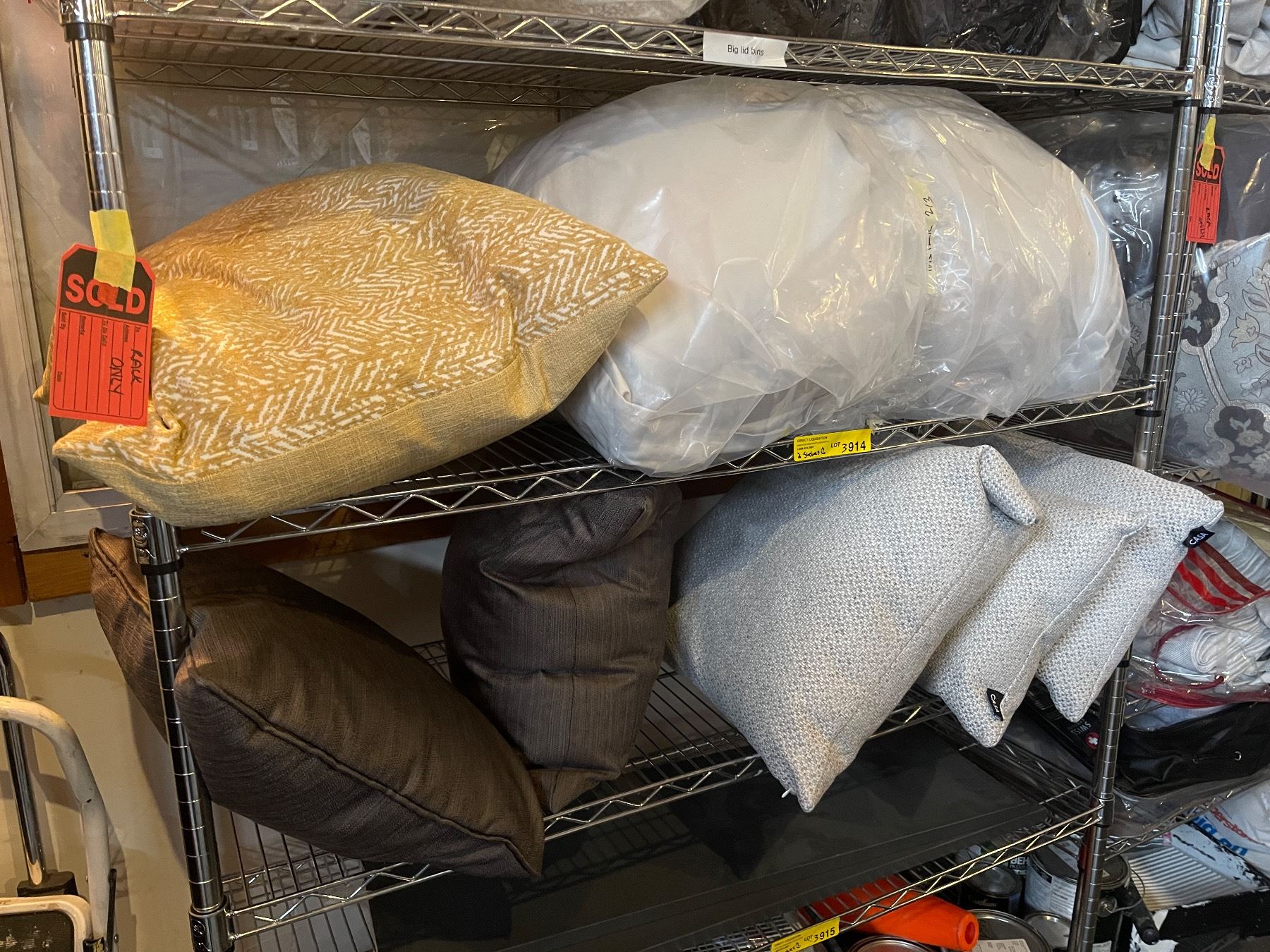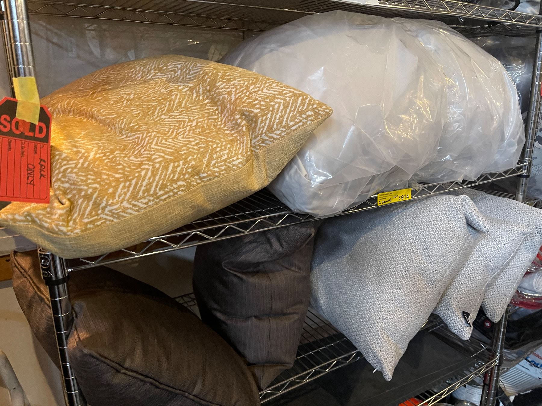 2 Shelves - Throw Pillows (x3) Grey, (x2) Charcoal, Yellow/Beige + Bedding