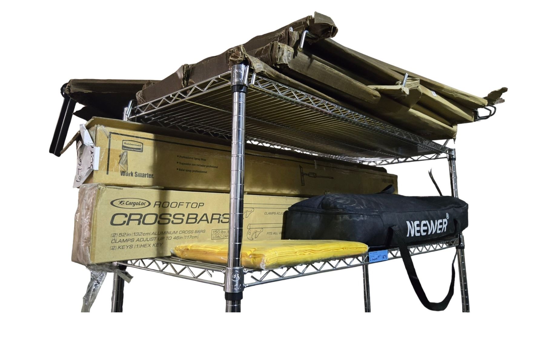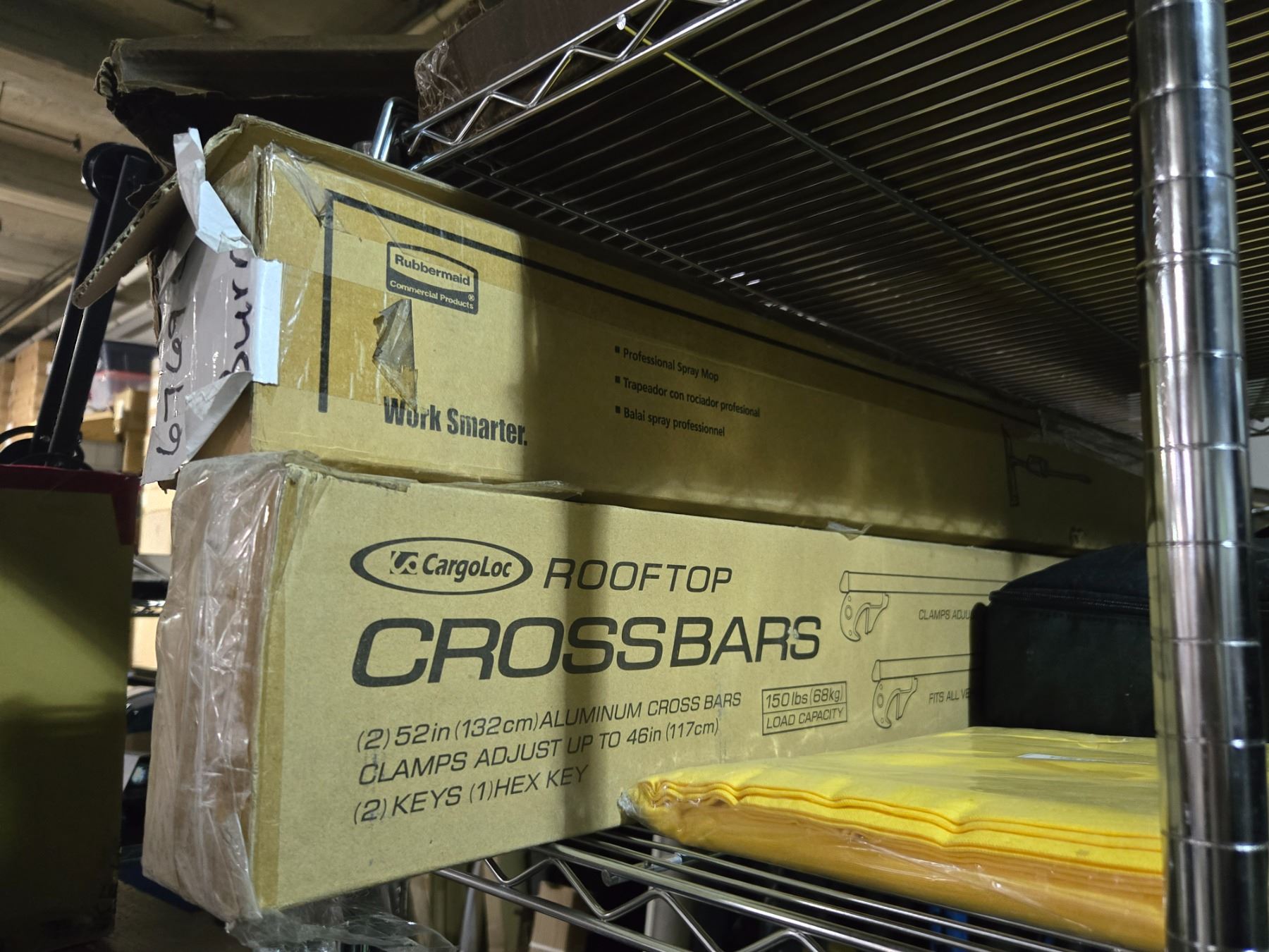 2 Shelves of Misc - Crossbars Rooftop, Table Cloth, Bag Buddy, Etc.