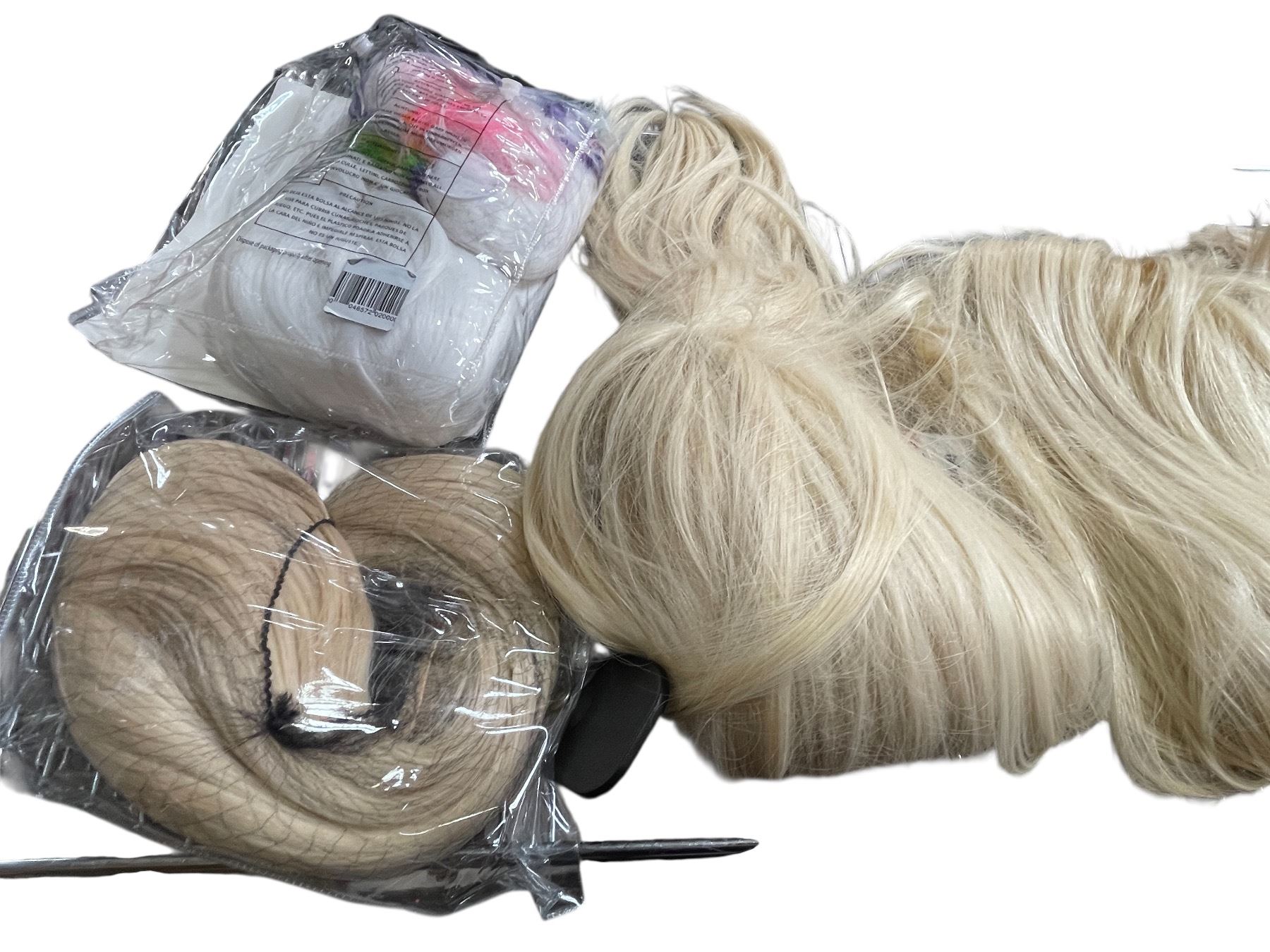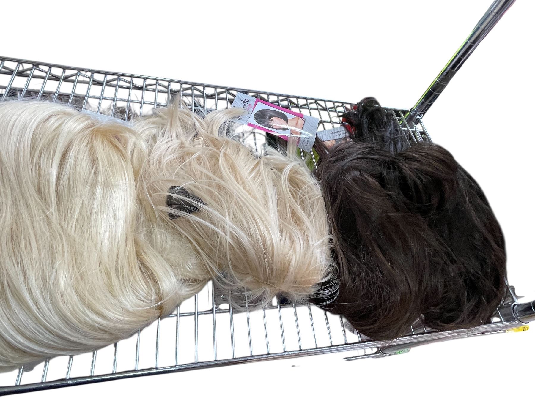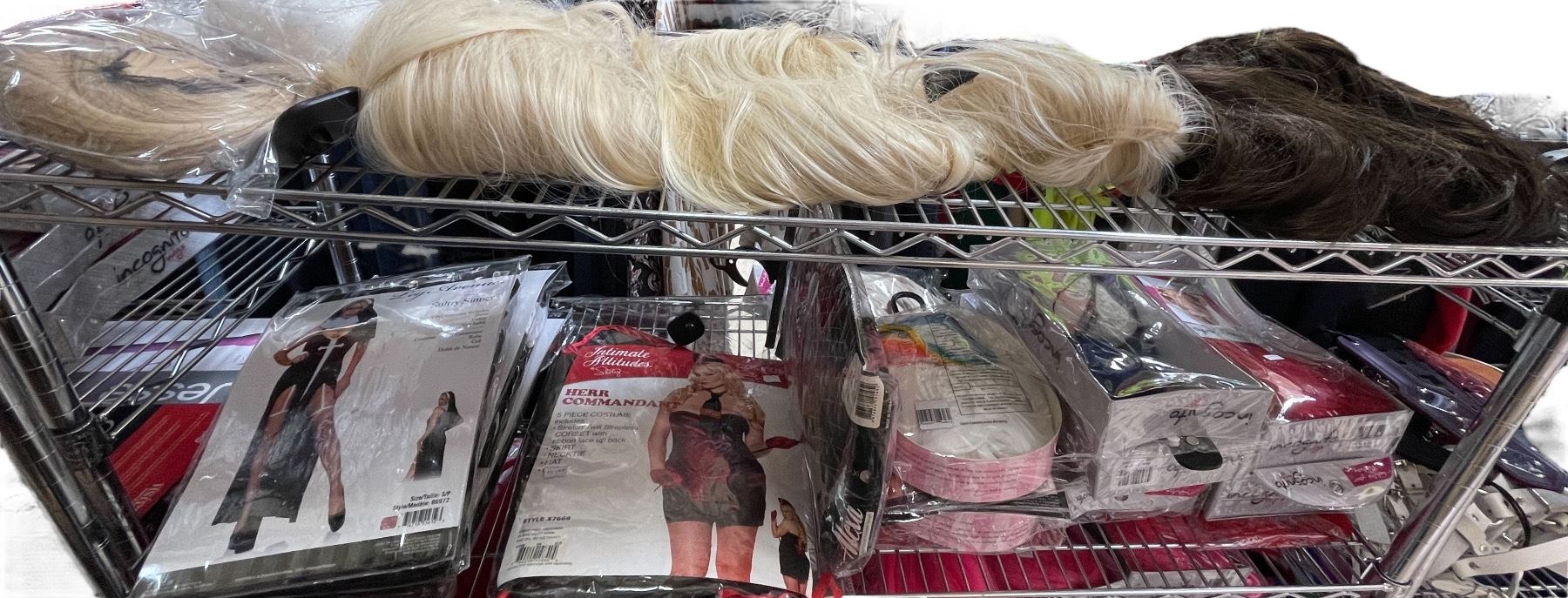 2 Shelves of Misc Various Coloured Wigs, Costumes, Etc.
