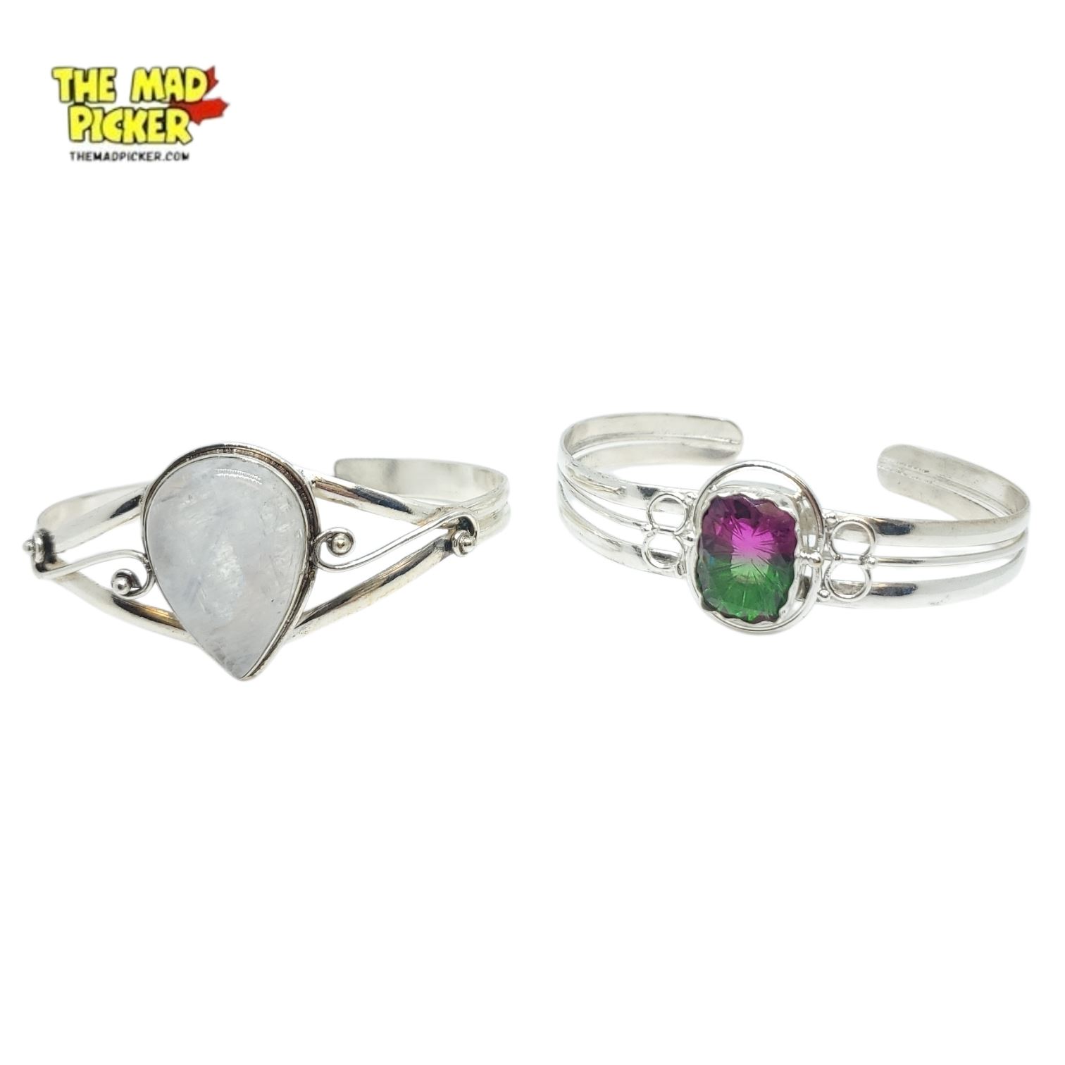 2 Sterling Silver Gemstone Cuff Bracelets (Moonstone teardrop and Watermelon Tourmaline) Stamped .925 - Total weight: 42.2 grams