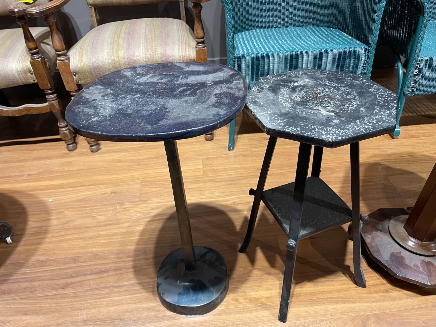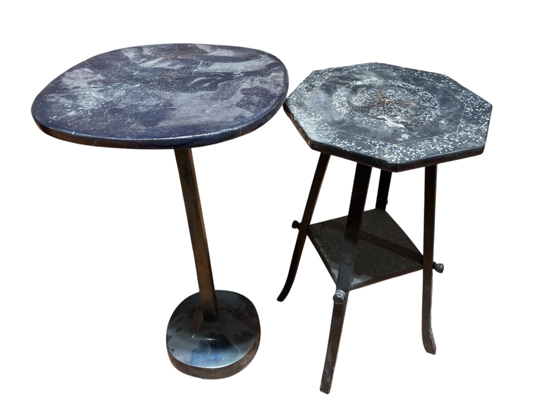 2 Vintage End Tables * Blue metal mid-century is 24" tall x 13" diameter * Black painted wood with MOP inlay is 21" tall x 11" diameter