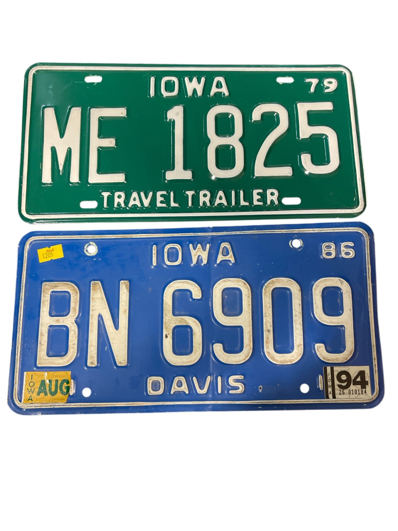 2 Vintage Iowa License Plates: BN 6909 (1986) and ME 1825 (1979) Travel Trailer