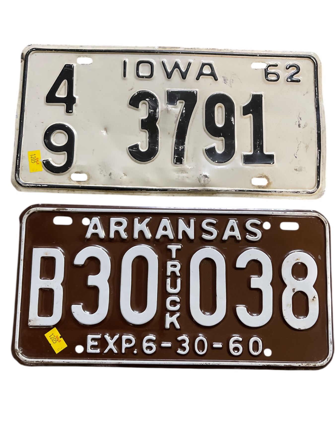 2 Vintage License Plates: Arkansas Truck "B30 038" (1960) and Iowa "49 3791" (1962)