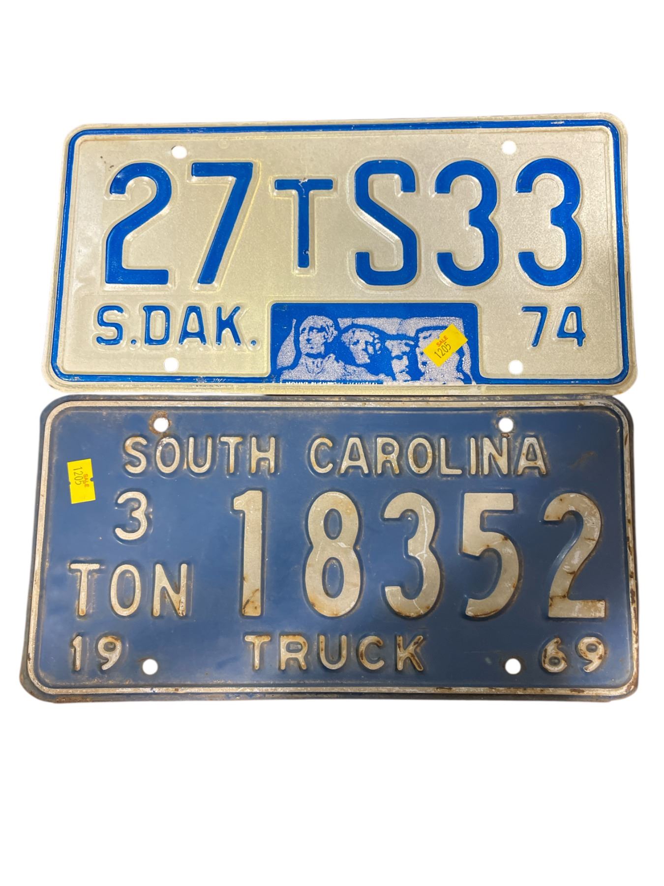 2 Vintage License Plates :South Carolina Truck 18352 (1969) and South Dakota 27TS33 (1974)