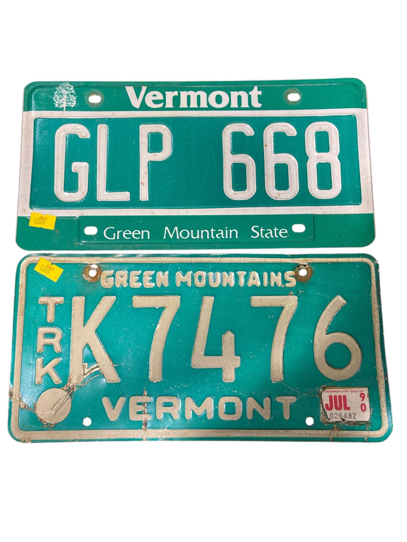2 Vintage Vermont License Plates: TRK 7476 (Jul 1990) and GLP 668
