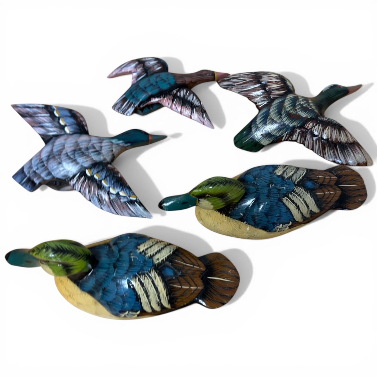 2 Wood Ducks and 3 Wall Hanging Wood Ducks * Longest duck is 11"