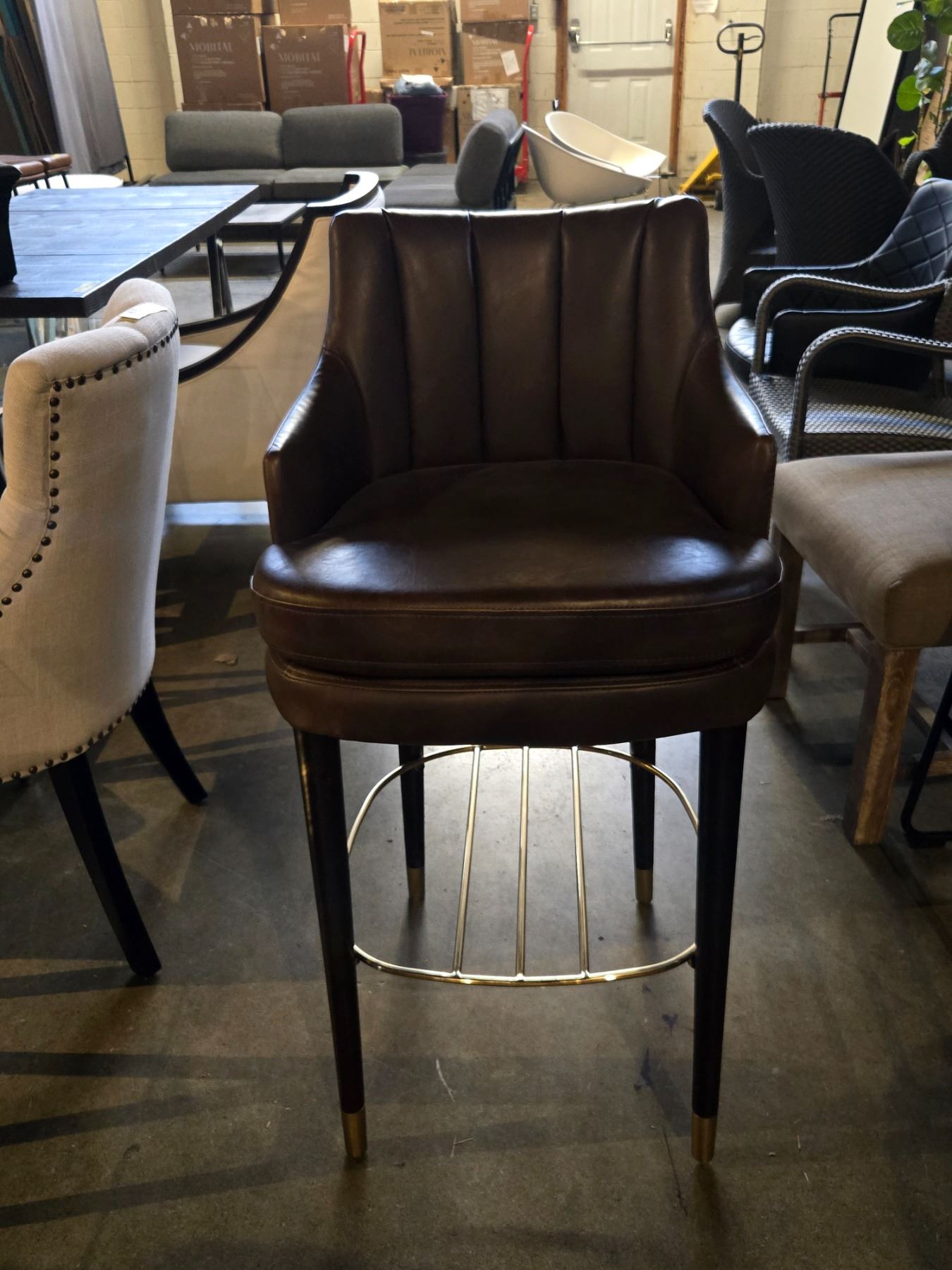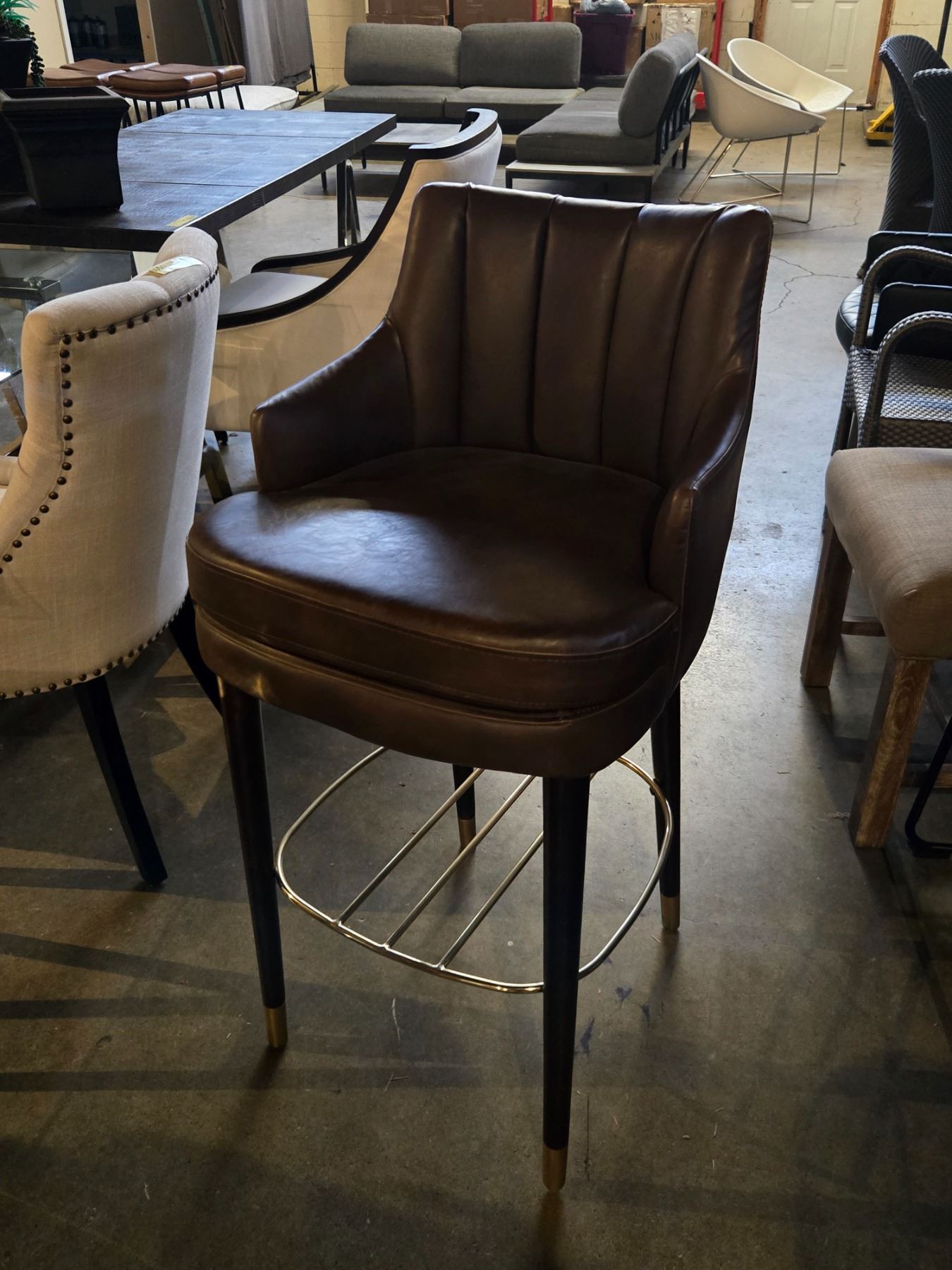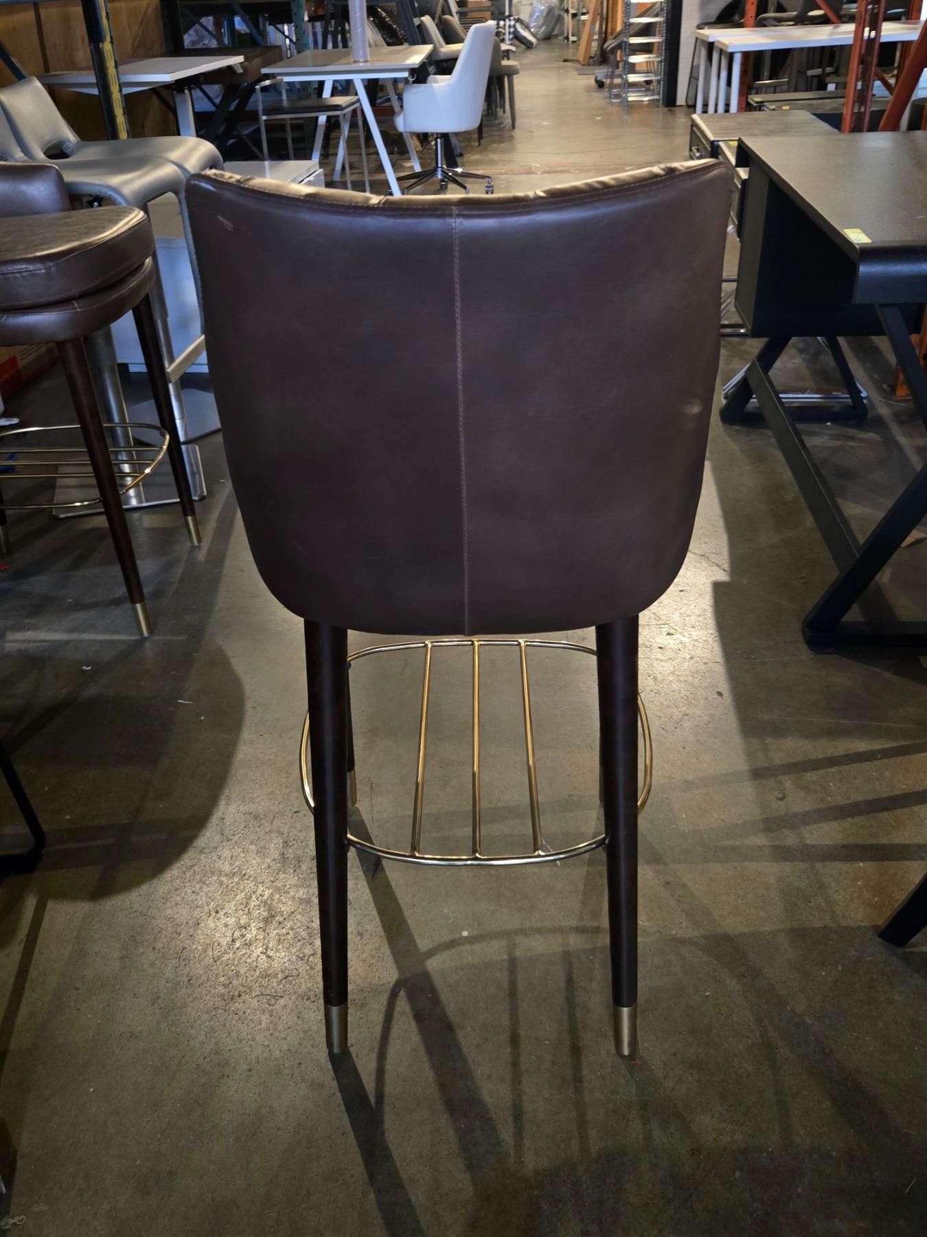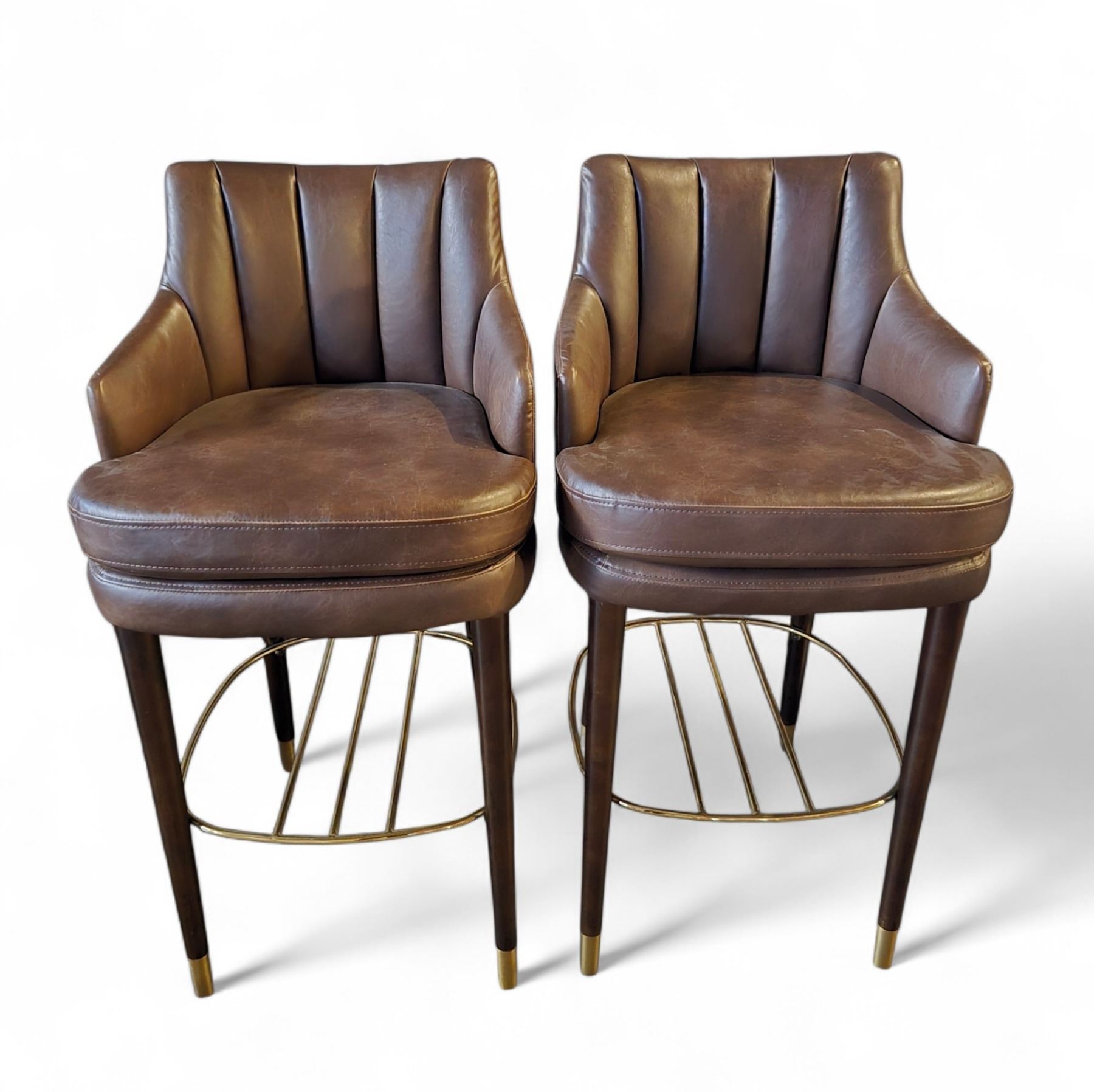 2 pc - Brown Leather Bar Chairs w/ Wooden Legs & Gold Frame