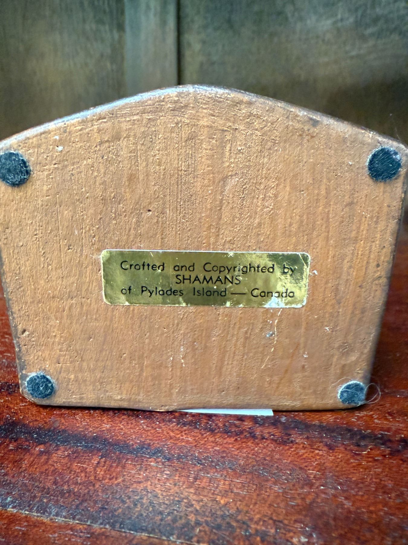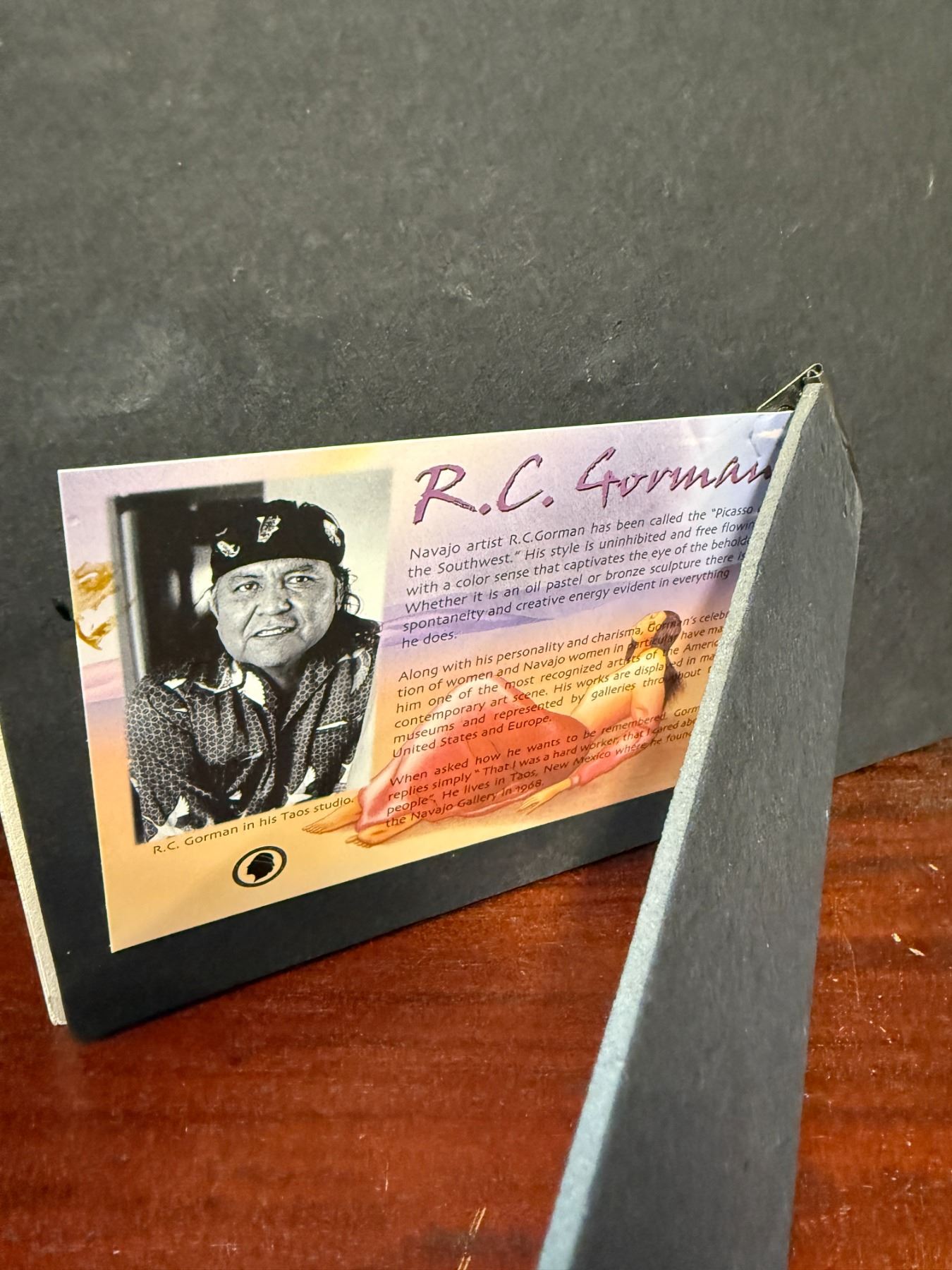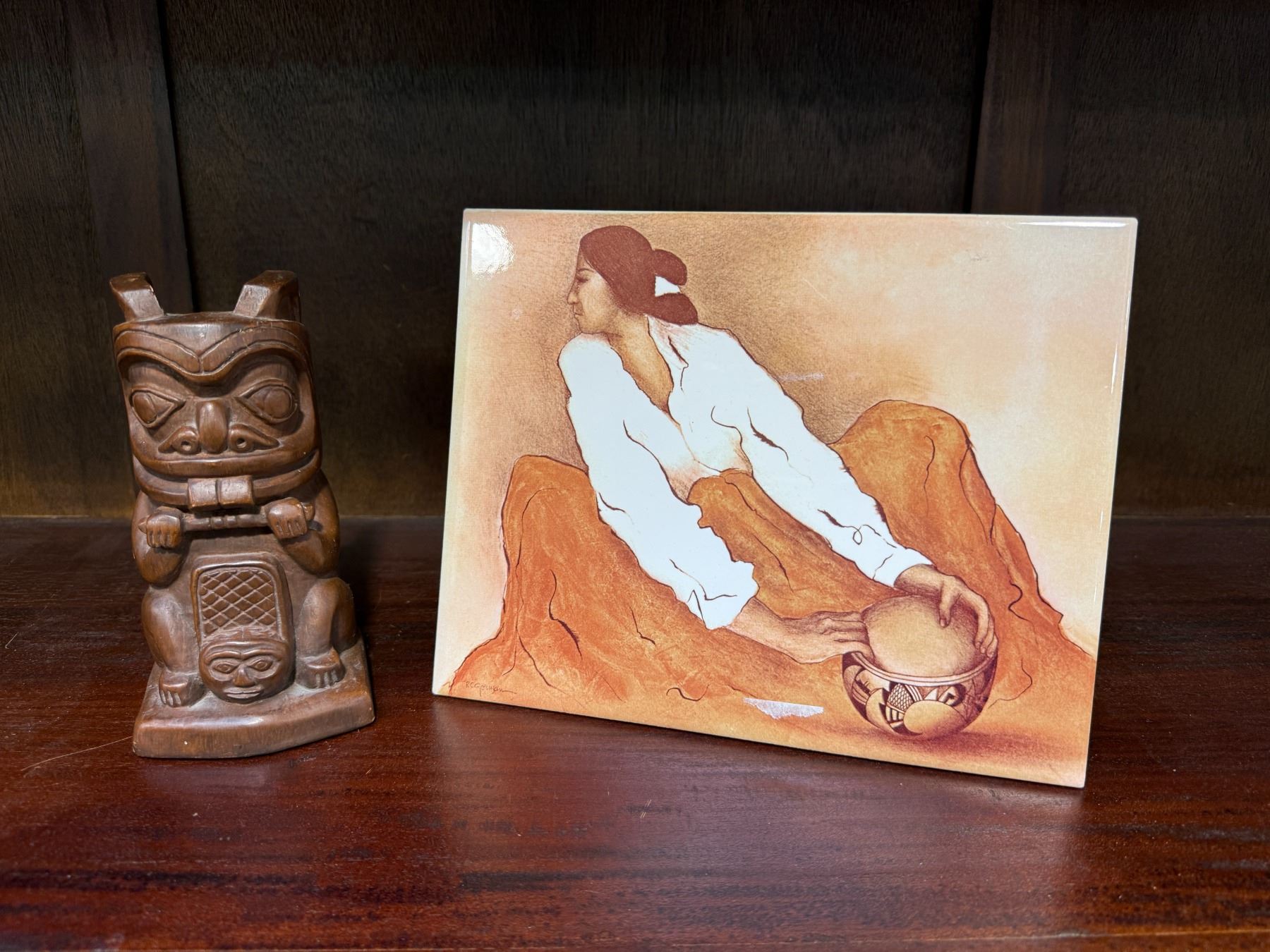 2 pc - Native art - R.C. Gormann Ceramic tile and small wooden totem pole.