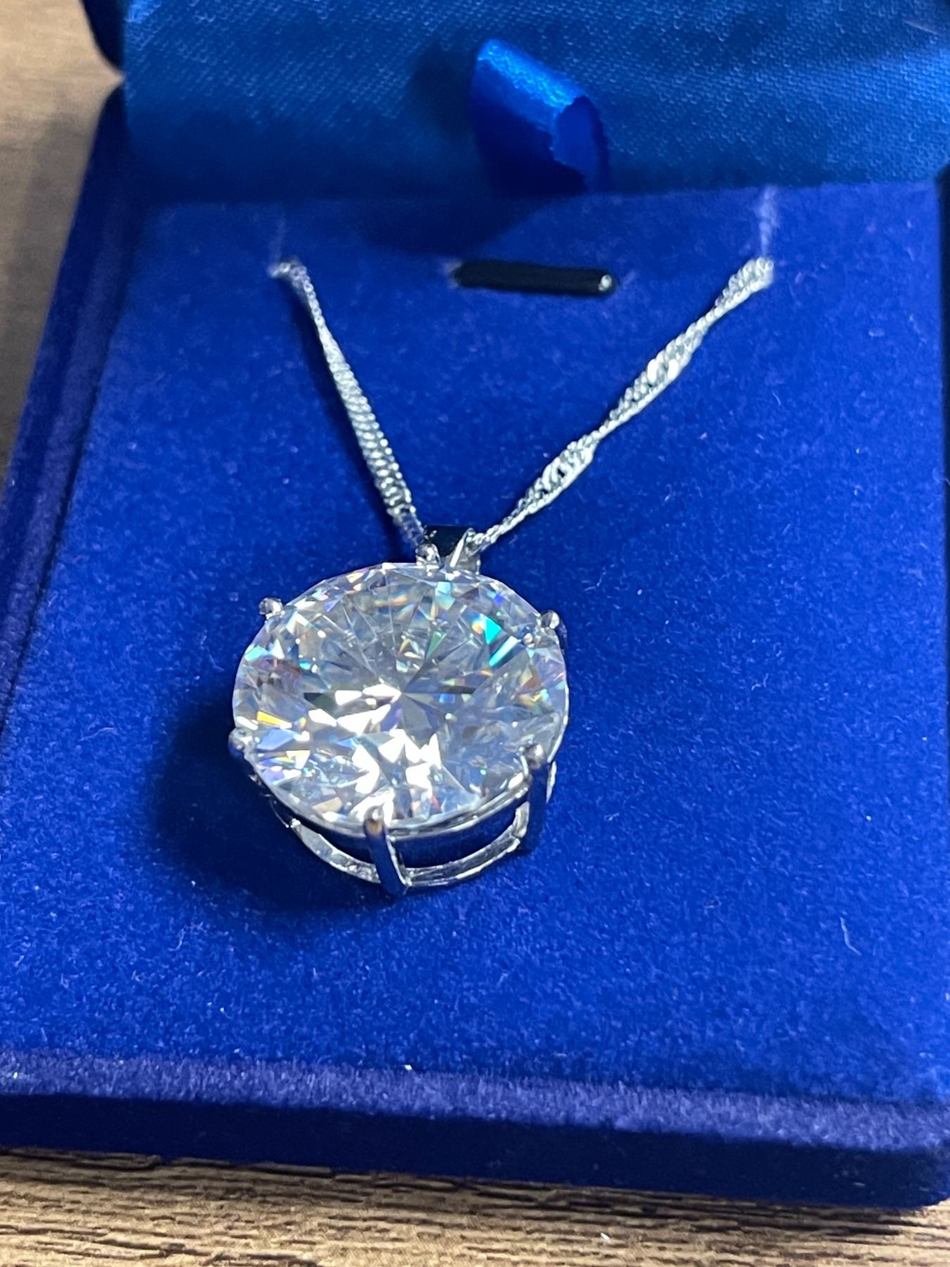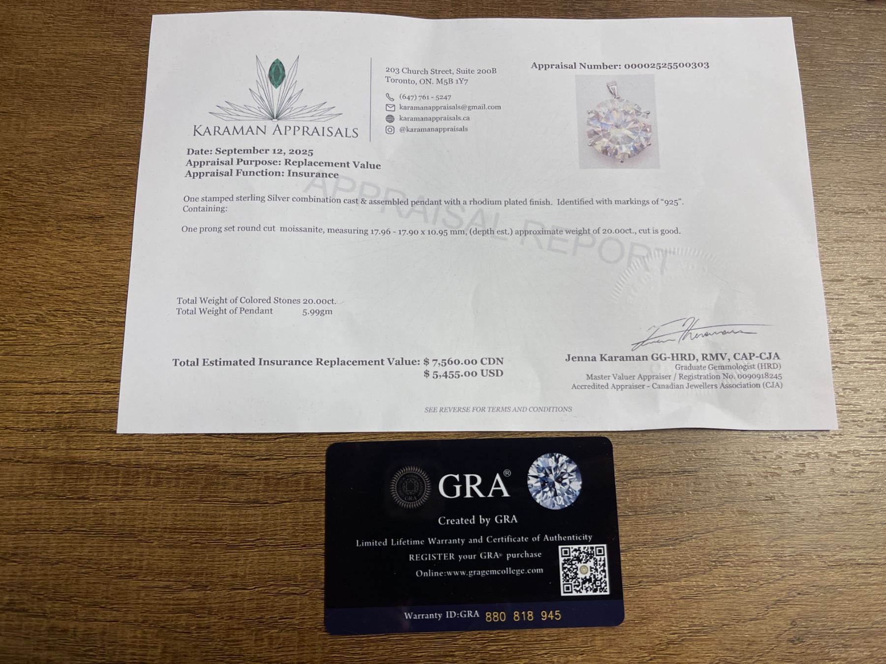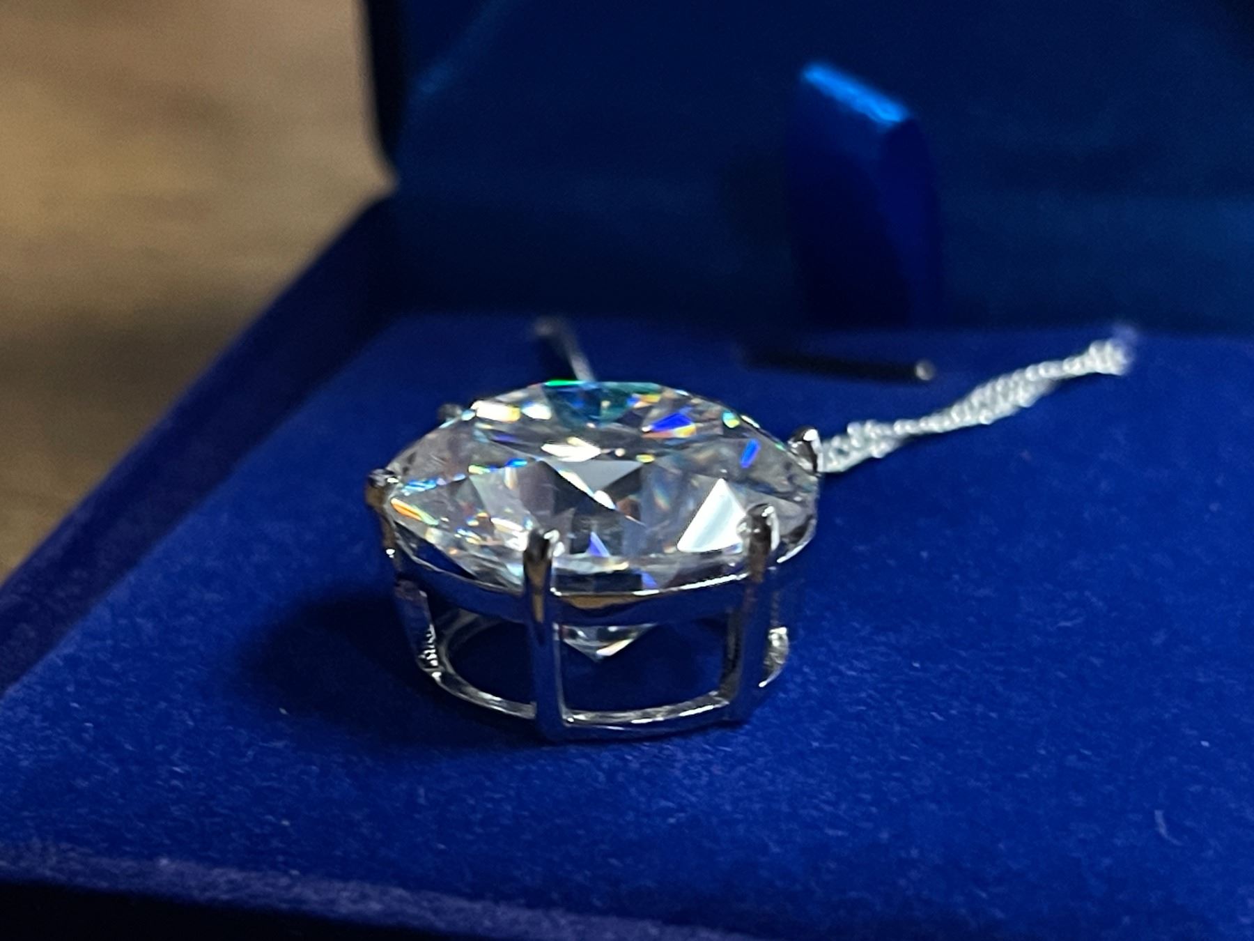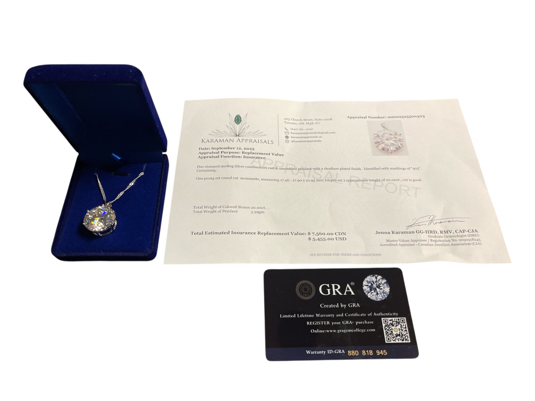 20.00 CT GRA CERTIFIED ROUND BRILLIANT CUT MOISSANITE STONE VVS D COLOR SET IN 6 CLAW BASKET HEAD PENDANT SET IN 925 SILVER RETAIL VALUE $7,560.0