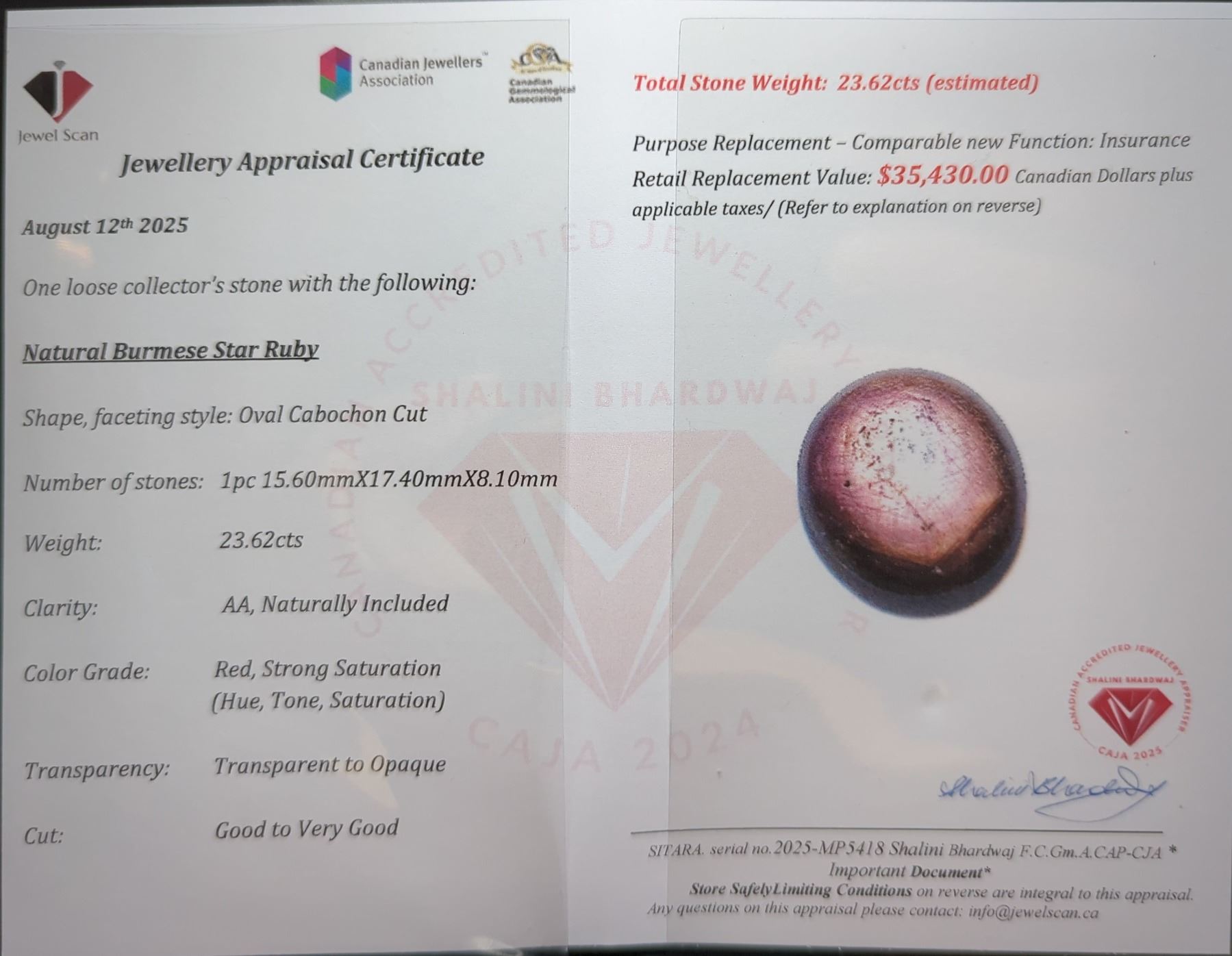23.62 ct Authenticated Red Star Ruby gemstone ($35,430 Appraisal)