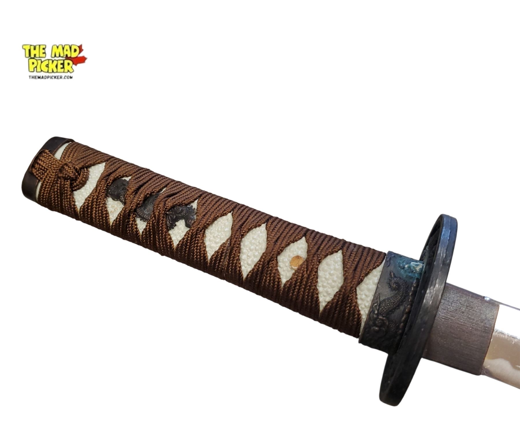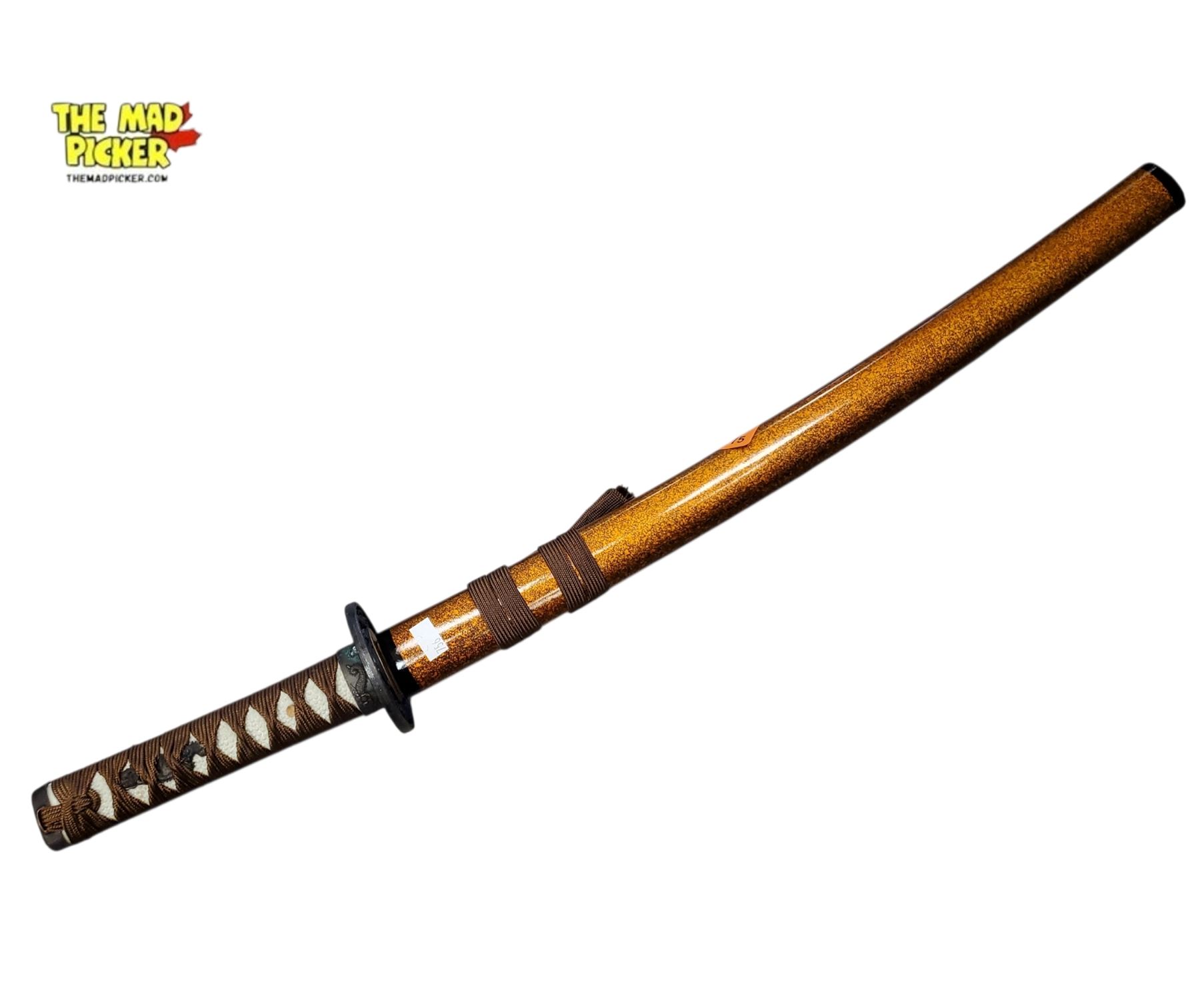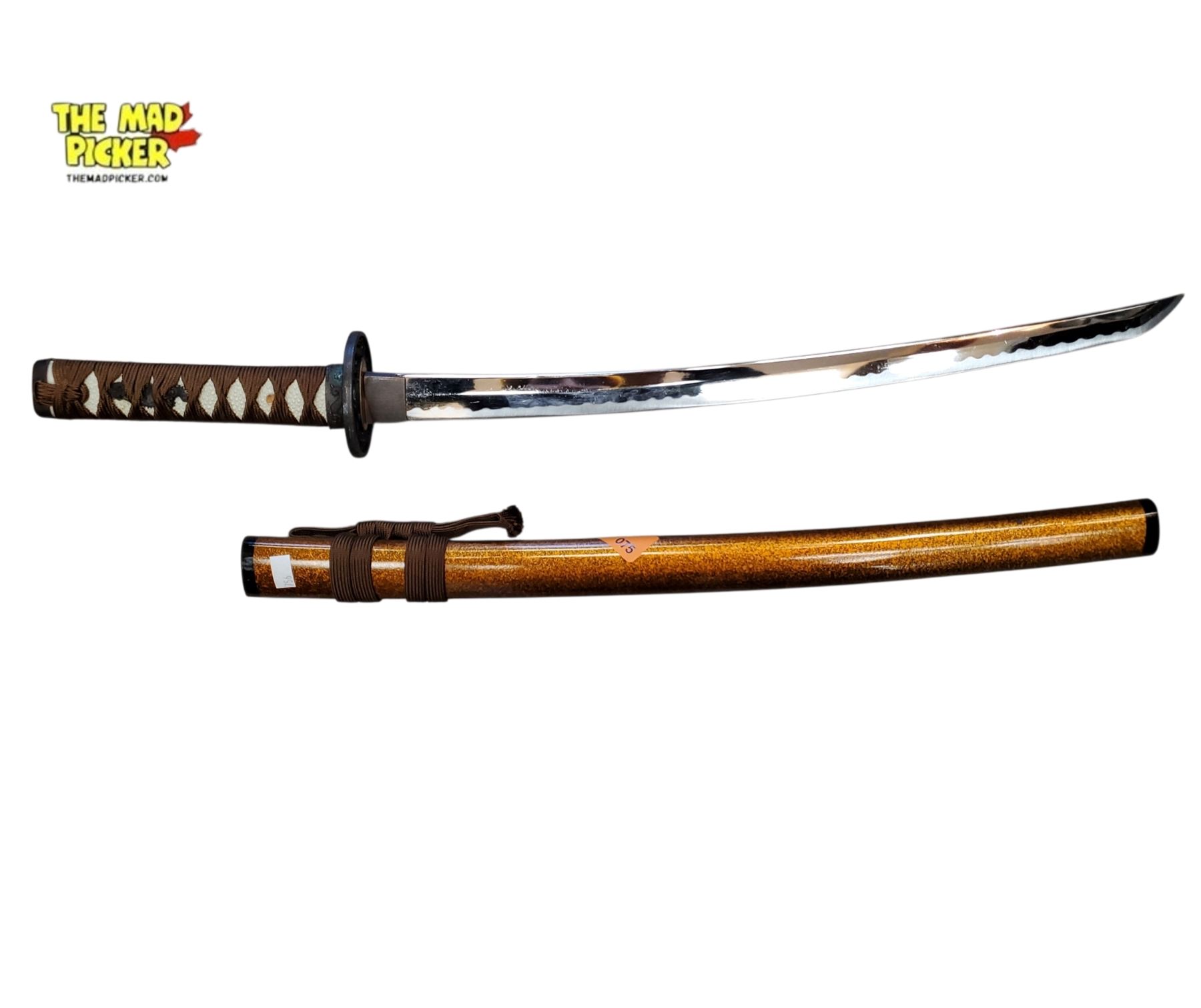 Functional or display replica of a traditional Japanese katana with a curved, single-edged blade, likely hand-forged from high-carbon steel. Includes a brown-wrapped scabbard (saya) and matching handle (tsuka). Styled after historical katanas used by the samurai class in feudal Japan.