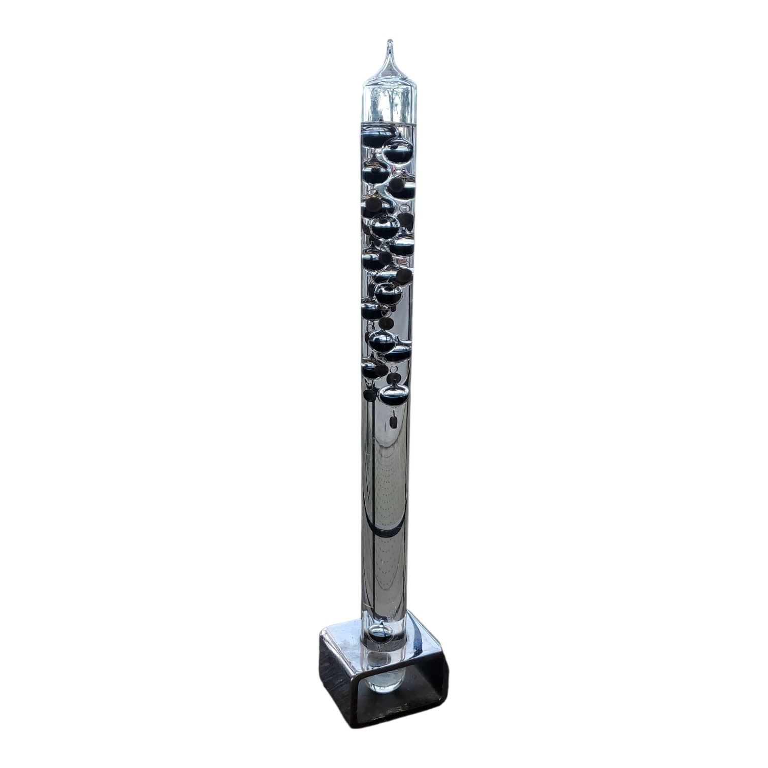 Galileo thermometer measuring 28-Inch tall. Features glass cylinder with floating, calibrated temperature globes that rise or fall based on ambient temperature. Globes are attached to metal tags indicating temperature readings. Item is as pictured.