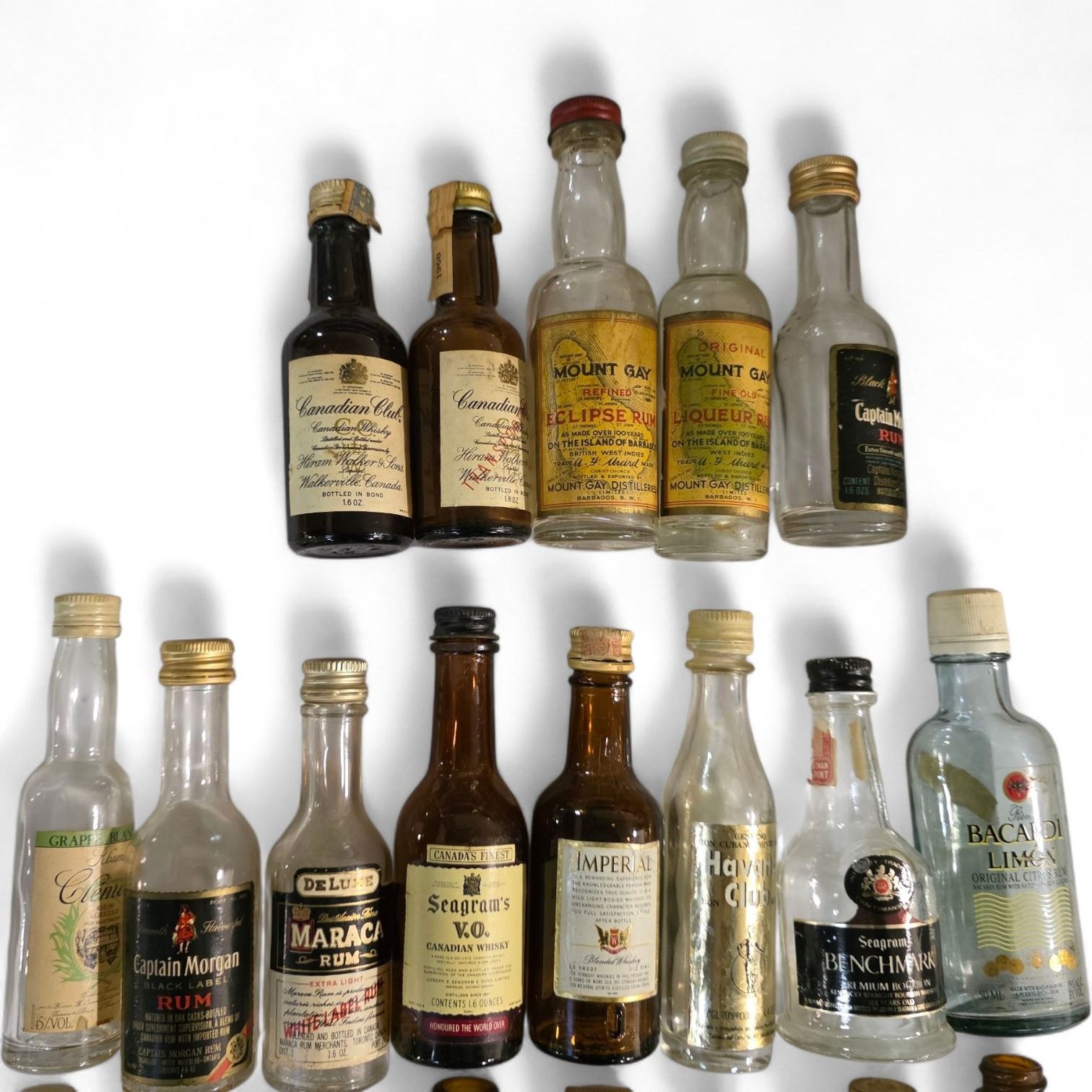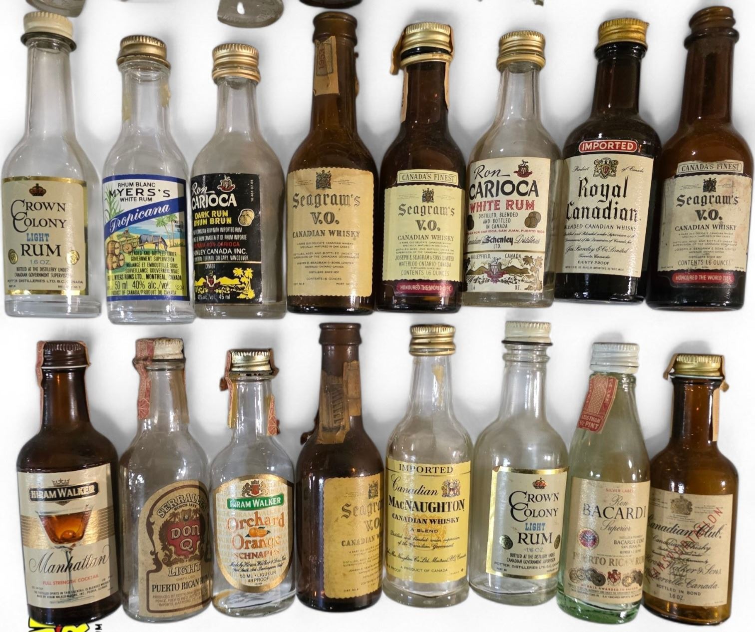 29 Miniature Empty Liquor Bottles - Featuring Brands like Captain Morgan, Mount Gay, Seagram's V.O., and Bacardi