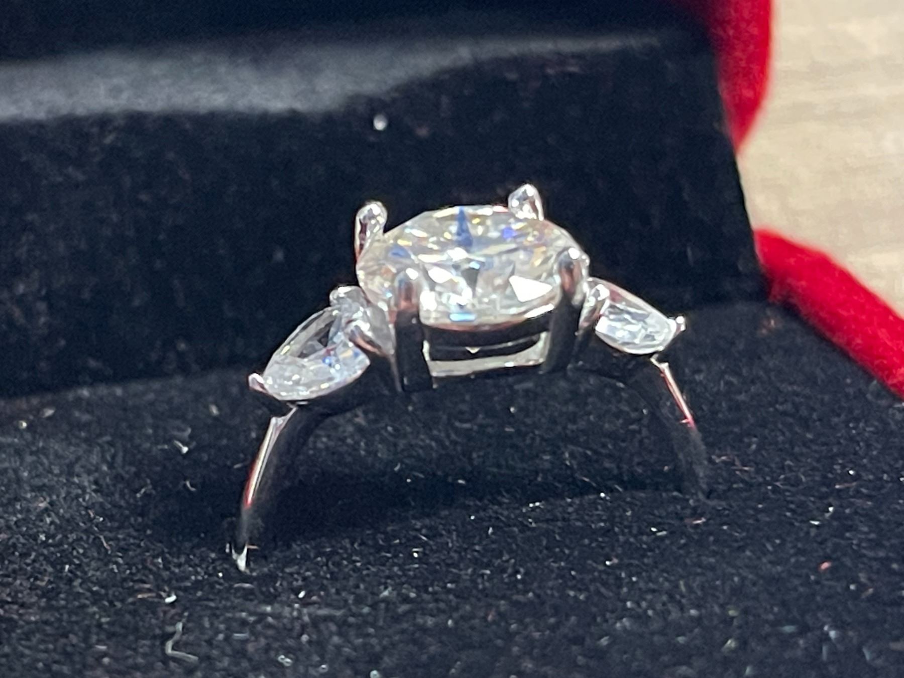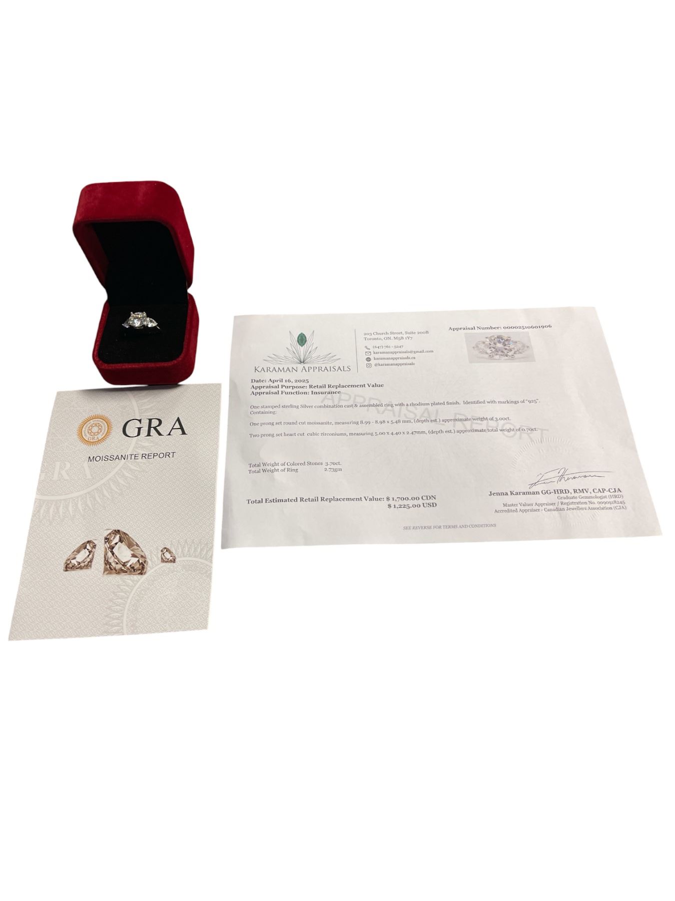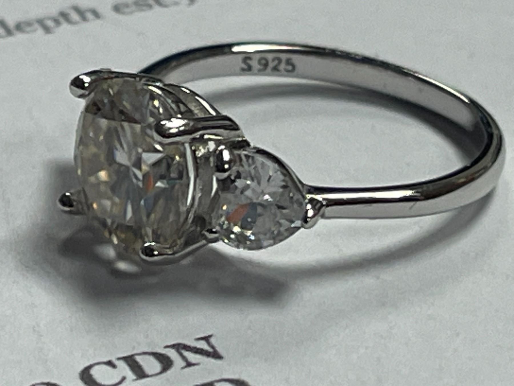 3.00 CT GRA CERTIFIED ROUND BRILLIANT CUT MOISSANITE STONE VVS D COLOR WITH A HEART SHAPED CUBIC ZIRCONIA SET ON EITHER SIDE SET IN 925 SILVER RING SIZE 7 RETAIL VALUE $1,700.00
