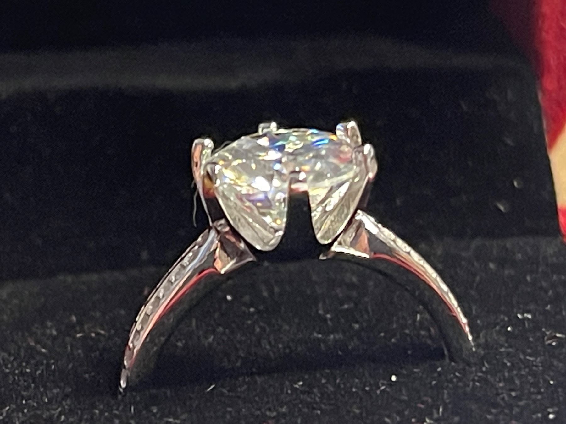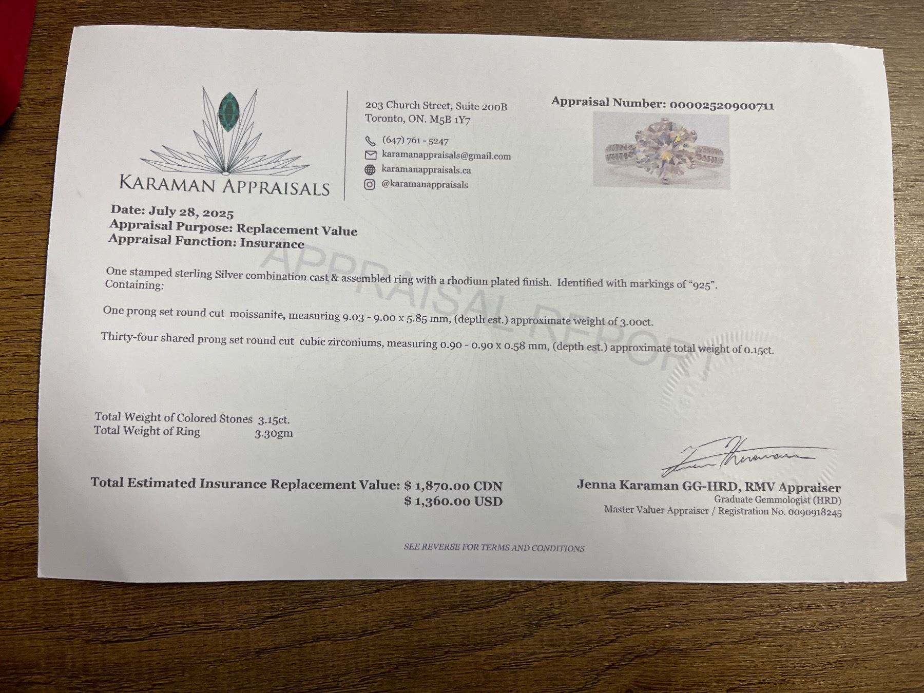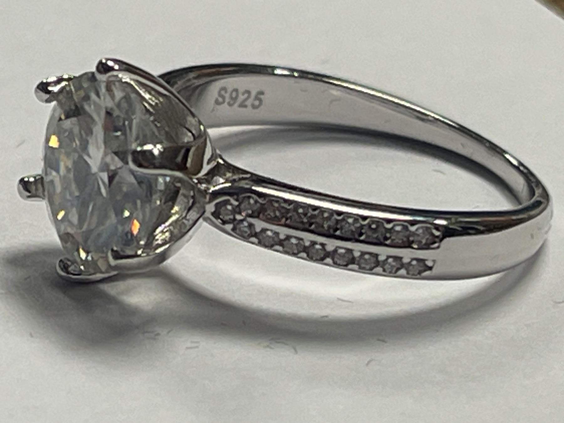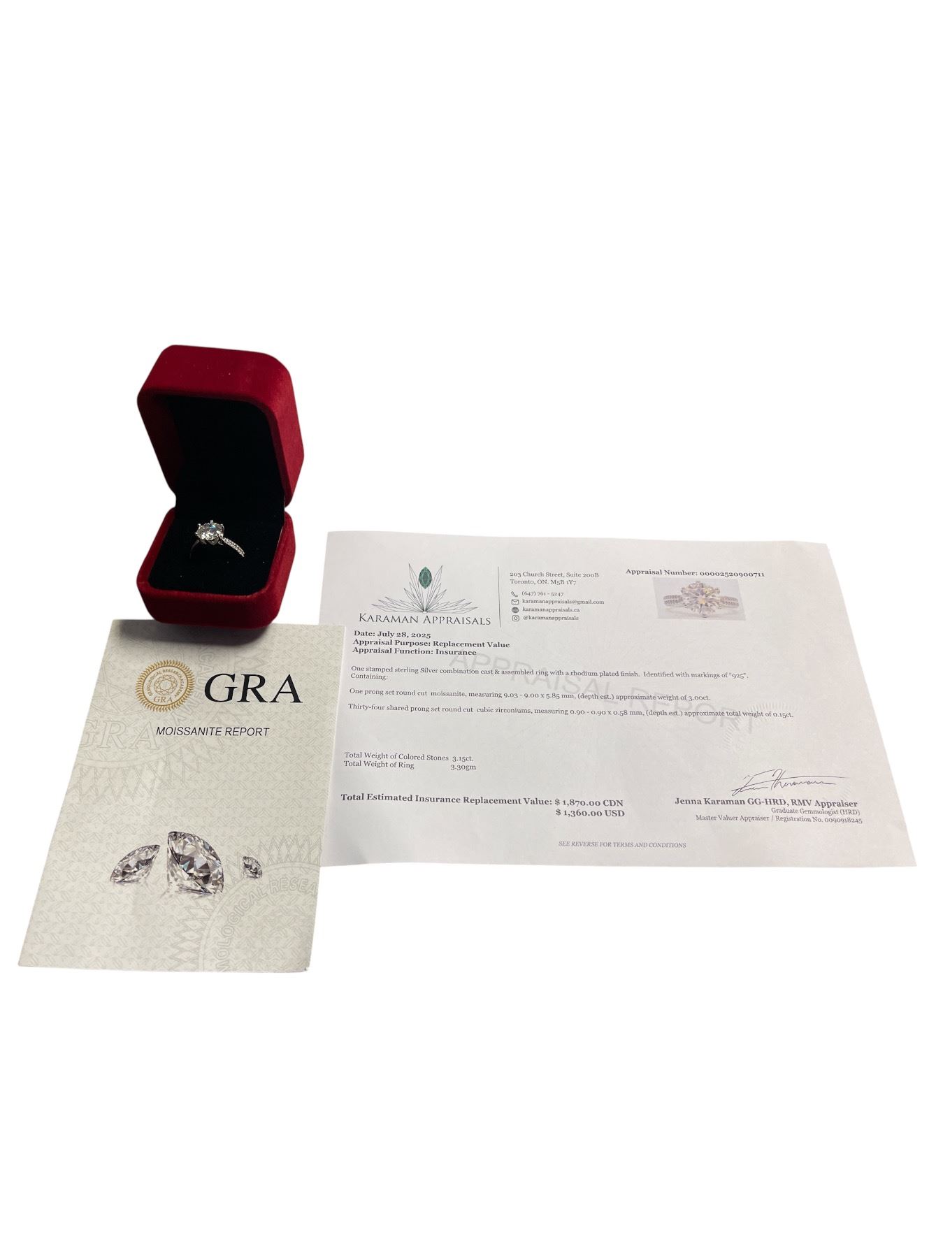 3.00 CT GRA CERTIFIED ROUND BRILLIANT CUT MOISSANITE STONE VVS DARK GREEN COLOR WITH 12 ROUND BRILLIANT CUT CUBIC ZIRCONIA SET IN SHANKS SET IN 925 SILVER RING SIZE 7 RETAIL VALUE $1,800.00