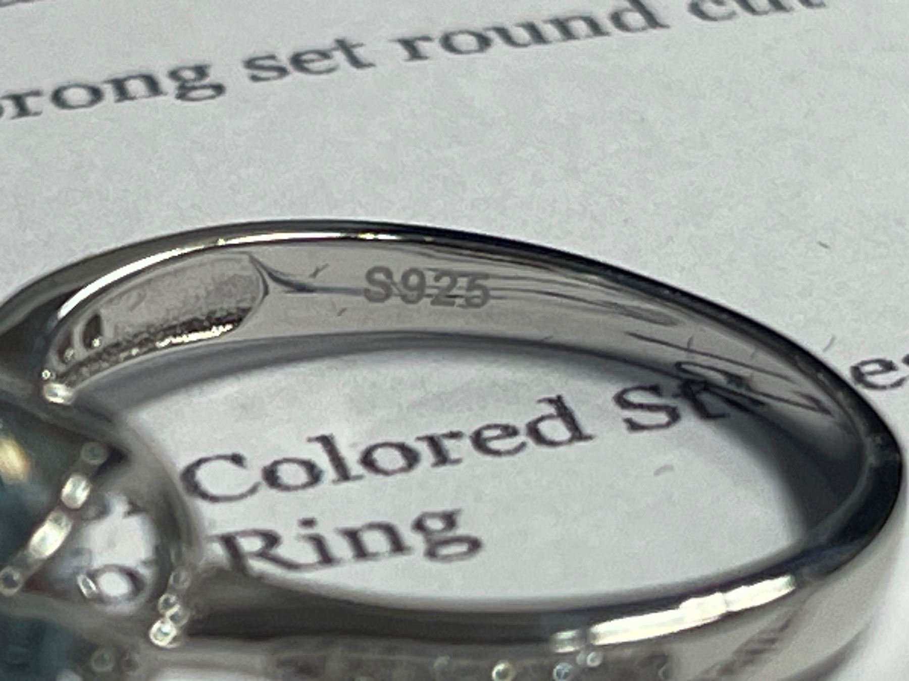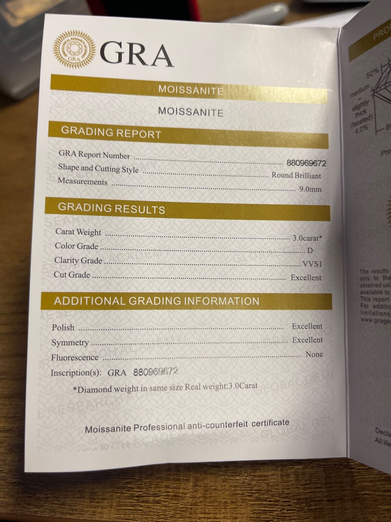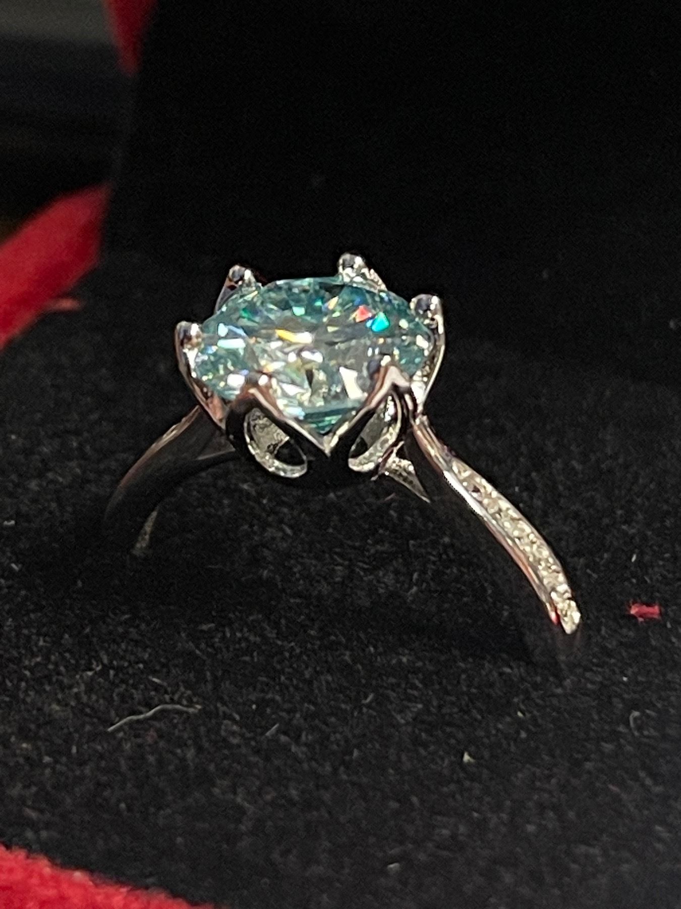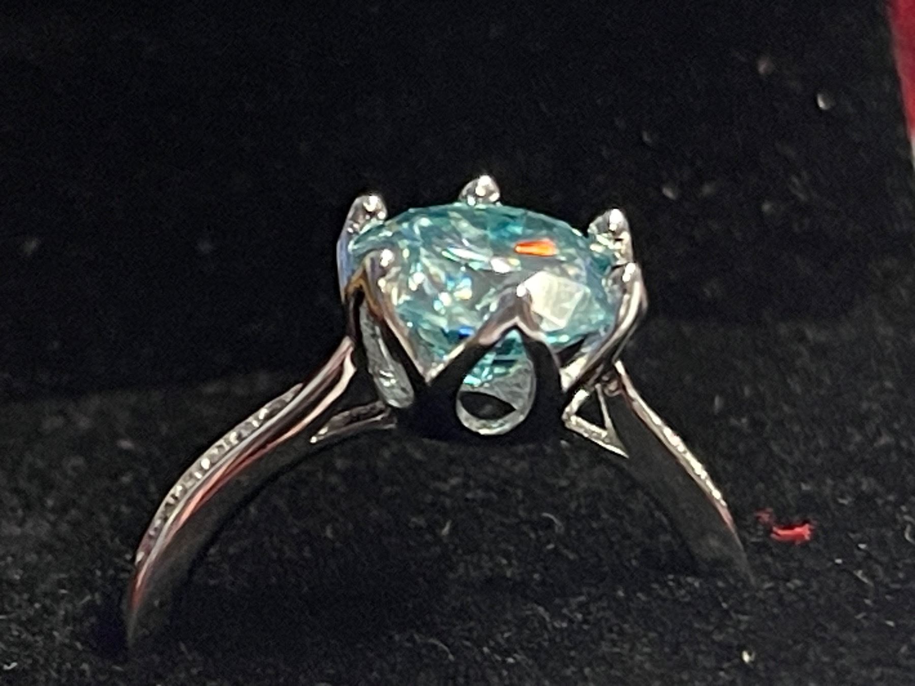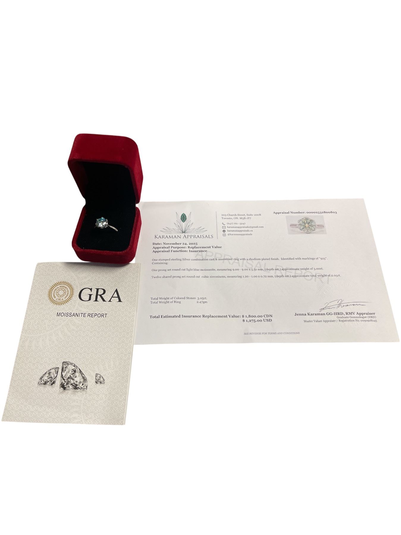 3.00 CT GRA CERTIFIED ROUND BRILLIANT CUT MOISSANITE STONE VVS LIGHT BLUE COLOR WITH 12 ROUND BRILLIANT CUT CUBIC ZIRCONIA SET IN SHANKS SET IN 925 SILVER RING SIZE 7.25 RETAIL VALUE $1,800.00