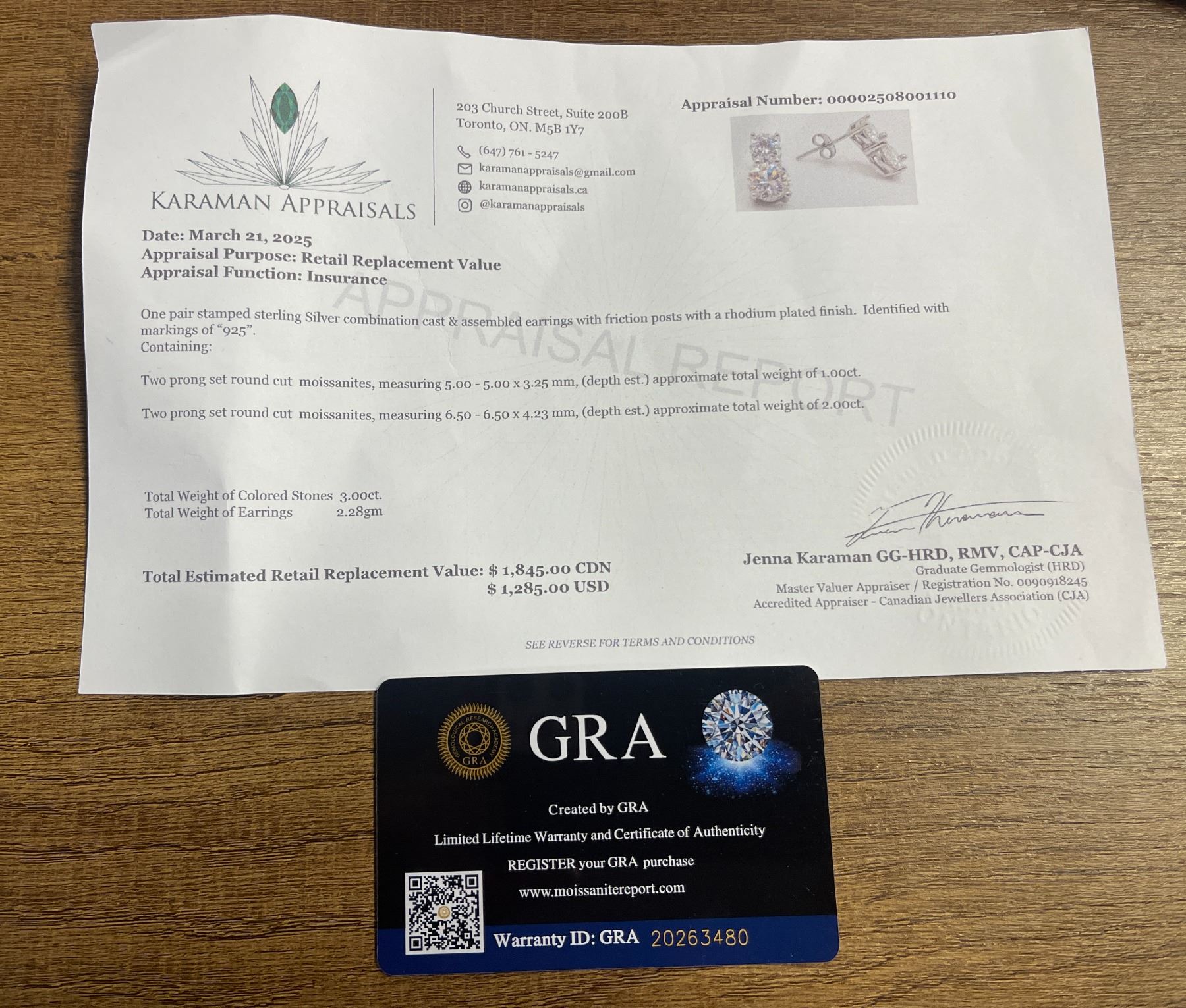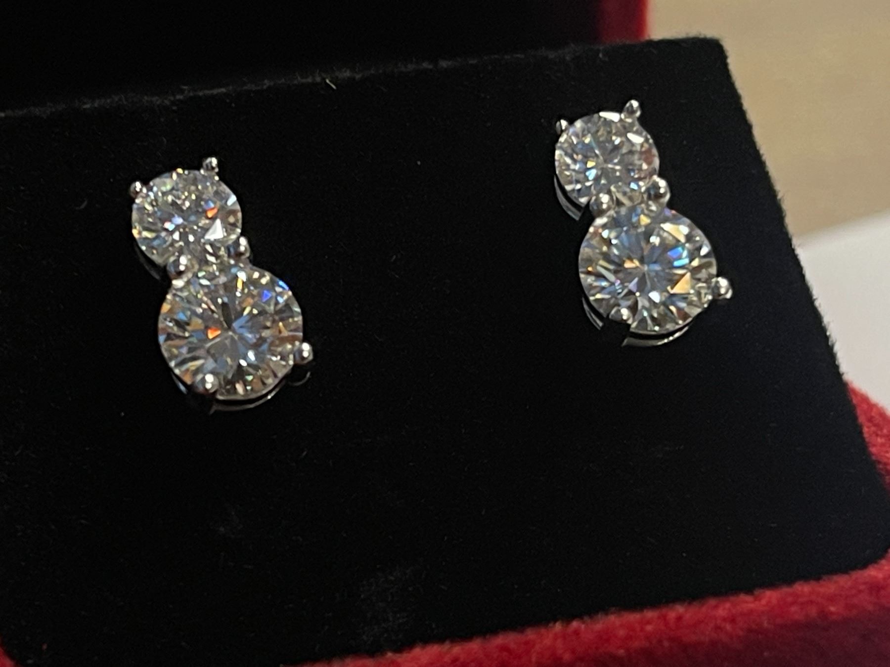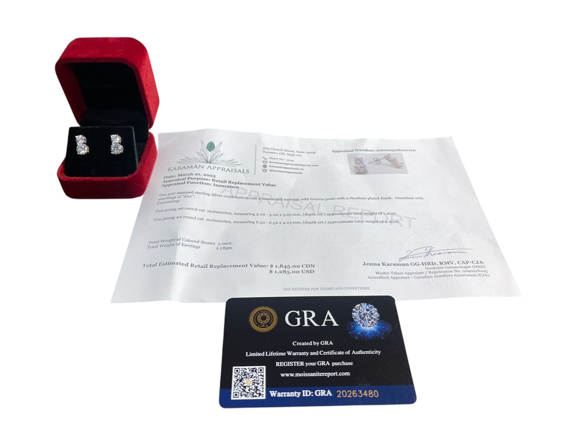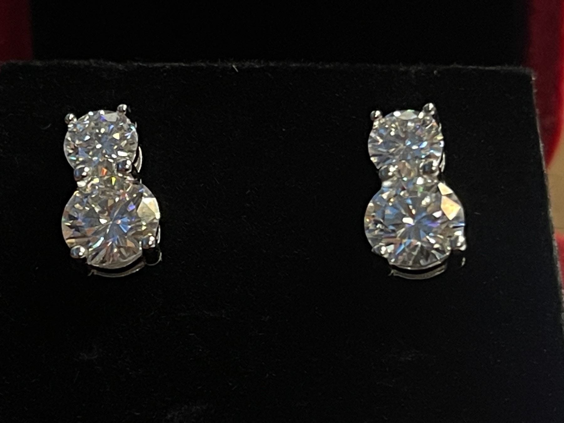 3.00 CT TW GRA CERTIFIED ROUND BRILLIANT CUT MOISSANITE STONES VVS D COLOR WITH 0.50 CT SET ABOVE A 1.00 CT SET IN CONNECTED EARRING SET IN 925 SILVER EARRINGS RETAIL VALUE $1,845.00