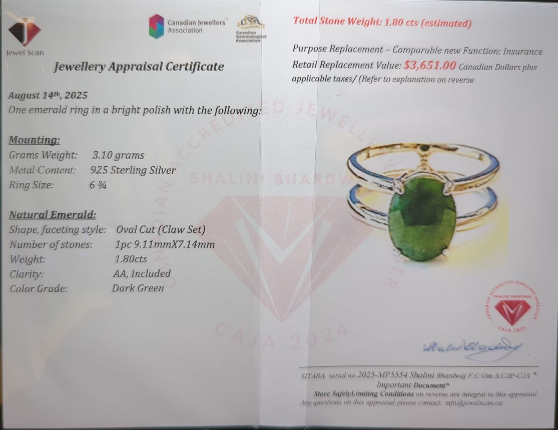 3.1 ct Authenticated Silver Emerald gemstone RIng ($3,651 Appraisal)