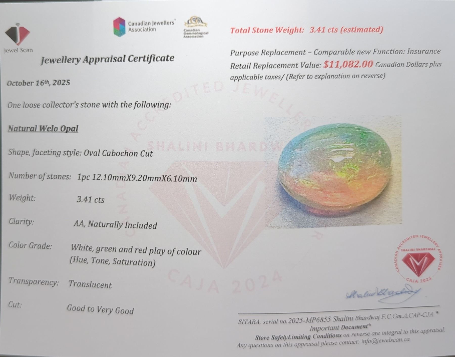 3.41 ct Certified Welo Opal gemstone ($11,082 Appraisal)