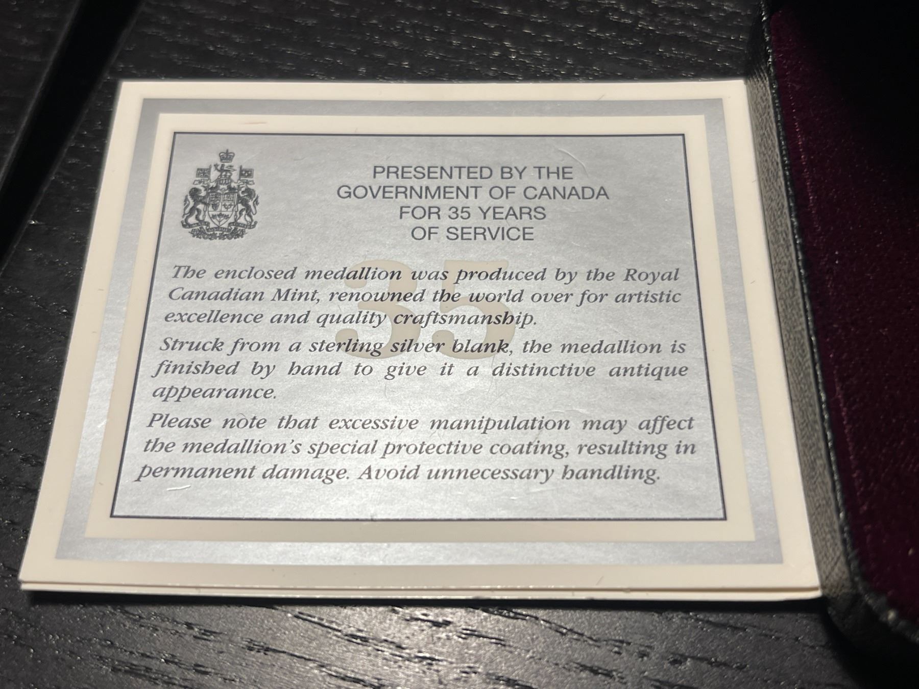 3.5 Oz Sterling Silver Government of Canada 35 Year Service Medal Awarded to Ralph G. Einer - In original holder with certificate
