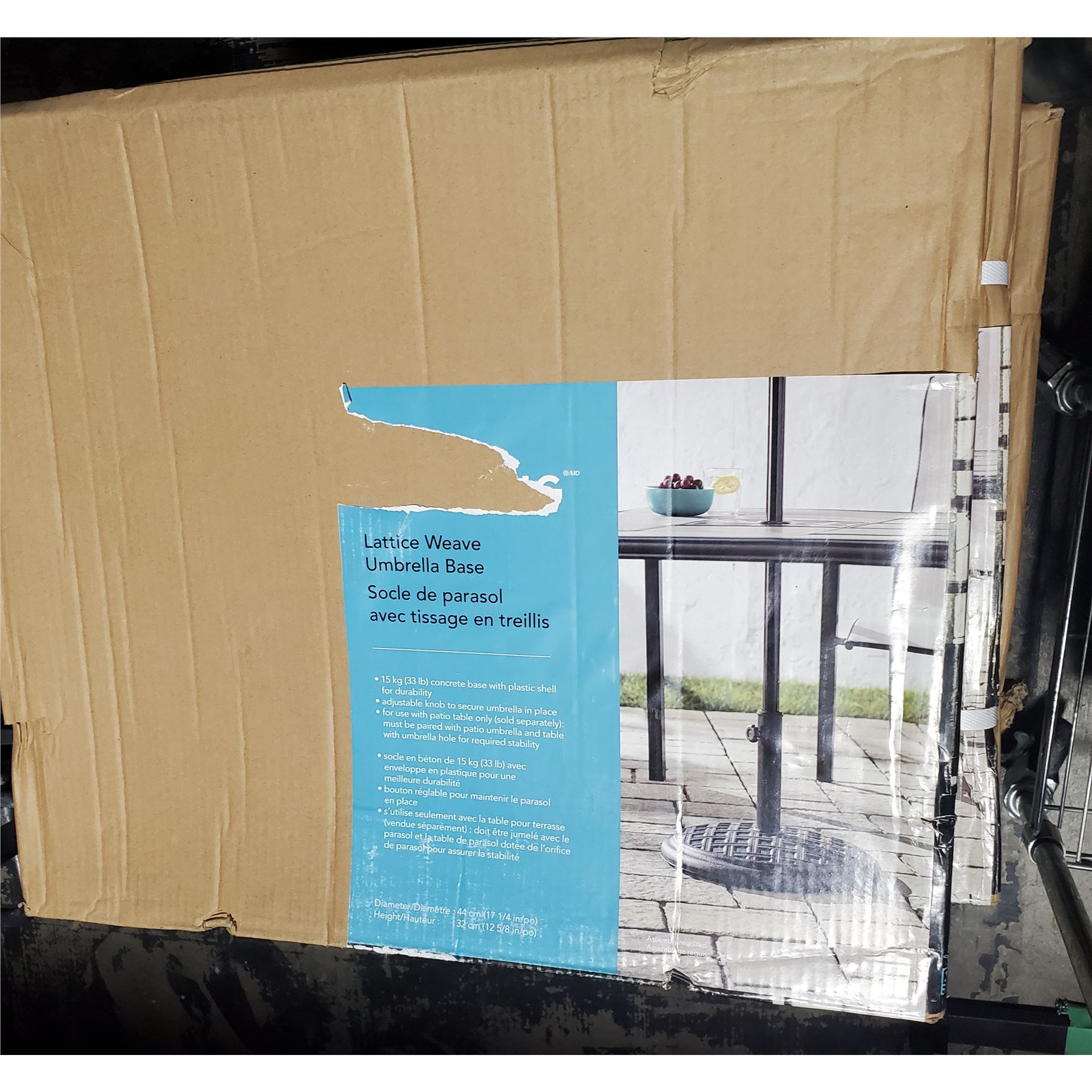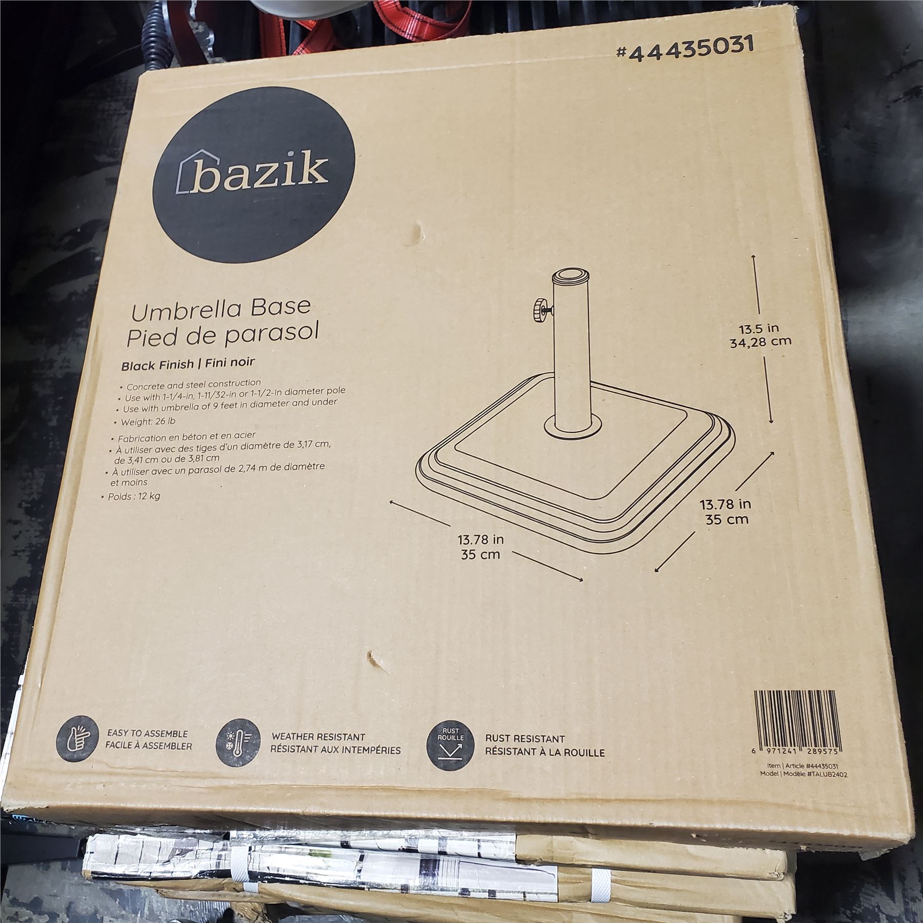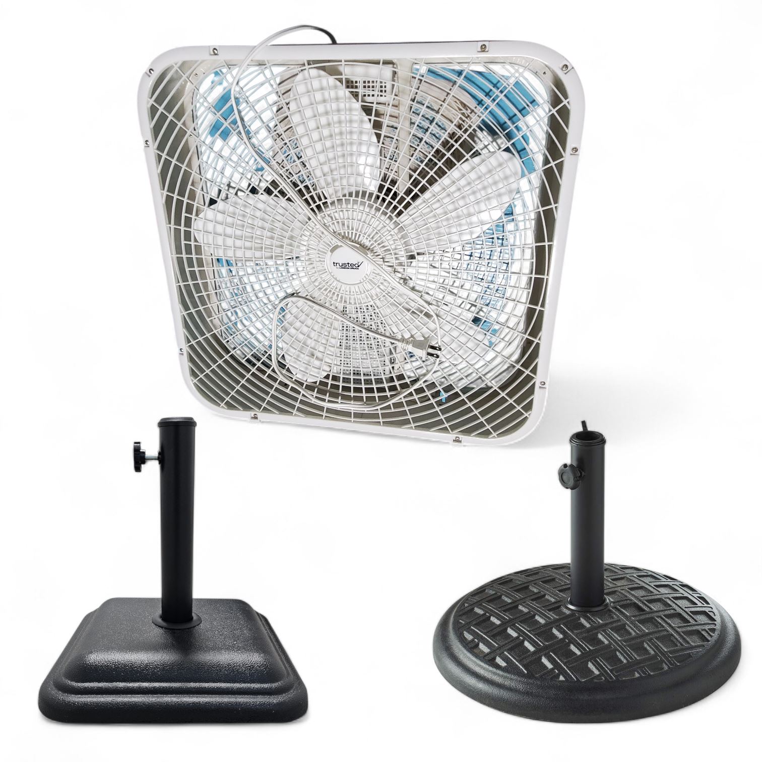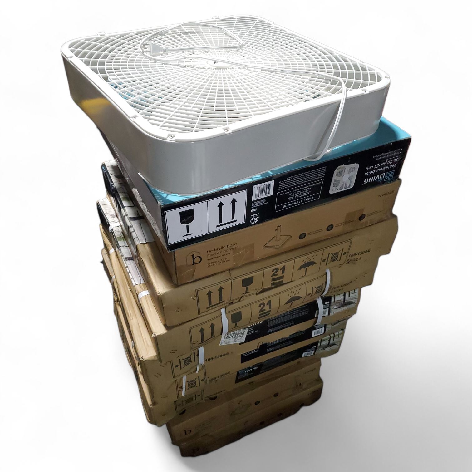 3 Bazik Patio Umbrella Bases (44435031), 5 For Living Umbrella Bases, and 2 For Living 51 cm Fans