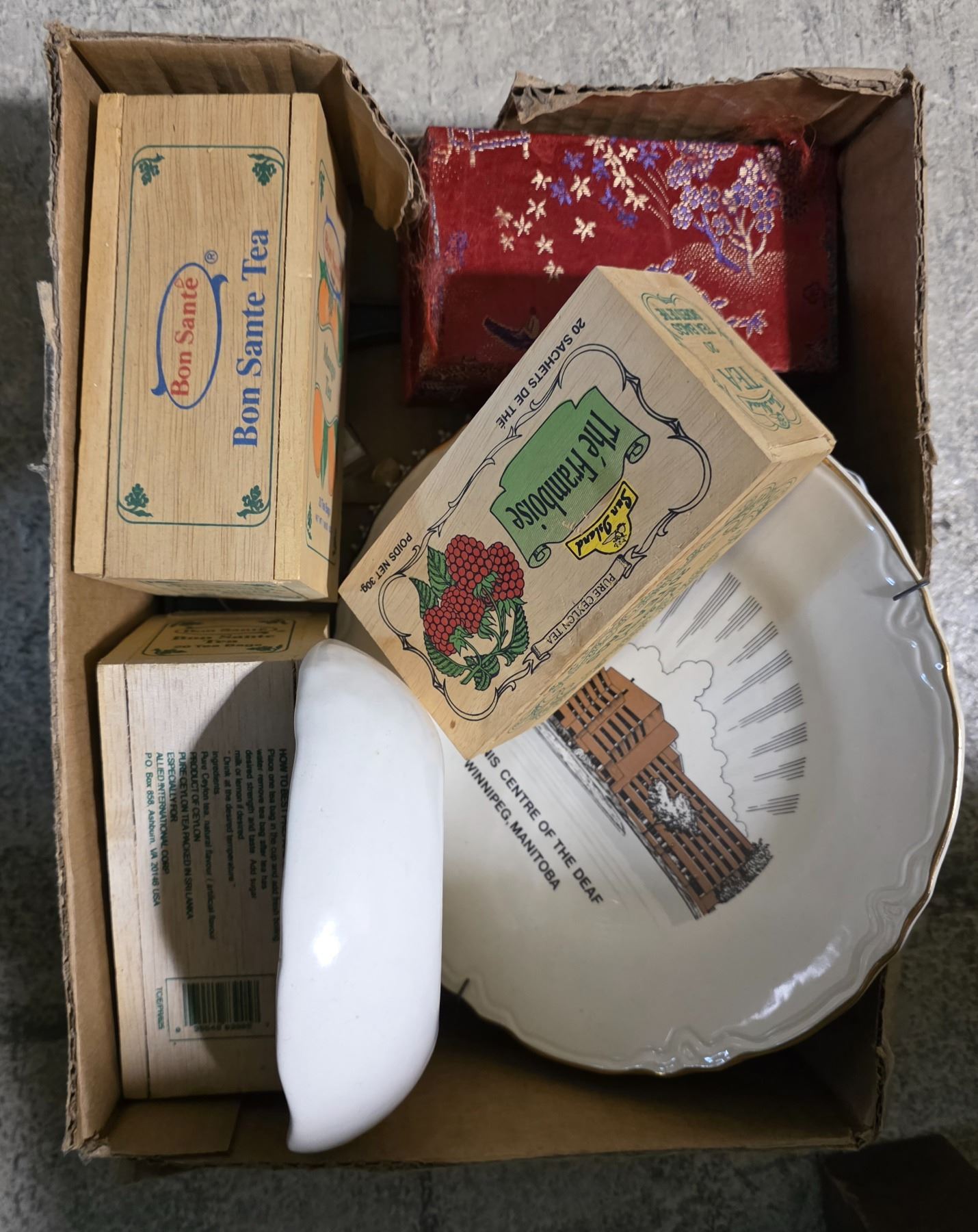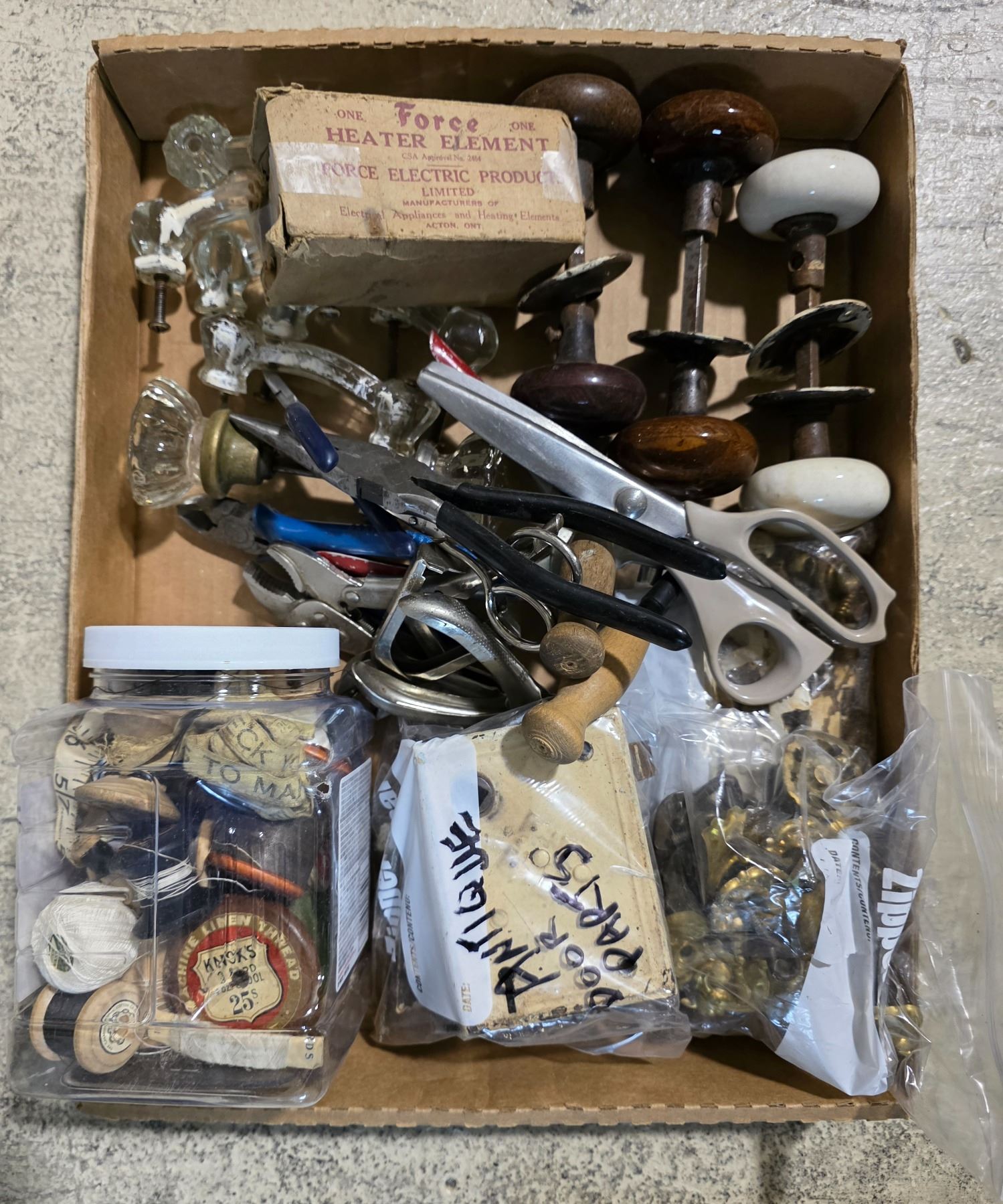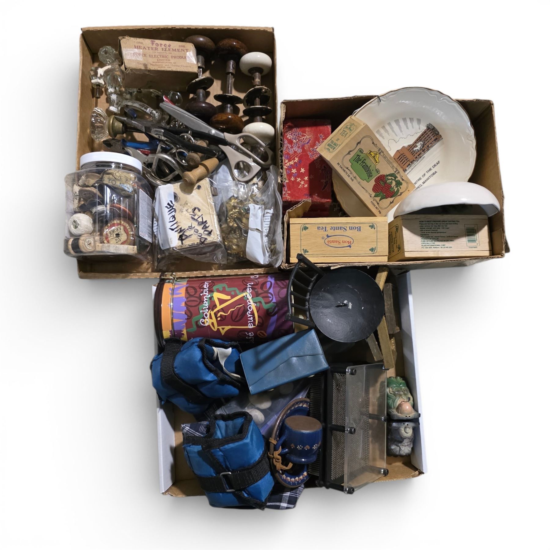3 Box Lots of Vintage China, Thread Spools, Kitchen Goods and More