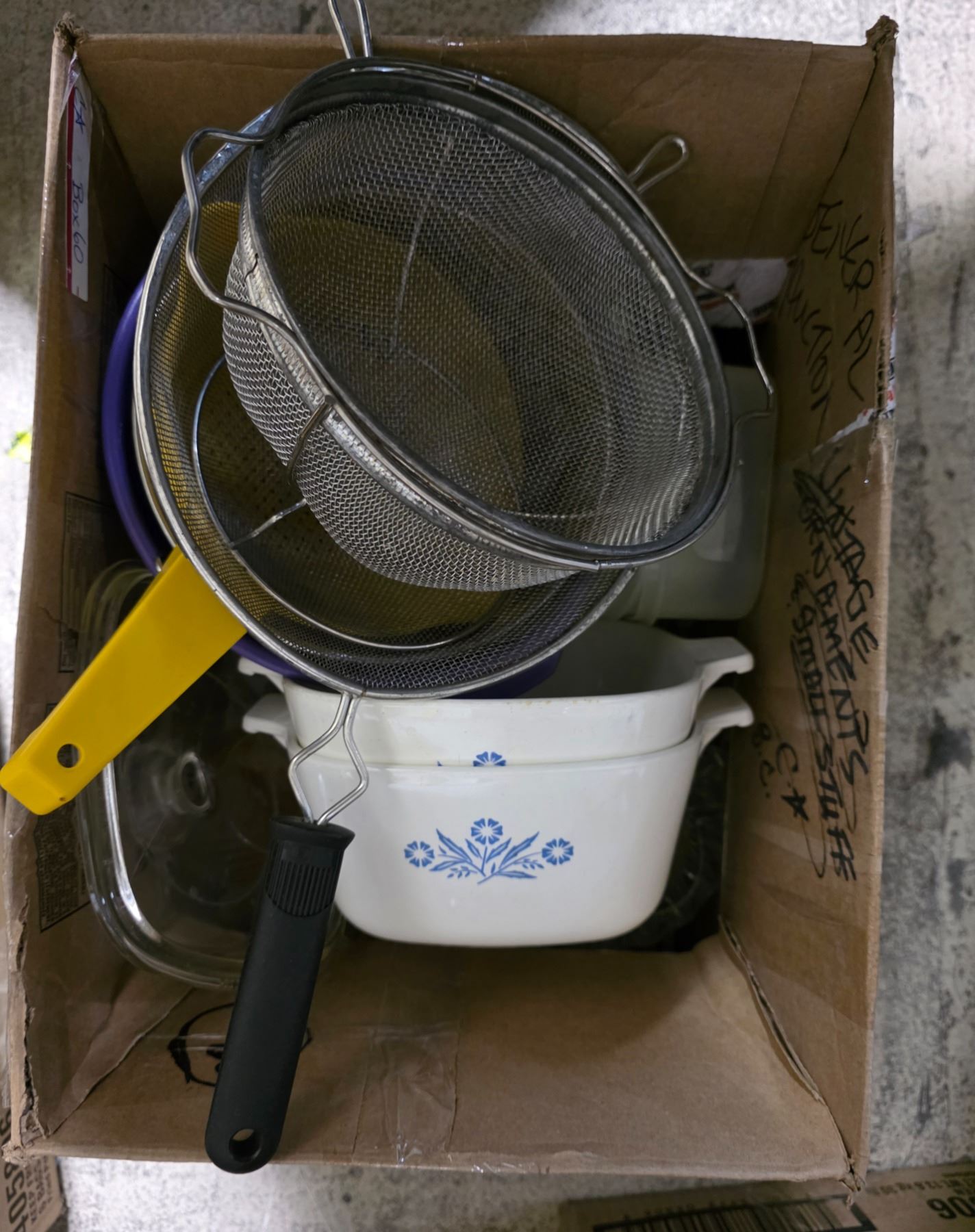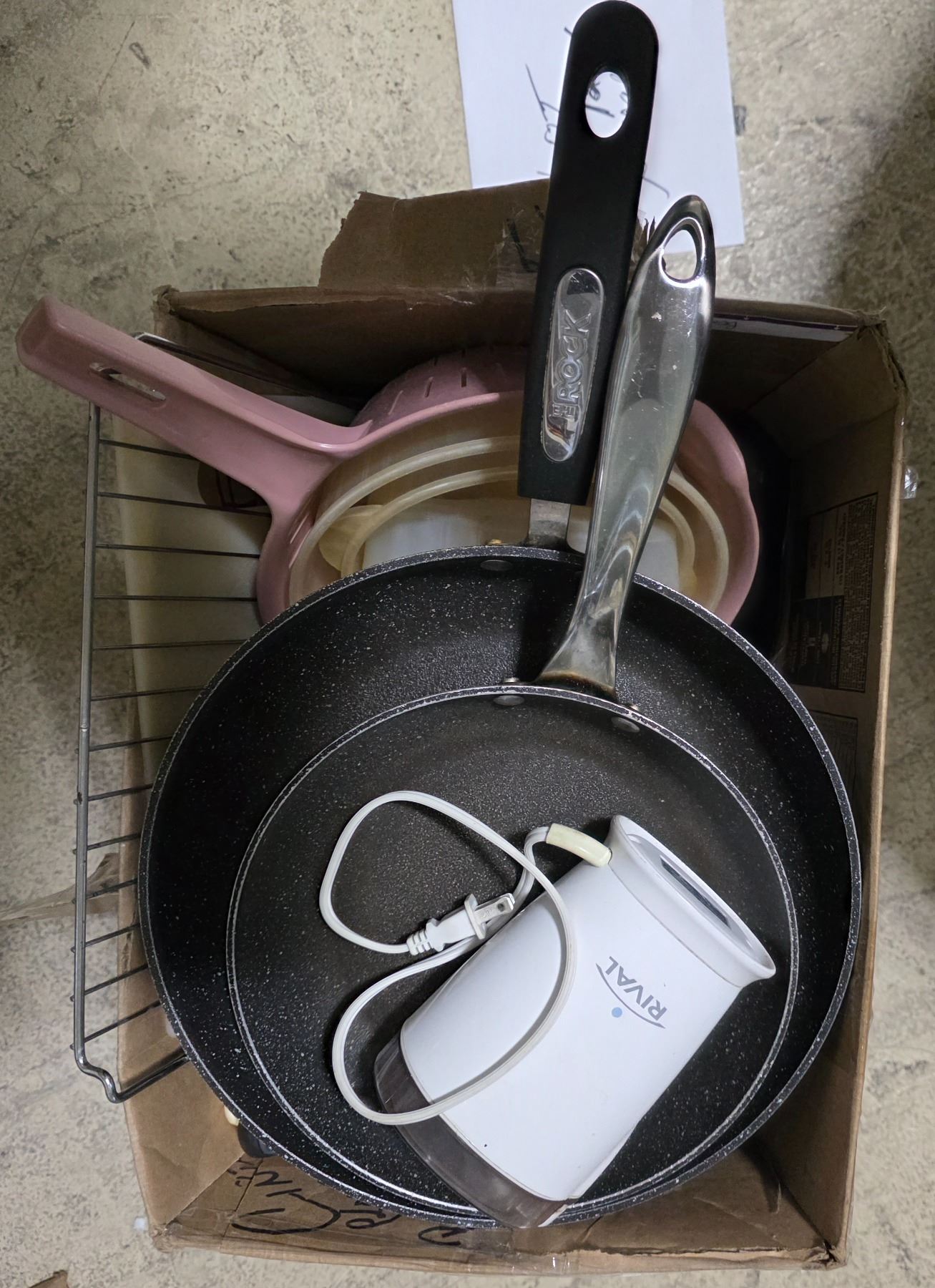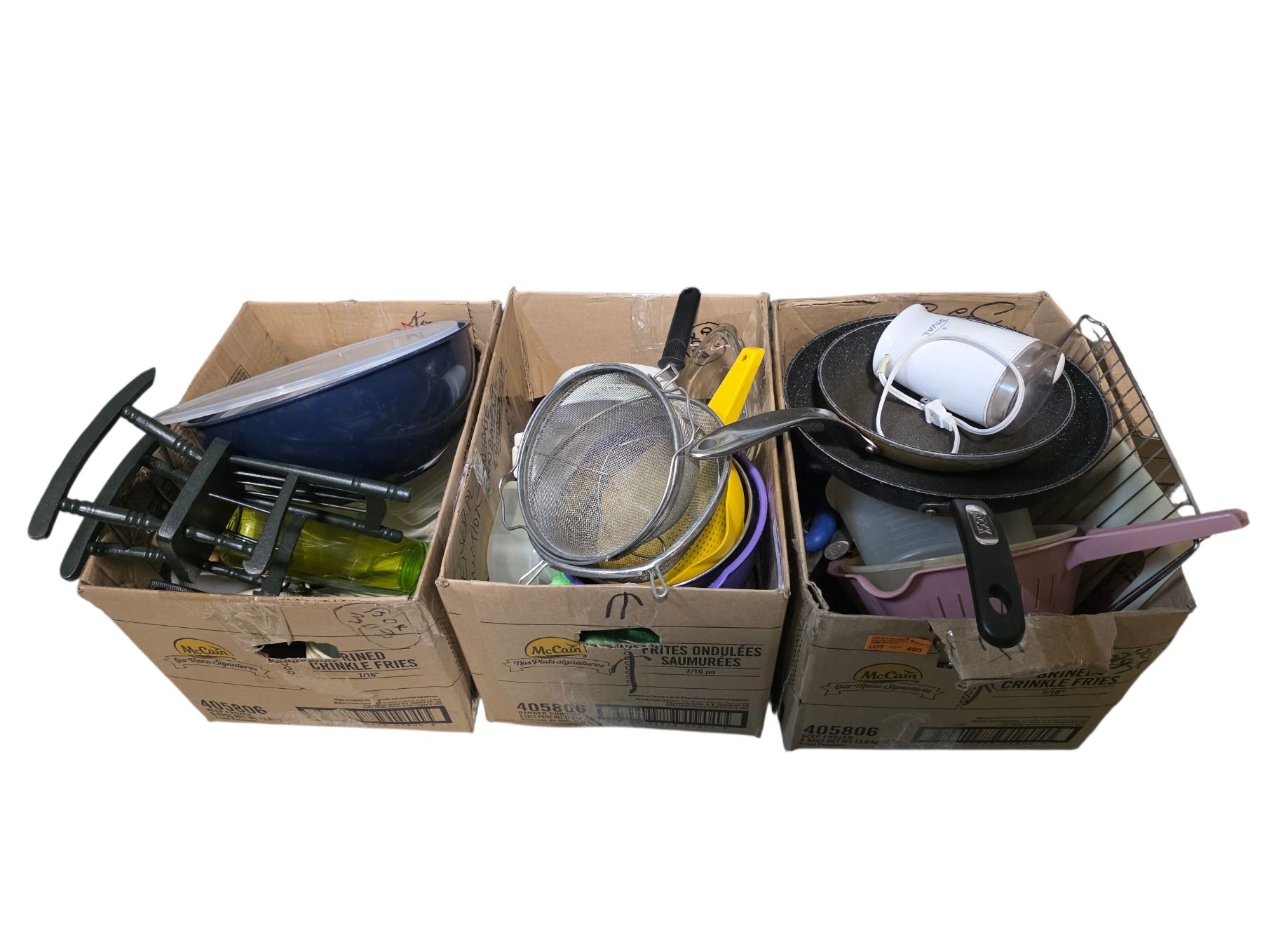 3 Boxes of Assorted Kitchen Gadgets and Pots - Preowned
