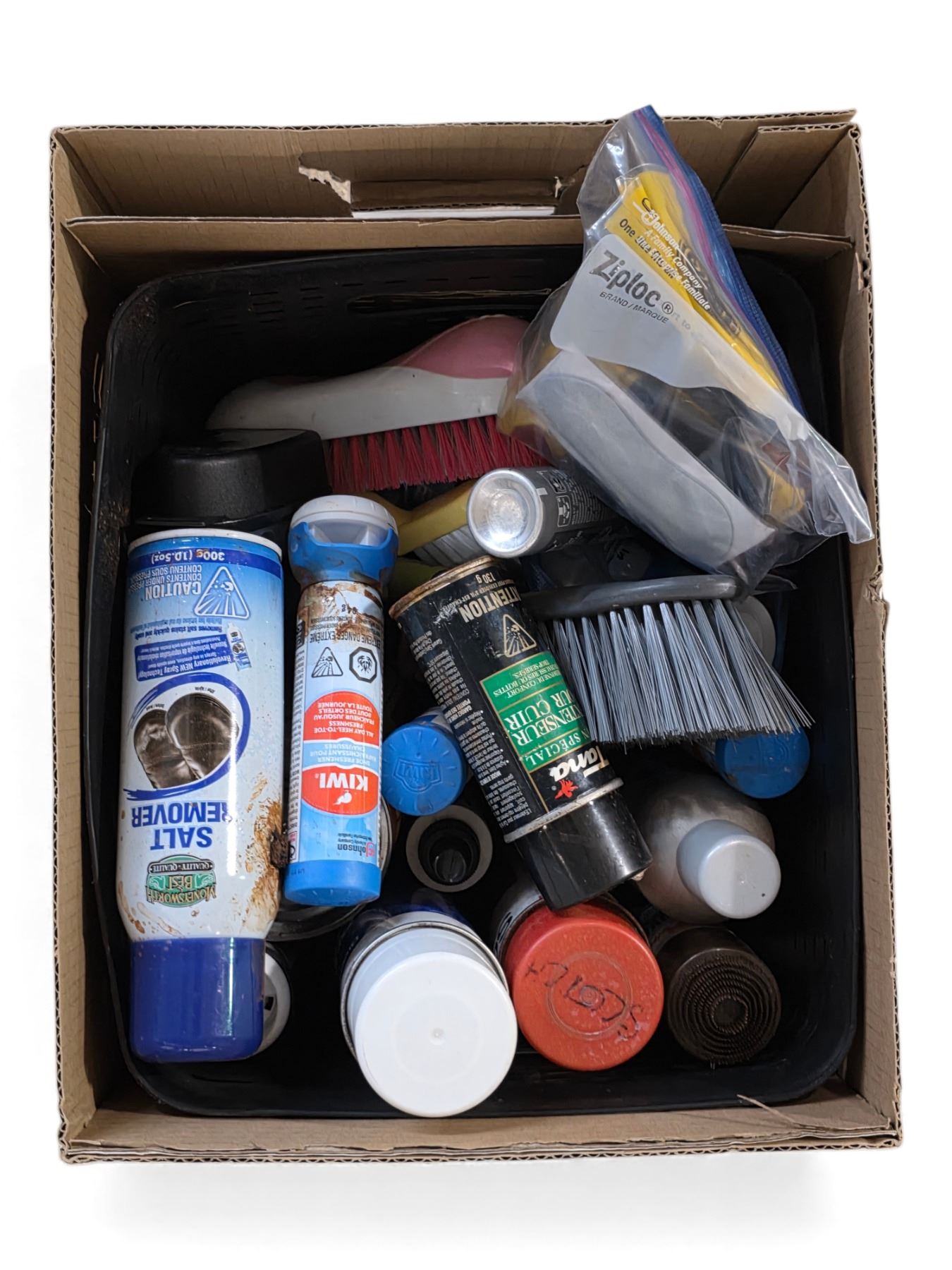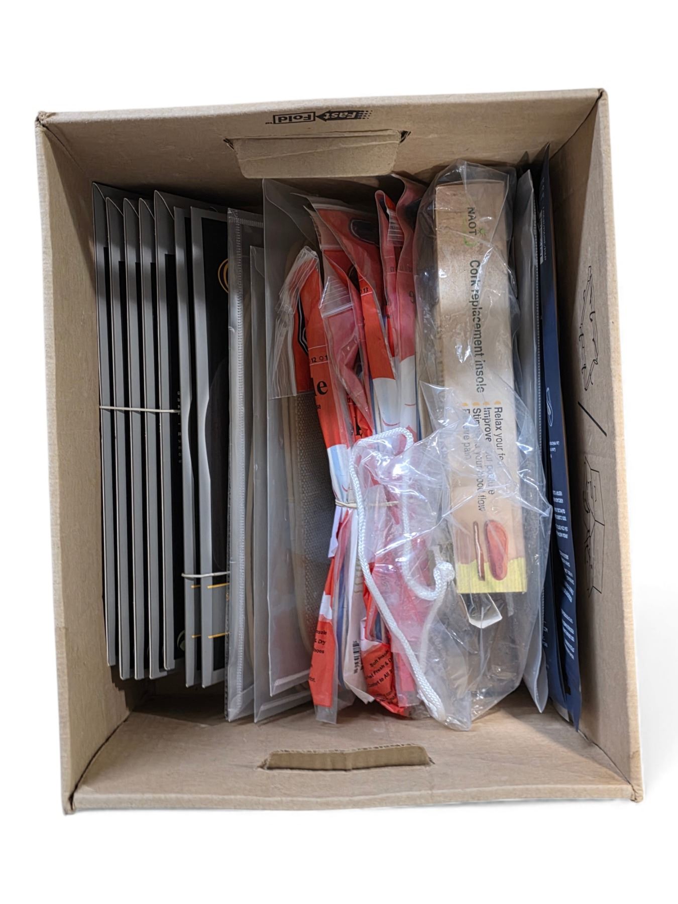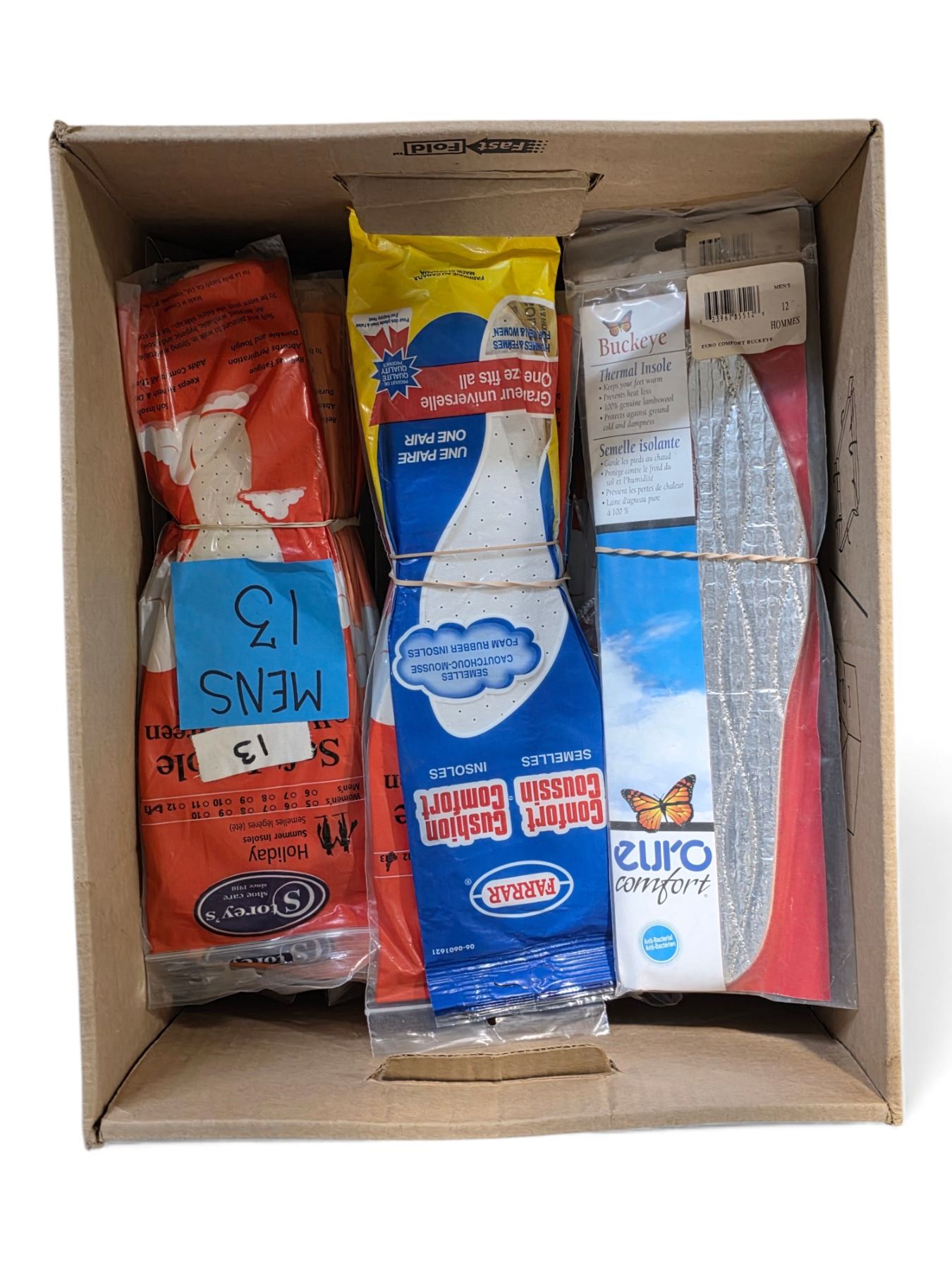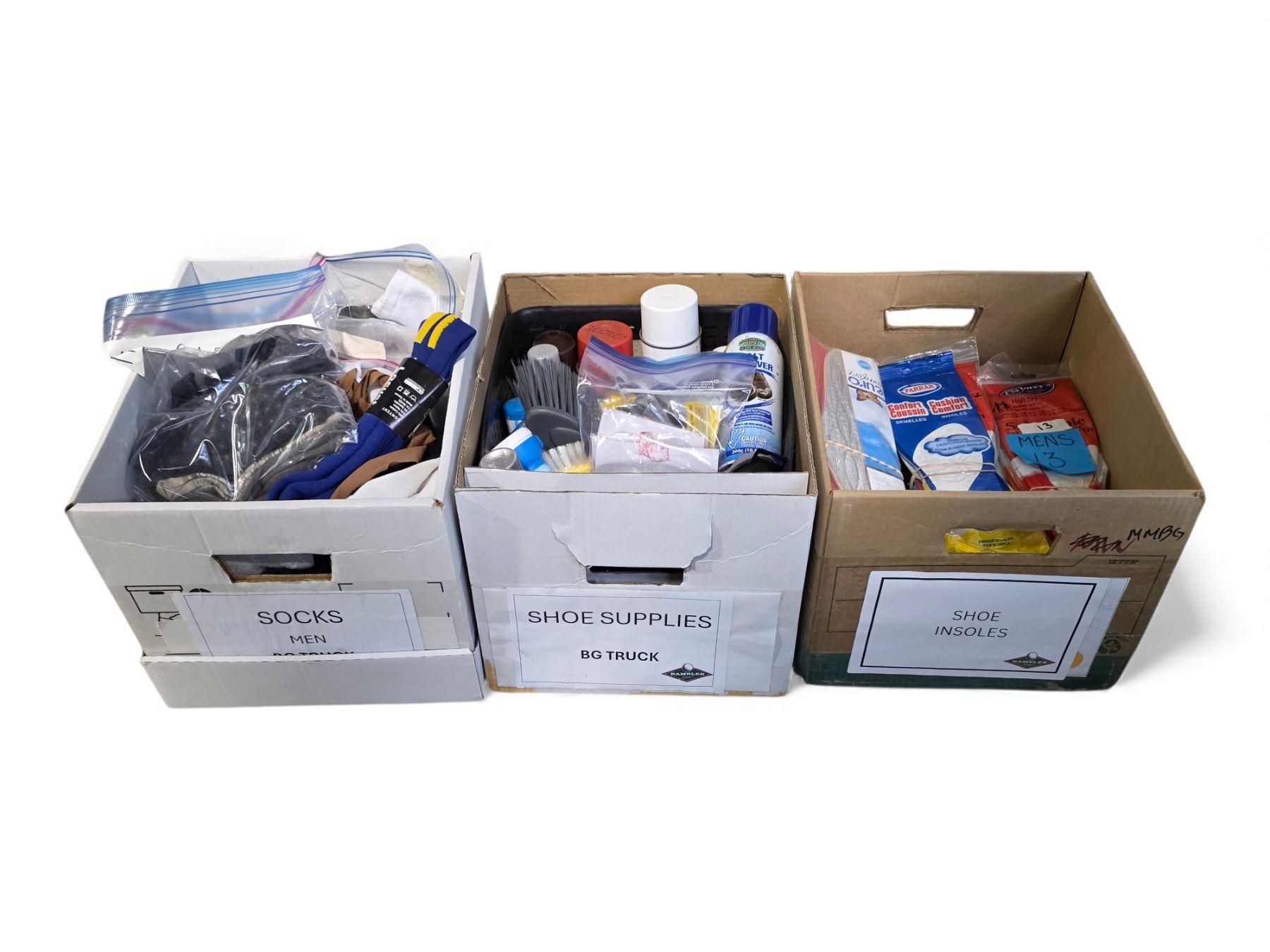3 Boxes of Footwear Supplies Includes Insoles, Socks, and Cleaning Supplies