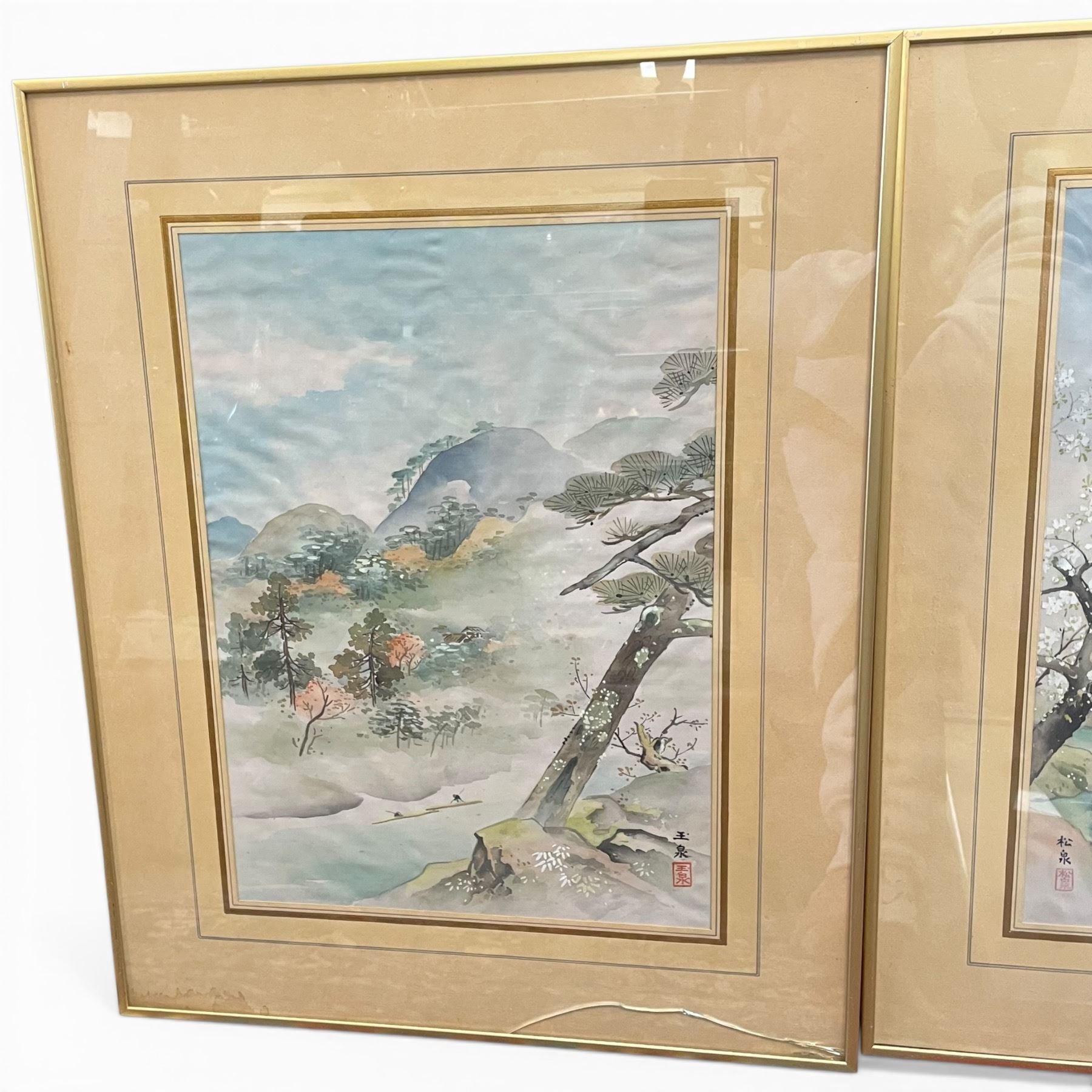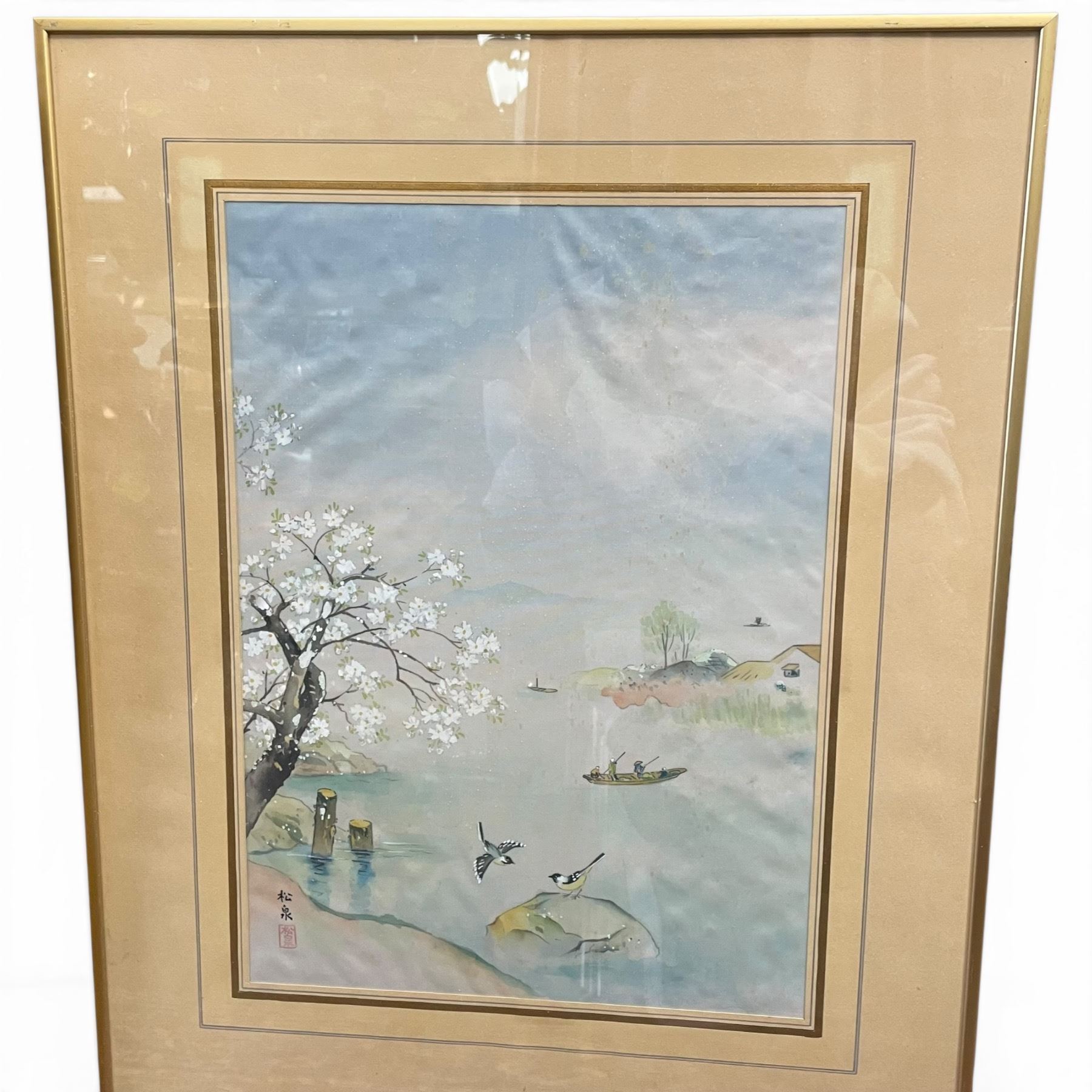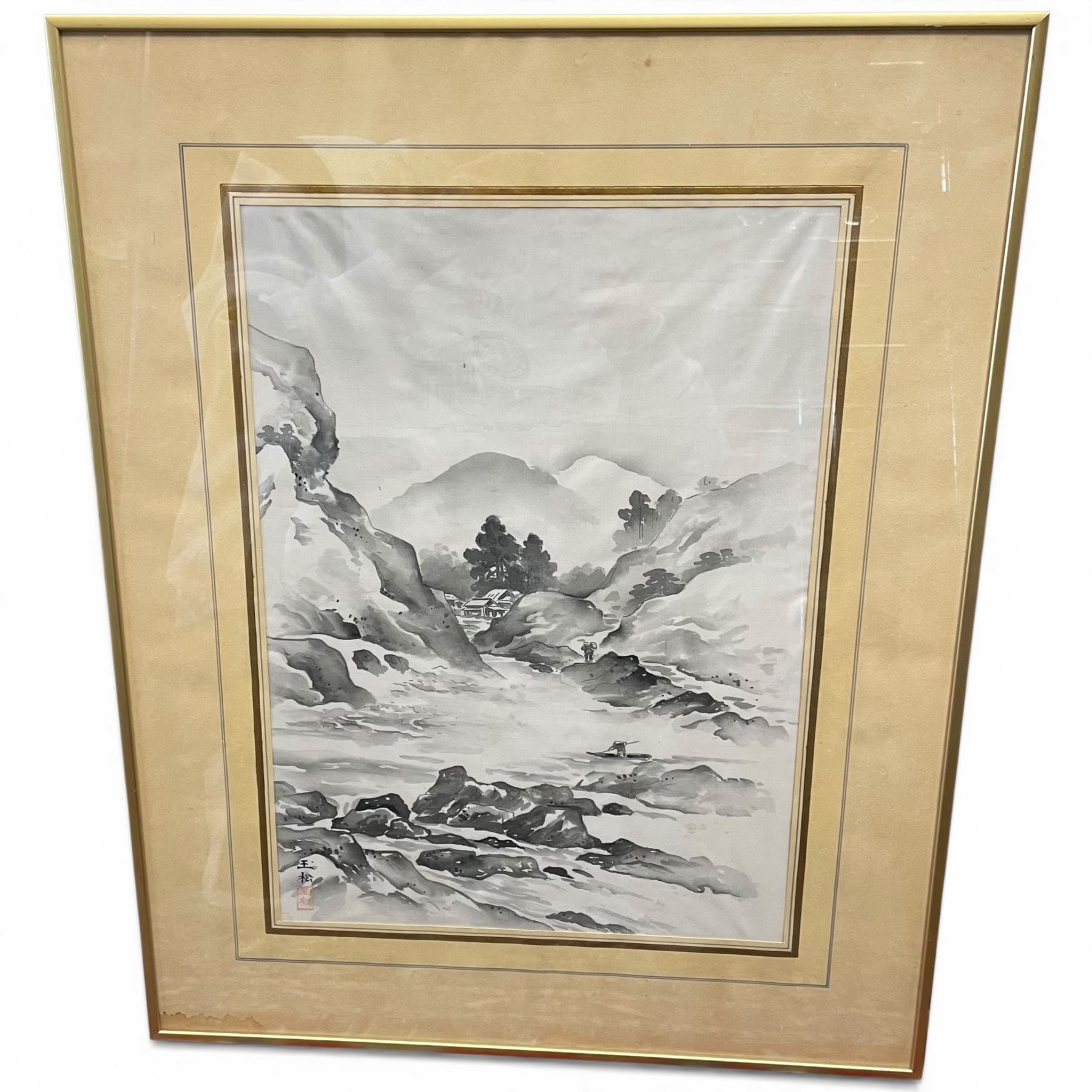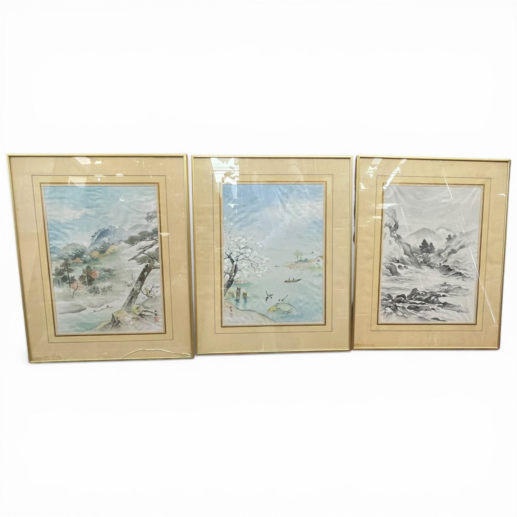 3 Framed Vintage Japanese Prints * 1 is Ink Wash Style (Framed dimensions: 18" x 22" * one glass is cracked)