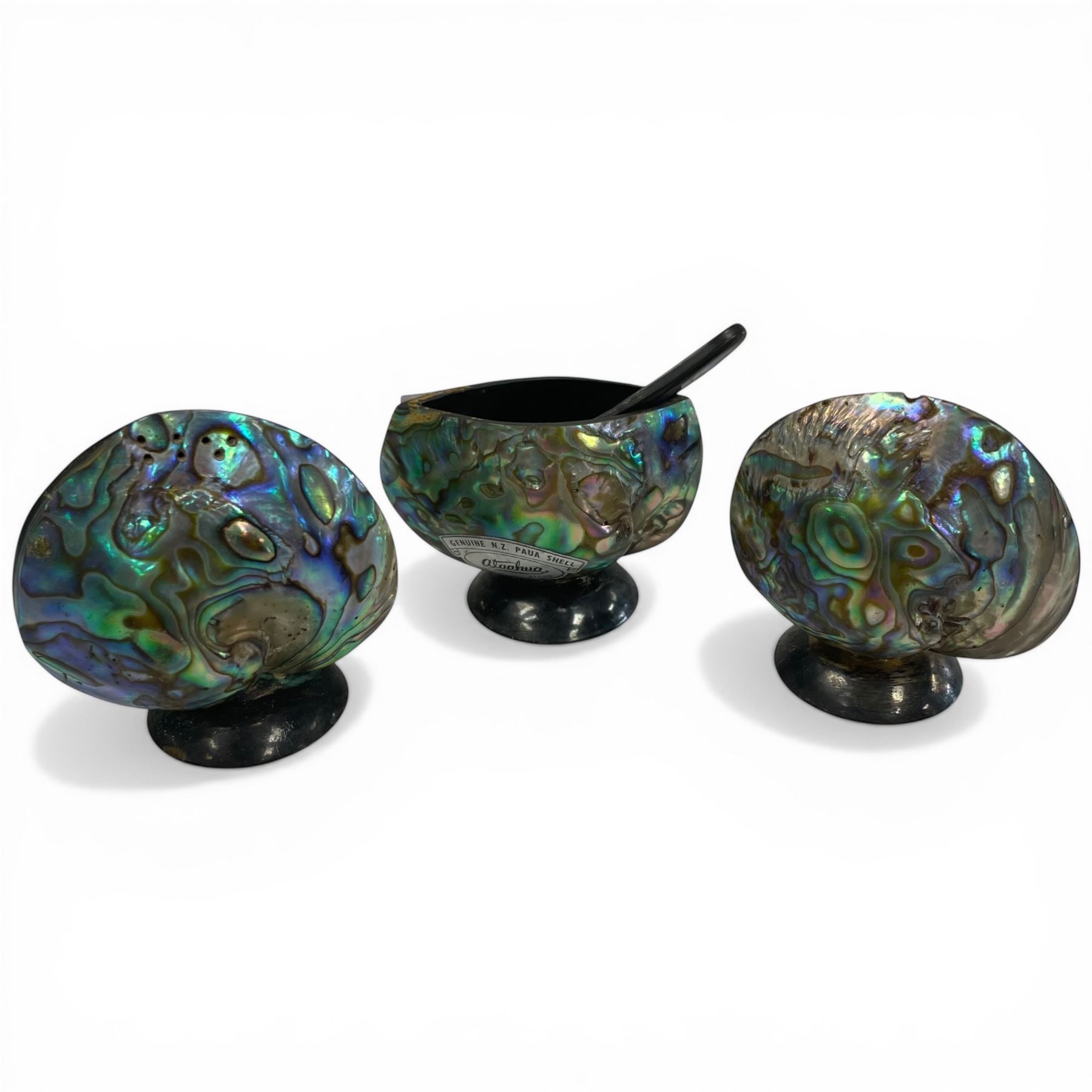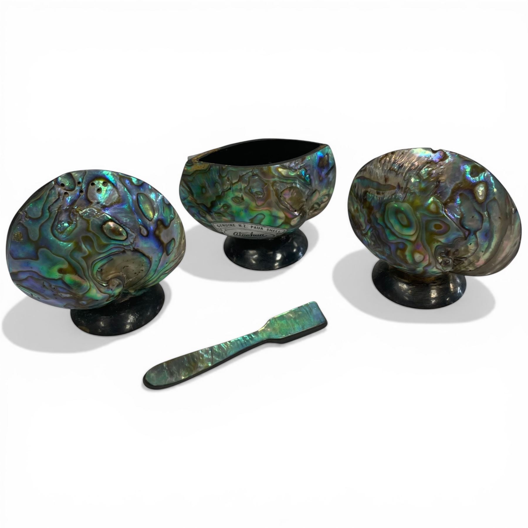 3 Genuine Ataahua New Zealand Paua Shell Tableware (Salt, Pepper & Salt Cellar * Largest is 2.5" s 2")