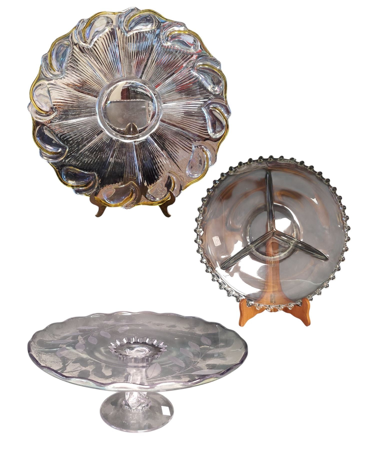Lot includes three glass serving trays: Czech boule tray with textured design, Federal style 16.5-Inch glass platter, and pedestal cake tray with purple tint. All items are as pictured.