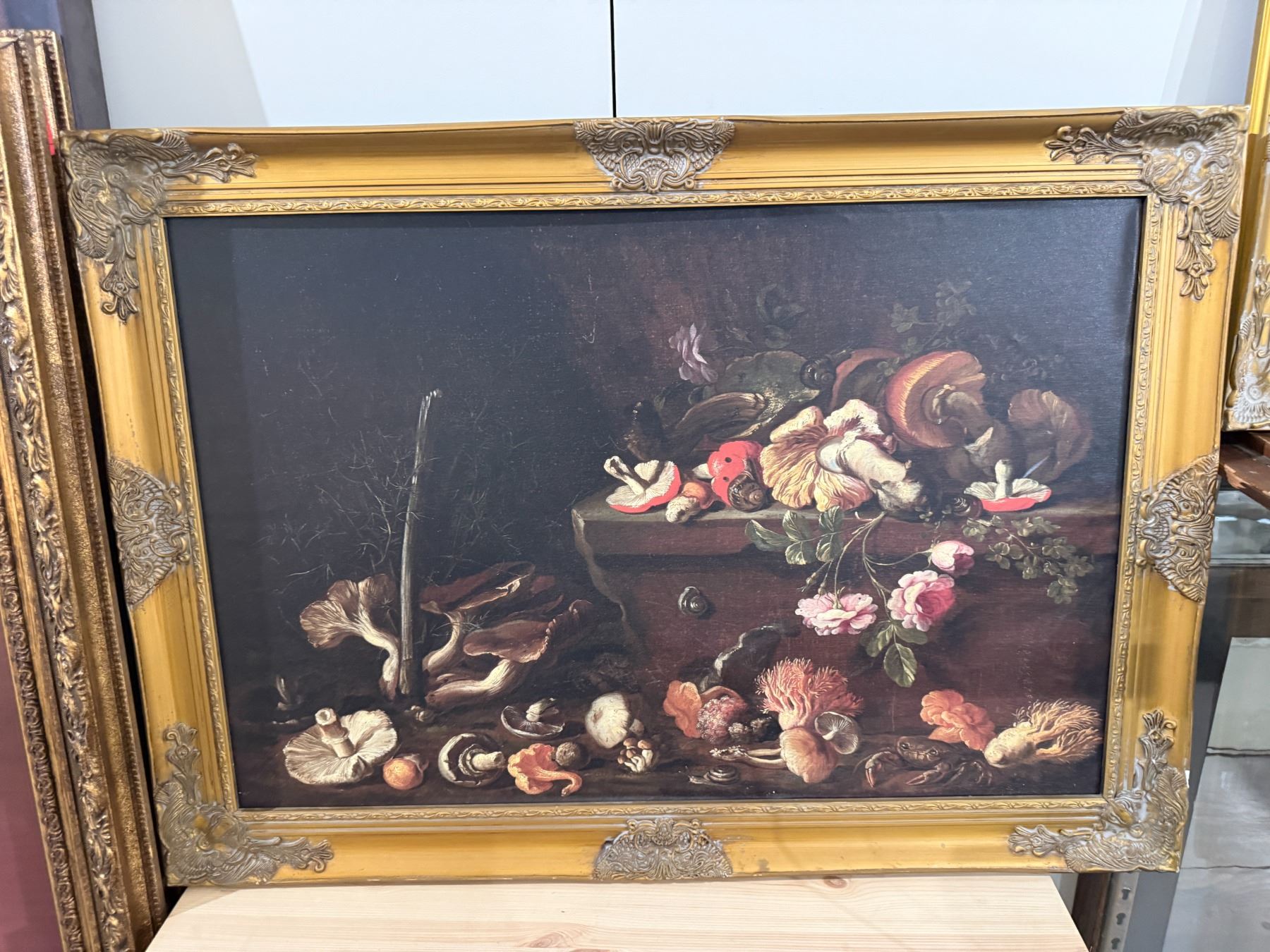 3 Matching Vintage Picture Frames * (Tintore "Still Life with Mushrooms & Portrait are reproductions) Largest frame is 30" x 42")