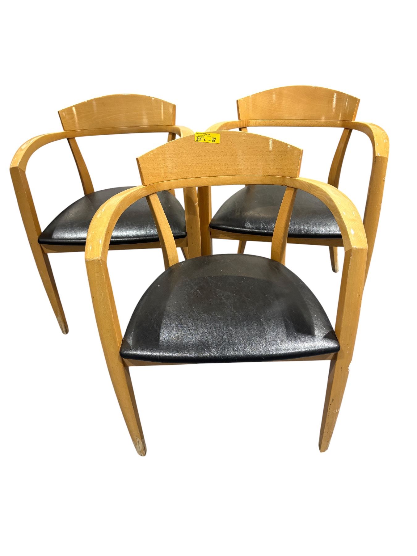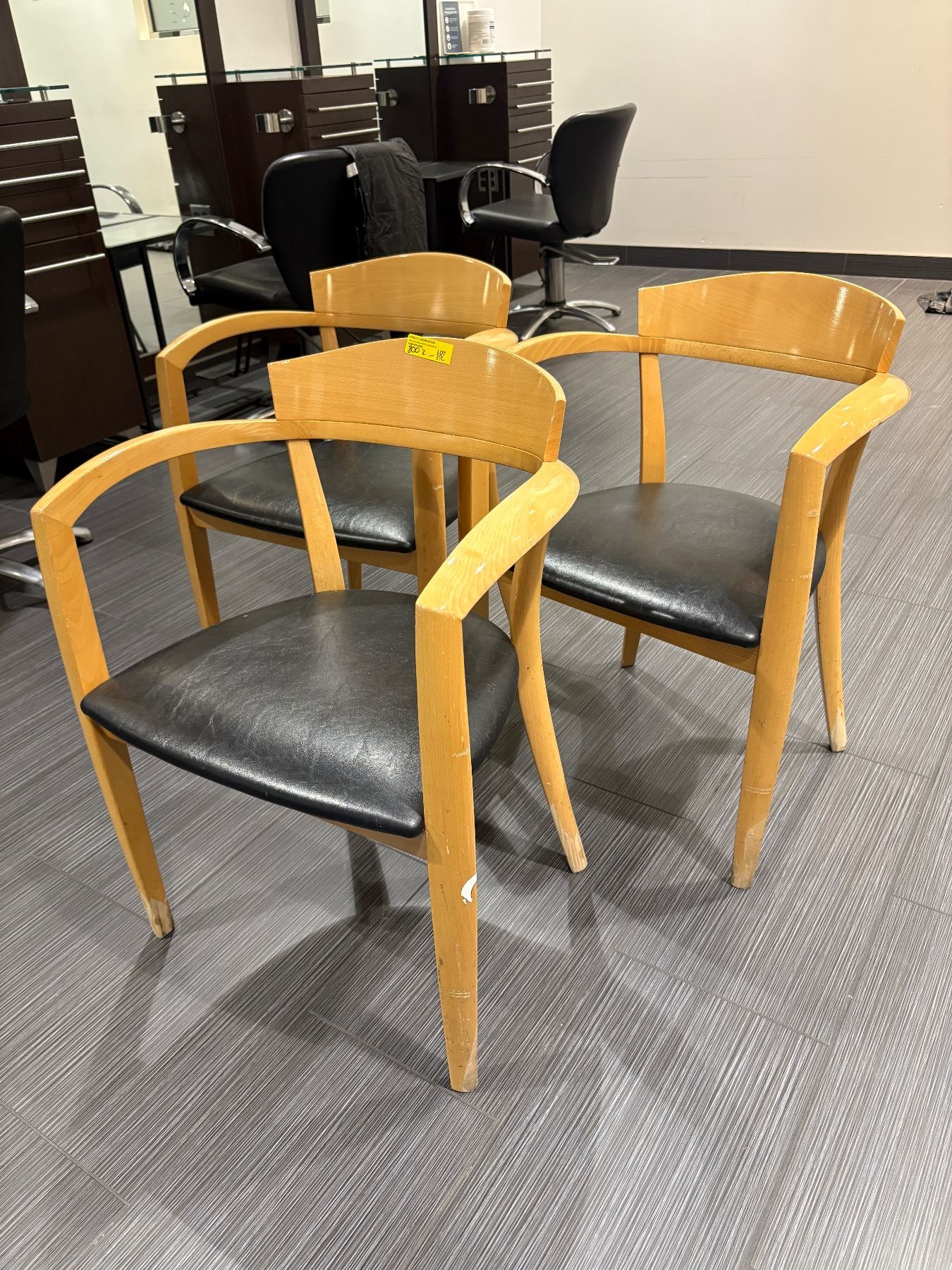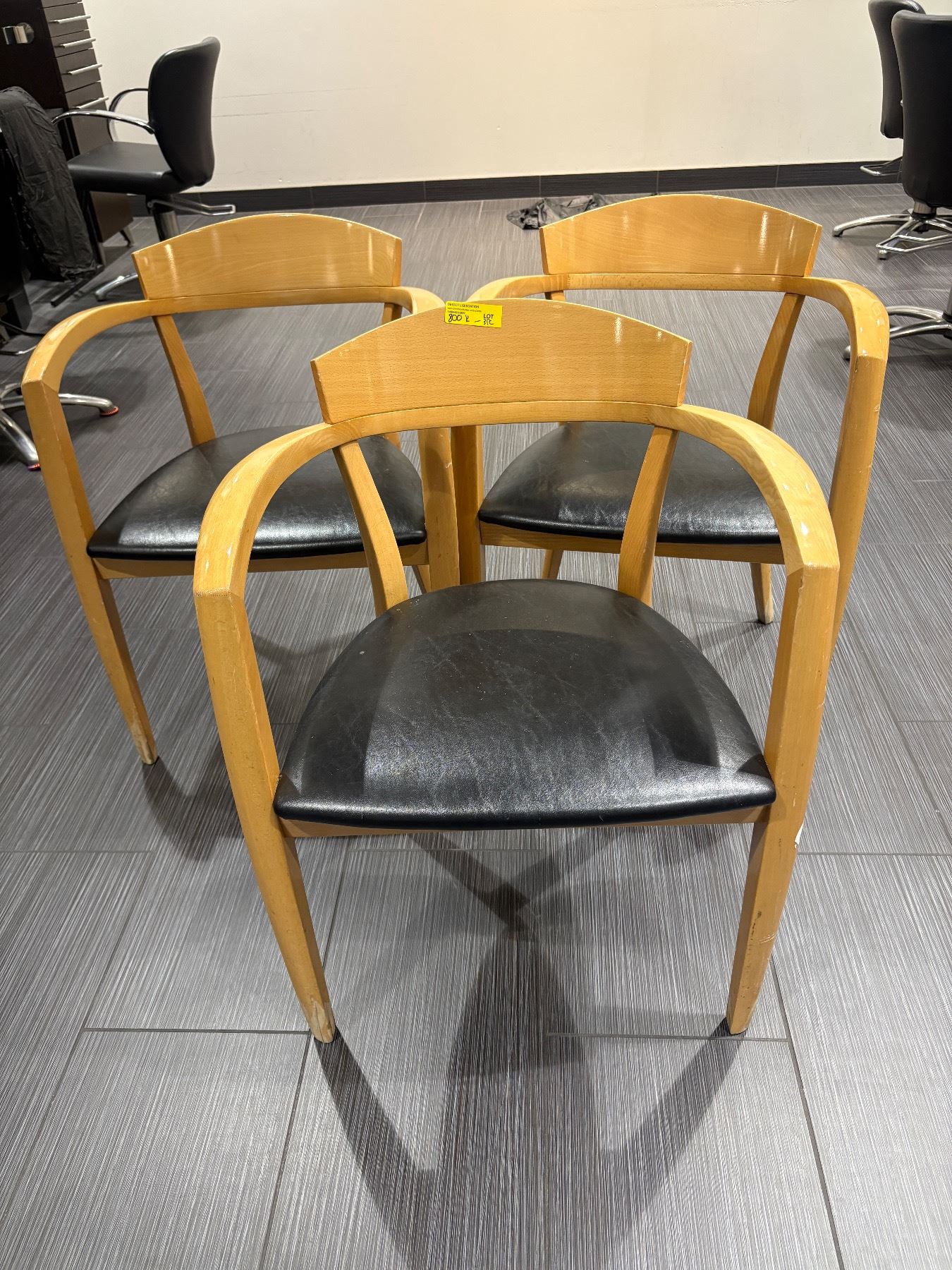 3 Mid-Century Style Wood Salon Waiting Area Chairs - Black Vinyl Seats
